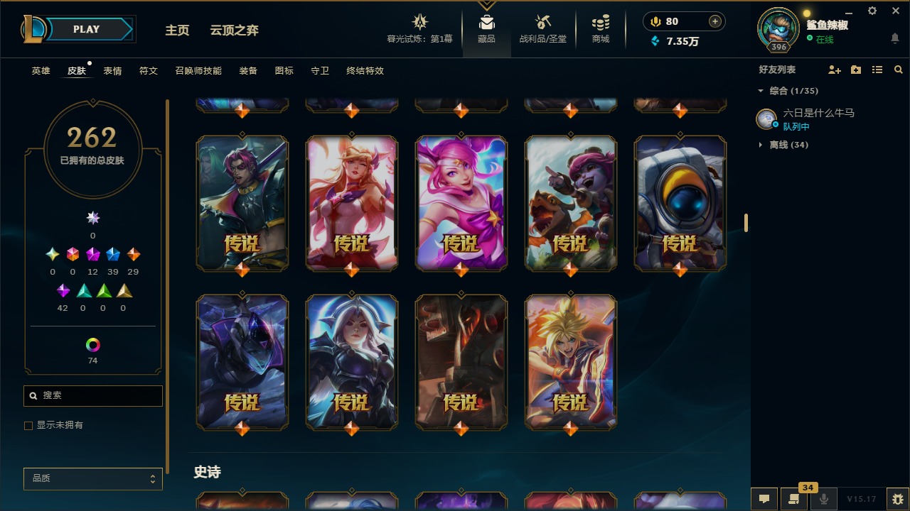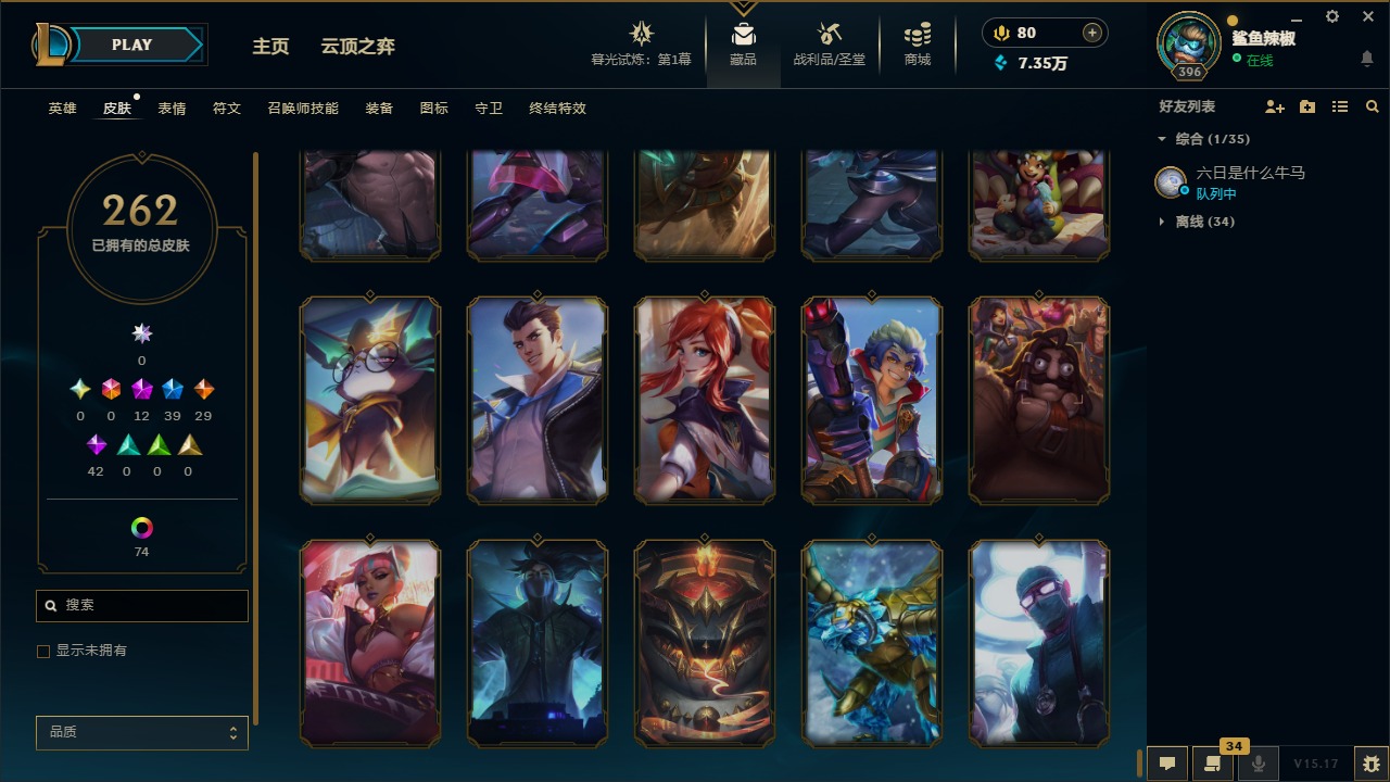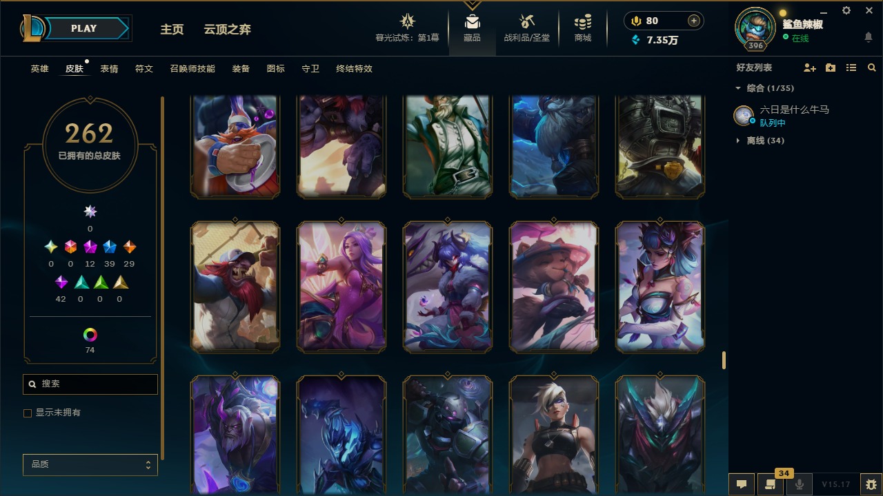 [11707614]12神话 39限定 29传说 42史诗 262皮肤 113炫彩 171英雄 可二次 可修改实名 优质装备:至臻 腥红之月 亚托克斯,至臻 魅惑女巫 厄运小姐,至臻 K/DA 卡莎,至臻 K/DA 伊芙琳,至臻 神凰行者 烈羽焰凰 霞,至臻 西部魔影 泰隆,至臻 青花瓷 丽桑卓 至臻:水晶掠夺者 卡兹克 海克斯:海克斯 玛尔扎哈 限定:双城之战2 范德尔 沃里克,玉剑传说 舞龙卫 情人节限定:甜心宝贝 娑娜 赛季限定皮:胜利之运 崔斯特,胜利剑圣 易,胜利女神 娑娜,胜利巨口 克格莫 冠军限定系列:S1FNC 酒桶,S5 SKT T1 阿利斯塔,S7 SSG 纳尔,S8 IG 卡密尔,S12 DRX 茂凯 冰雪节限定:“主人不要我了” 阿木木,冰封王子 蒙多,寒冬精灵 璐璐,魄罗骑士 瑟庄妮,幸福女神 乐芙兰,雪默丁格,北极星圣贤 基兰,北极星猎人 斯维因 泳池派对:海之歌 永恩 万圣节限定:鬼影森森 茂凯,伯爵 卡萨丁,大魔法锅 布里茨,鬼影重重 魔腾,古拉伯爵 克烈,魅惑女巫 波比,魅惑女巫 悠米,南瓜头 费德提克,死亡誓约 维克托,无头骑士 人马