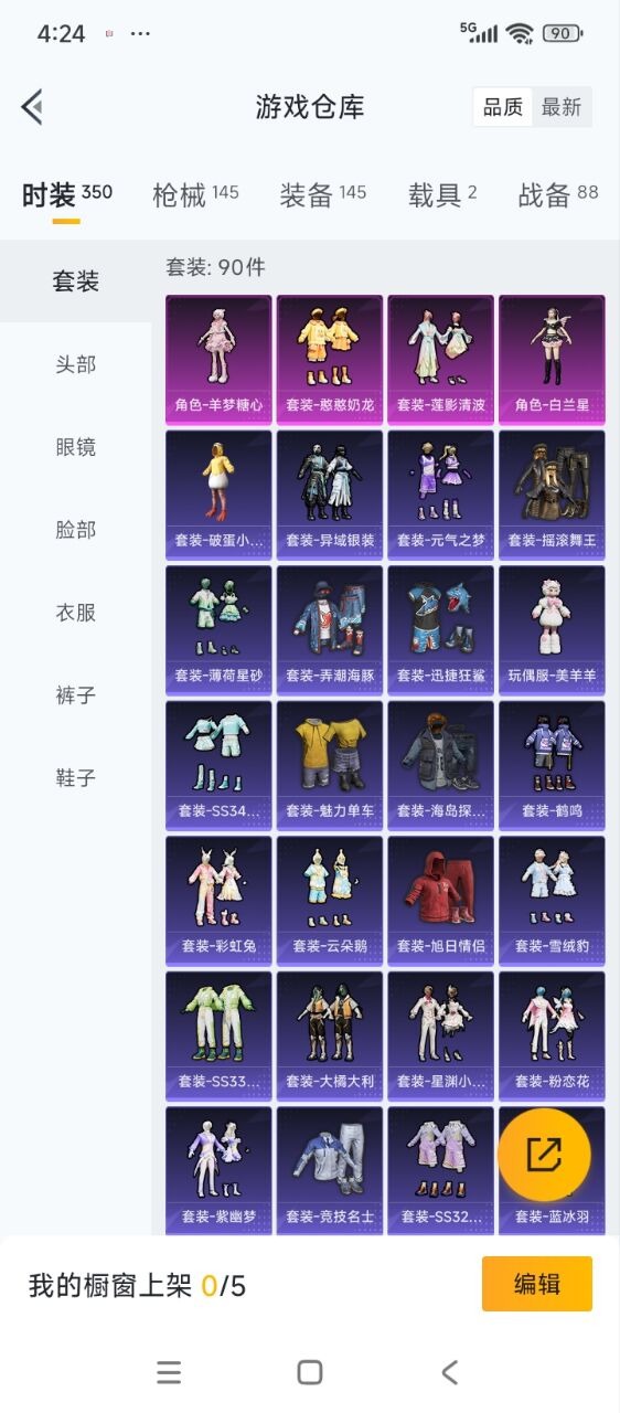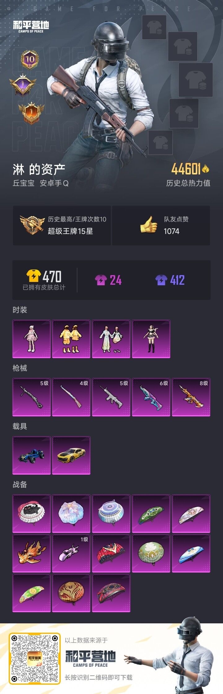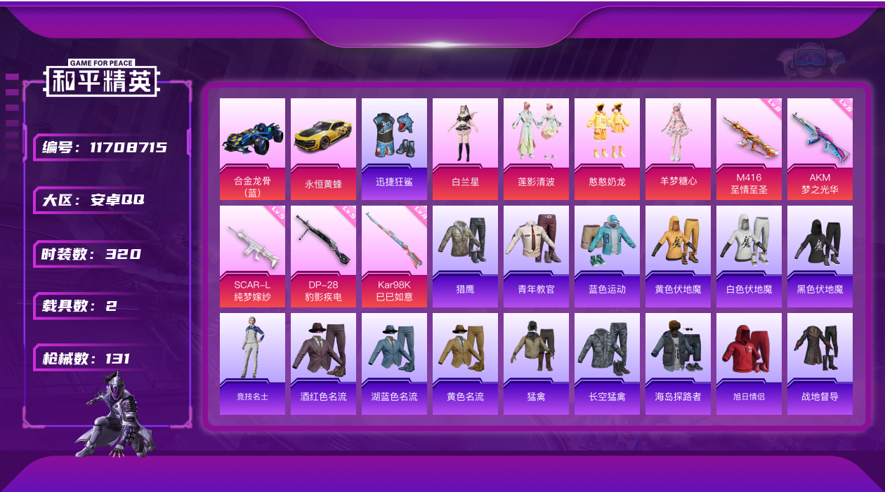 [11708715]4粉装 5特效枪 2载具 10印记 可二次 可修改实名 优质装备:合金龙骨(蓝),永恒黄蜂,AKM梦之光华,M416至情至圣,SCAR-L纯梦嫁纱,八级M416-至情至圣,羊梦糖心,Kar98K-巳巳如意 热门装扮:白兰星,莲影清波,憨憨奶龙,迅捷狂鲨 稀有枪皮:DP-28-豹影疾电 六级特效枪:六级AKM-梦之光华 五级特效枪:五级DP-28-豹影疾电,五级SCAR-L-纯梦嫁纱 四级特效枪:四级Kar98K-巳巳如意 紫色装扮:SS22特训,香榭午后,SS21特训,SS31特训套装,旭日情侣,云朵鹅,彩虹兔,雪绒豹,SS33特训套装,青涩时光,SS20特训,鹤发童颜,星梦畅游,SS19特训,吉莉礼服,SS17特训,SS18特训,酒红色名流,长空猛禽,霓虹街区,青年教官,缤纷果语,蓝色运动,虎虎生威吉莉,魅力单车,鹤鸣,麻辣教官,黄色伏地魔,黄色名流,黑色伏地魔,龙的传人,龟仙人,海岛探路者,深蓝色名流,幻影武者,夏日音浪,幻世战舞者,战地督导,探宝勇士,湖蓝色名流,白色伏地魔,破晓战魂,破蛋小黄鸡,空岛之星,空投萌叽,炫蓝之夏,牛气满满,猛禽,猎鹰,SS29特训,白光莹,SS28特训,异域银装,鱼渊荷华,玉兔迎春,燕燕于飞,竞技名士,深海梦境,惊鸿侠骨,SS25特训,锦衣飞扬,粉红小猪,SS27特训,日照花林,SS26特训,春光漫游,快闪甜心,大橘大利,星渊小夜曲,粉恋花,蓝冰羽,紫幽梦,SS32特训服(SS32特训套装),绯格组合,糖霜甜心,恋语绒绒,摇滚舞王,弄潮海豚,光之冒险 优质战备:精灵梦叶罗丽降落伞,时空协奏降落伞,忍者神龟降落伞,万古烈焰降落伞,闲梦青缨降落伞,超新星飞行器,星之彼岸降落伞,祥瑞锦鲤飞行器,绯穹魔姬降落伞,荧海星豚降落伞,未来歌姬降落伞,齐天大圣降落伞,碧影闪光降落伞