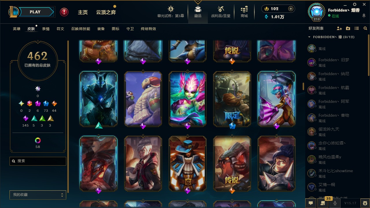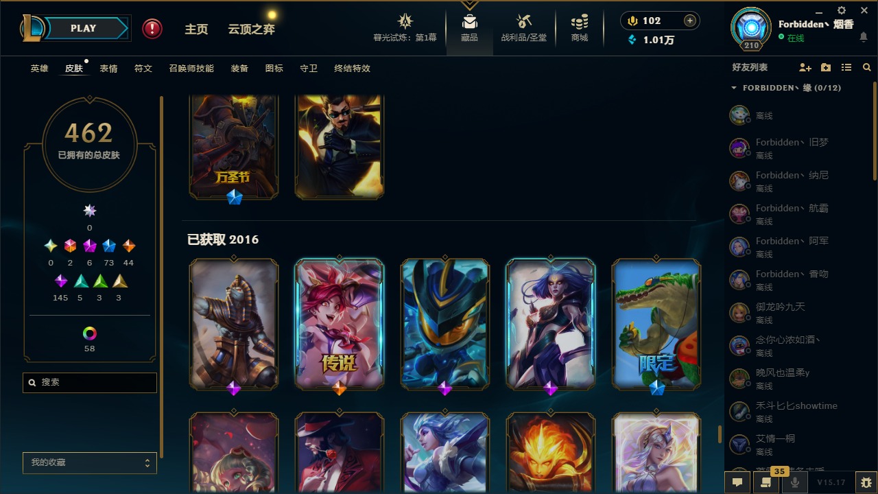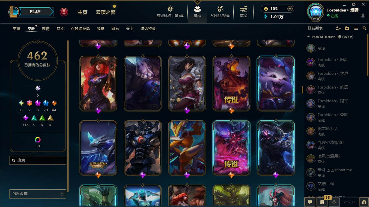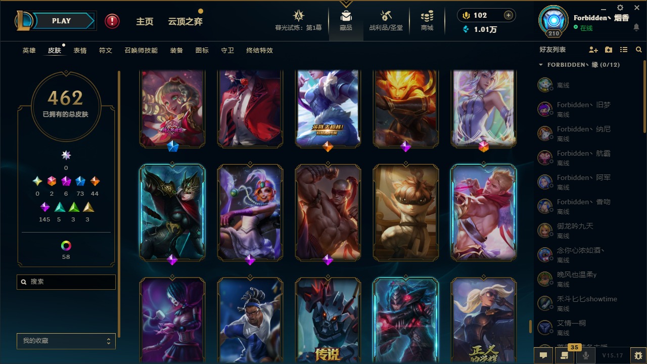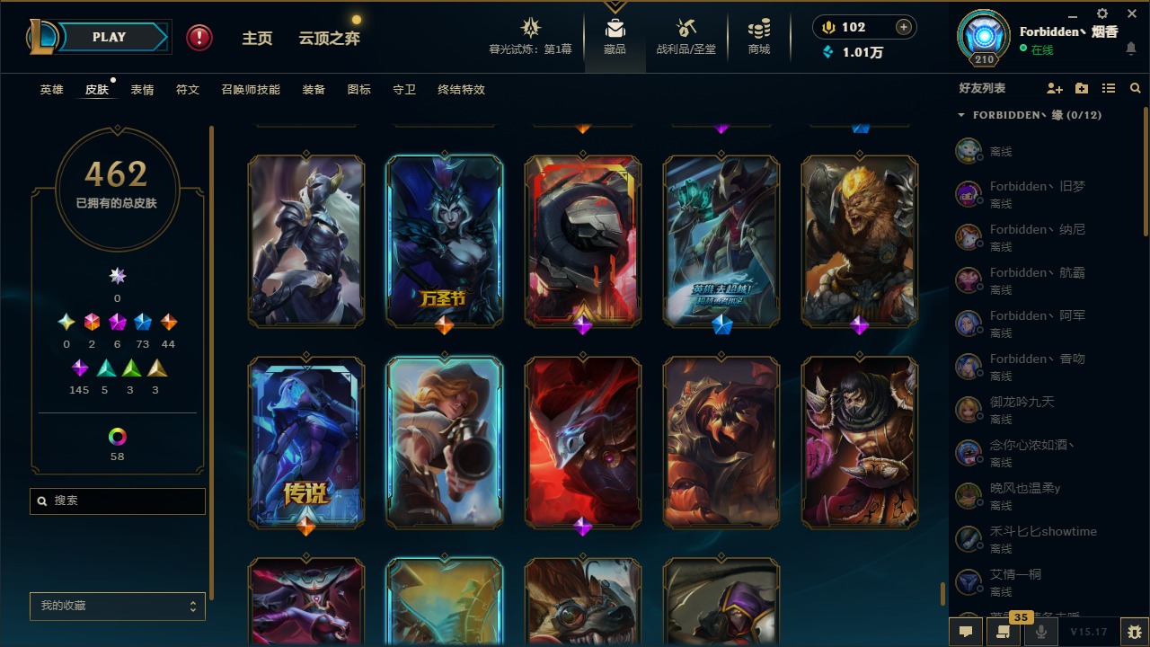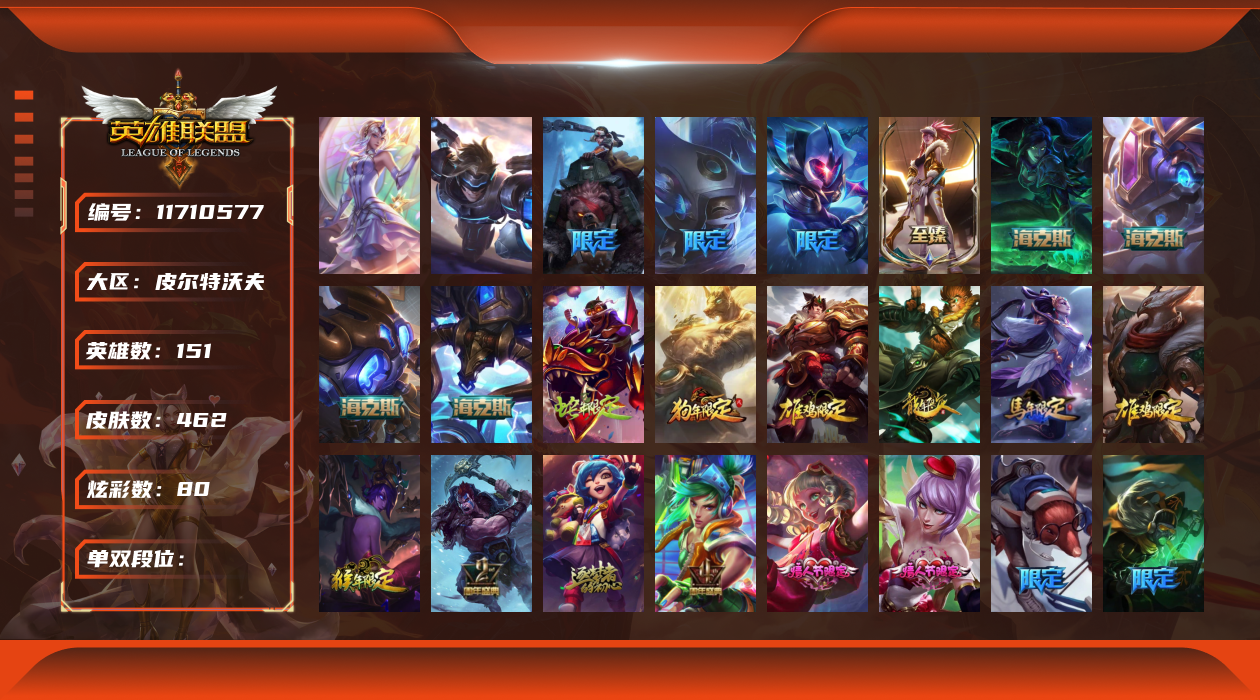 [11710577]2终极 6神话 73限定 44传说 145史诗 462皮肤 80炫彩 151英雄 可二次 可修改实名 优质装备:至臻 K/DA 阿卡丽,斩星魔剑,防爆天使 凯尔,暗影 沃里克,地底世界 崔斯特,钢铁之翼 凤凰,冠军典狱长 锤石,冠军之血 希瓦娜,冠军之隐 劫,鸡里奥,惊悚派对 阿木木,警用试作体K-9 内瑟斯,克格汪 克格莫,蓝色忧郁 崔斯特,密林猎手 提莫,女猎手 希维尔,送披萨的小姐姐 希维尔,野兽猎人 德莱文,御魔星矢 寒冰,大元素使,未来战士,冰霜之刃 艾瑞莉娅 炫金,冰雪游神 巴德 炫金,冰雪风暴 希维尔 炫金,冠军之隐 劫 凯旋圣装,红莲之刃 锐雯 海克斯:摄魂 薇恩,海克斯 阿利斯塔,海克斯 克格莫,海克斯 阿木木 限定:战熊骑士,创星之灵 璐璐 情人节限定:觅心之翼 奎因,甜心宝贝 安妮 冠军限定系列:S1FNC 酒桶,S1FNC 迦娜,S1FNC 卡尔萨斯,S2 暗杀星 发条,S2 暗杀星 蒙多,S2 暗杀星 慎,S2 暗杀星 伊泽瑞尔,S3 SKT T1 贾克斯,S4 SSW 泰隆,S4 SSW 图奇,S4 SSW 炼金,S6 SKT T1 艾克 冰雪节限定:“主人不要我了” 阿木木,冰雪节 格雷福斯,冰雪节 马尔扎哈,冰雪节 炼金,冬季仙境 发条,冬季仙境 卡尔玛,胡桃夹子 小丑,平安夜女神 娑娜,魄罗骑士 瑟庄妮,圣诞开心鬼 提莫,圣诞精灵 崔丝塔娜,圣诞狂欢 时光,圣诞狂欢 努努,圣诞老人 酒桶,圣诞糖果棒 厄运小姐,圣诞玩偶 波比,圣诞驯鹿 克格莫,冰雪节 茂凯,邪恶圣诞老人 维迦,幸福女神 乐芙兰,雪默丁格 泳池派对:泳池派对 吉格斯,泳池派对 雷克顿,泳池派对 李青,泳池派对 塔里克 万圣节限定:鬼影森森 茂凯,鬼影重重 魔腾,海贼 瑞兹,魅惑女巫 奈德丽,南瓜头 费德提克,无头骑士 人马 年限:龙年 孙悟空,蛇年 库奇,马年 黛安娜,猴年 莫甘娜,鸡年 阿兹尔,鸡年 盖伦,狗年 内瑟斯 周年:2周年 德莱厄斯,4周年 锐雯,10周年 安妮