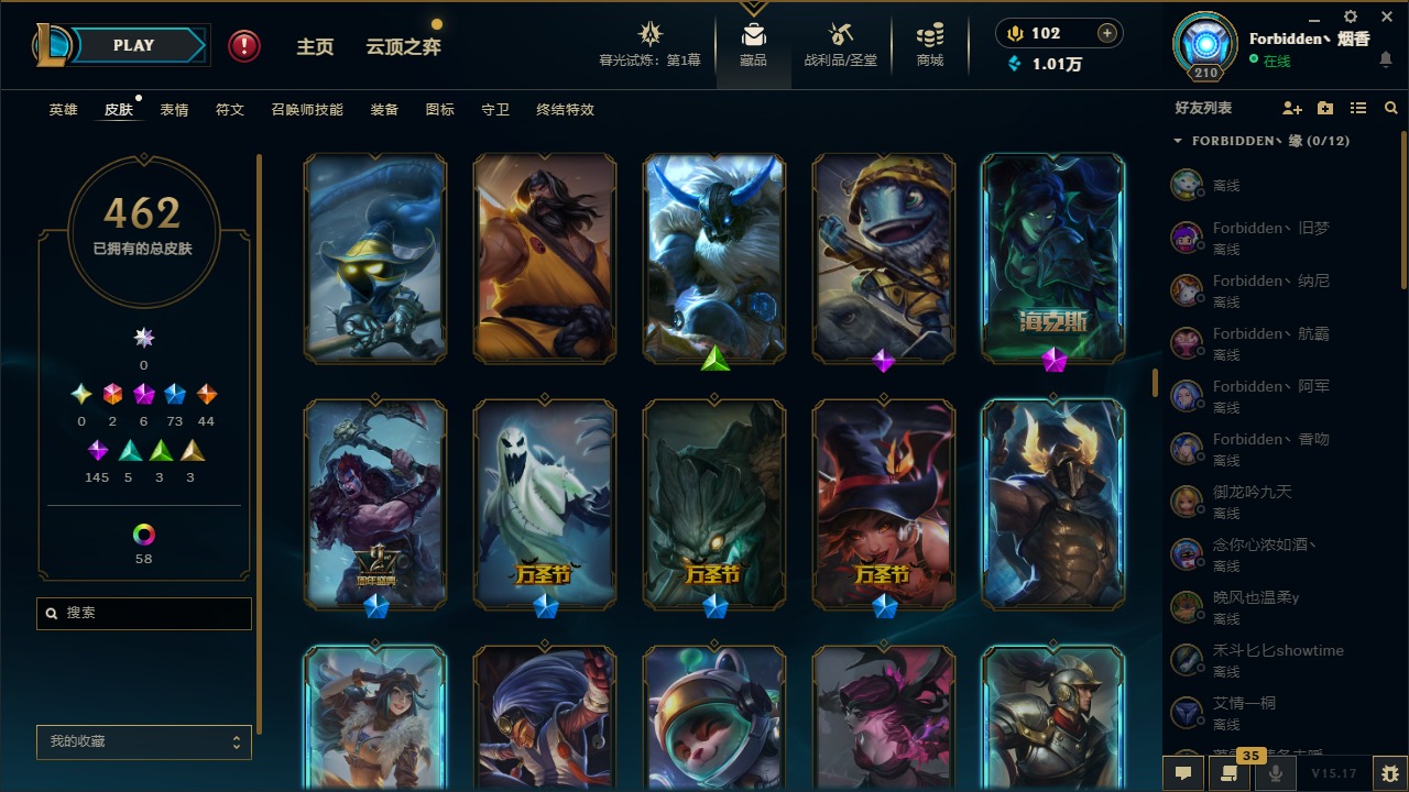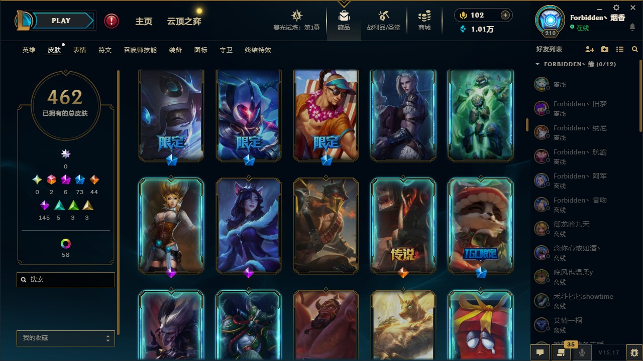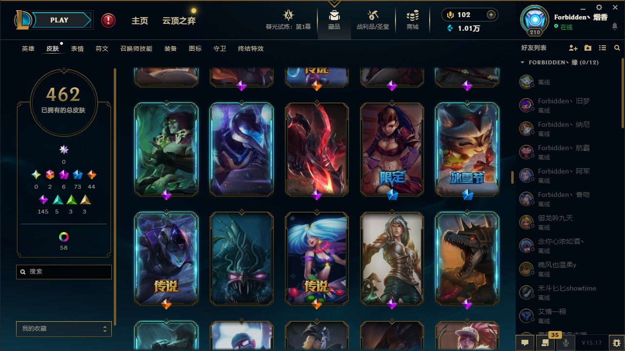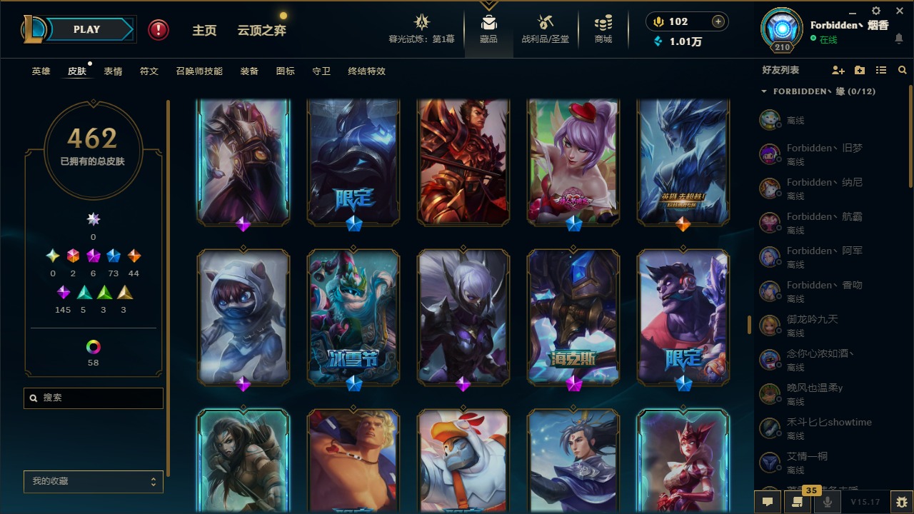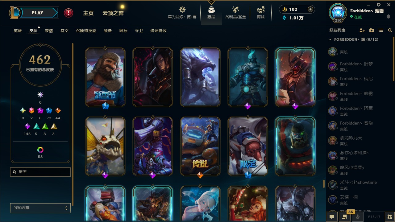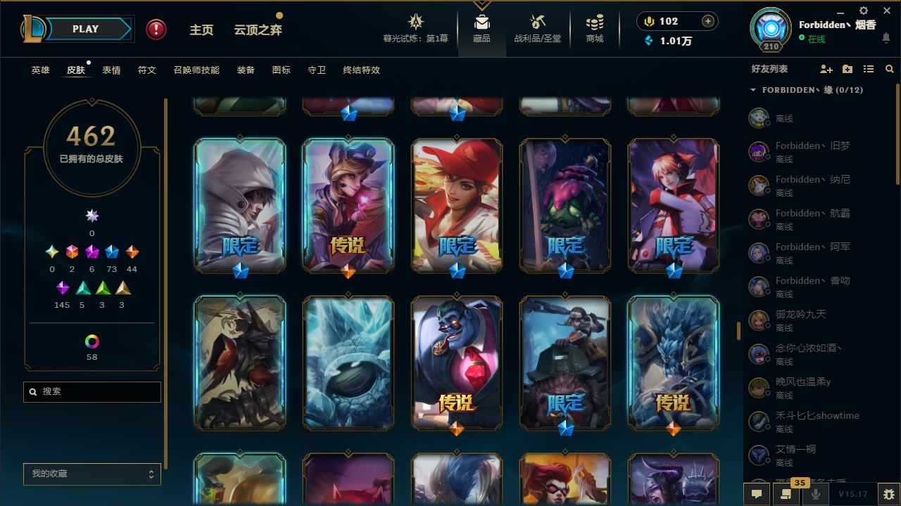 [11710577]2终极 6神话 73限定 44传说 145史诗 462皮肤 80炫彩 151英雄 可二次 可修改实名 优质装备:至臻 K/DA 阿卡丽,斩星魔剑,防爆天使 凯尔,暗影 沃里克,地底世界 崔斯特,钢铁之翼 凤凰,冠军典狱长 锤石,冠军之血 希瓦娜,冠军之隐 劫,鸡里奥,惊悚派对 阿木木,警用试作体K-9 内瑟斯,克格汪 克格莫,蓝色忧郁 崔斯特,密林猎手 提莫,女猎手 希维尔,送披萨的小姐姐 希维尔,野兽猎人 德莱文,御魔星矢 寒冰,大元素使,未来战士,冰霜之刃 艾瑞莉娅 炫金,冰雪游神 巴德 炫金,冰雪风暴 希维尔 炫金,冠军之隐 劫 凯旋圣装,红莲之刃 锐雯 海克斯:摄魂 薇恩,海克斯 阿利斯塔,海克斯 克格莫,海克斯 阿木木 限定:战熊骑士,创星之灵 璐璐 情人节限定:觅心之翼 奎因,甜心宝贝 安妮 冠军限定系列:S1FNC 酒桶,S1FNC 迦娜,S1FNC 卡尔萨斯,S2 暗杀星 发条,S2 暗杀星 蒙多,S2 暗杀星 慎,S2 暗杀星 伊泽瑞尔,S3 SKT T1 贾克斯,S4 SSW 泰隆,S4 SSW 图奇,S4 SSW 炼金,S6 SKT T1 艾克 冰雪节限定:“主人不要我了” 阿木木,冰雪节 格雷福斯,冰雪节 马尔扎哈,冰雪节 炼金,冬季仙境 发条,冬季仙境 卡尔玛,胡桃夹子 小丑,平安夜女神 娑娜,魄罗骑士 瑟庄妮,圣诞开心鬼 提莫,圣诞精灵 崔丝塔娜,圣诞狂欢 时光,圣诞狂欢 努努,圣诞老人 酒桶,圣诞糖果棒 厄运小姐,圣诞玩偶 波比,圣诞驯鹿 克格莫,冰雪节 茂凯,邪恶圣诞老人 维迦,幸福女神 乐芙兰,雪默丁格 泳池派对:泳池派对 吉格斯,泳池派对 雷克顿,泳池派对 李青,泳池派对 塔里克 万圣节限定:鬼影森森 茂凯,鬼影重重 魔腾,海贼 瑞兹,魅惑女巫 奈德丽,南瓜头 费德提克,无头骑士 人马 年限:龙年 孙悟空,蛇年 库奇,马年 黛安娜,猴年 莫甘娜,鸡年 阿兹尔,鸡年 盖伦,狗年 内瑟斯 周年:2周年 德莱厄斯,4周年 锐雯,10周年 安妮