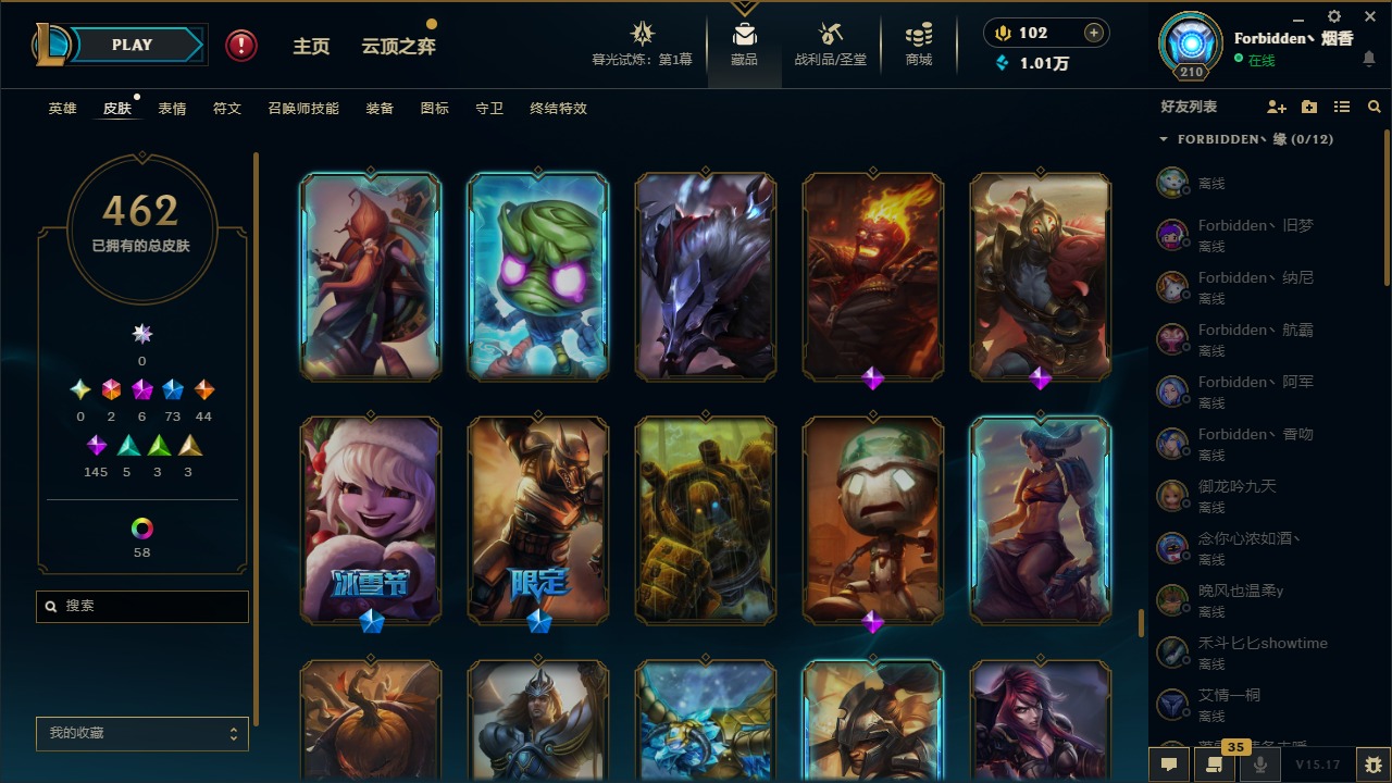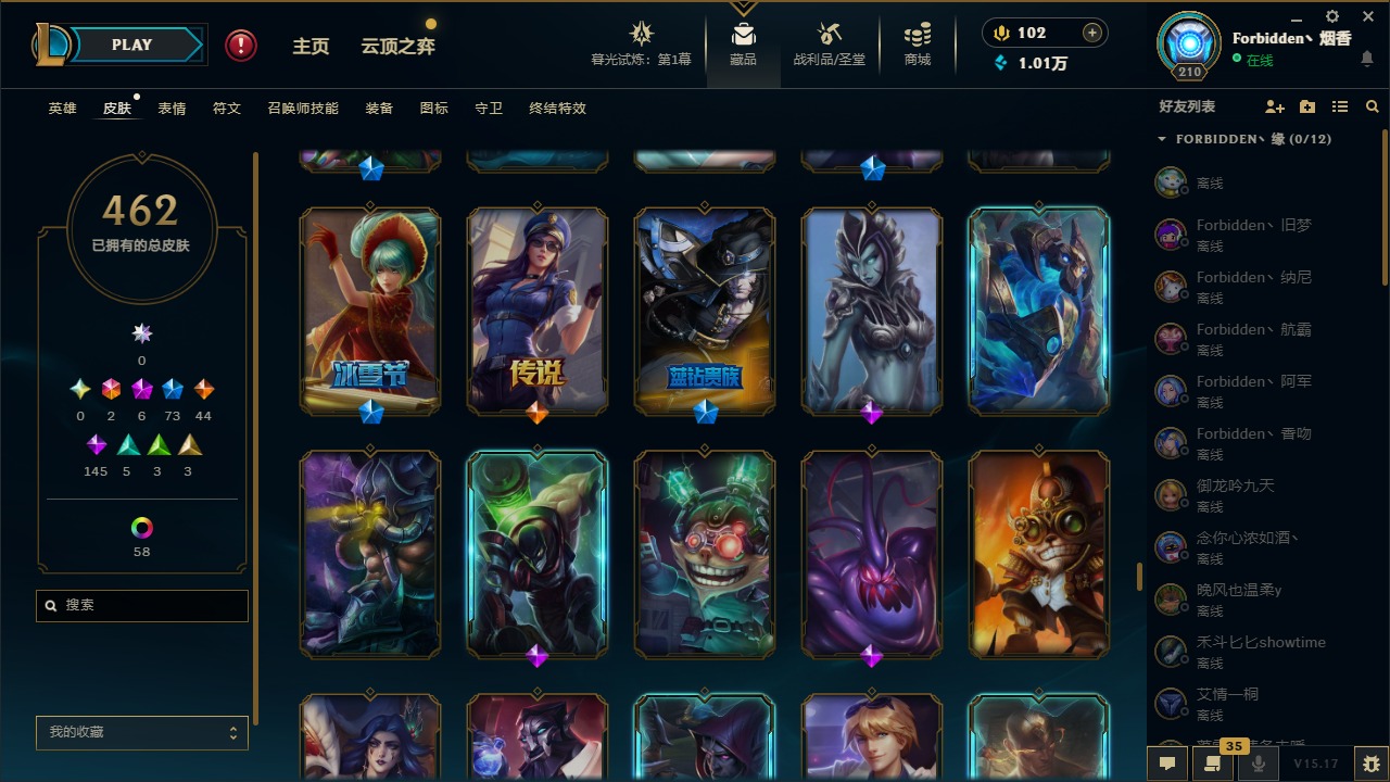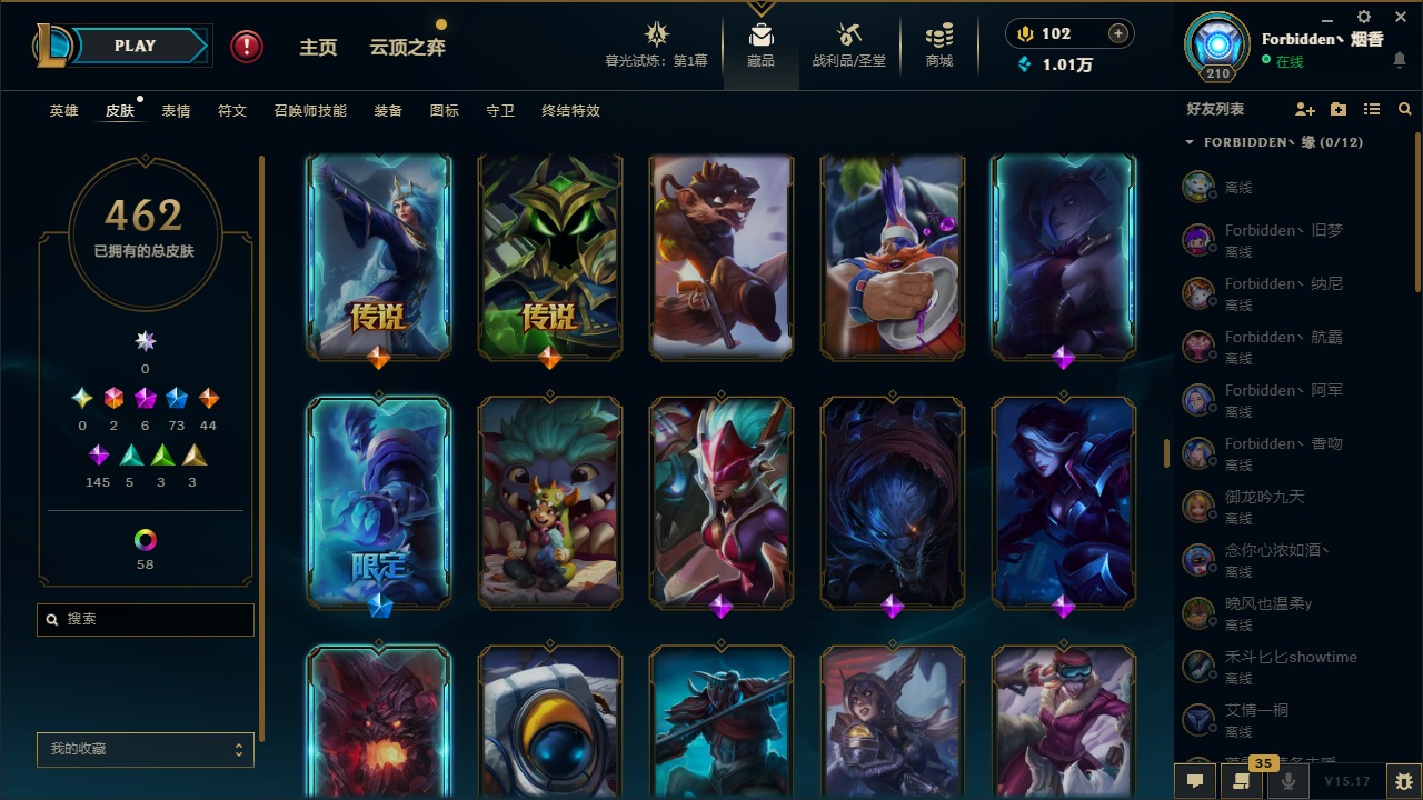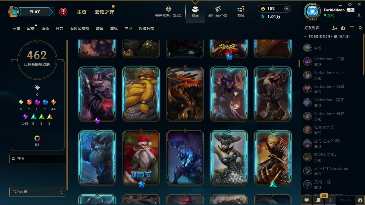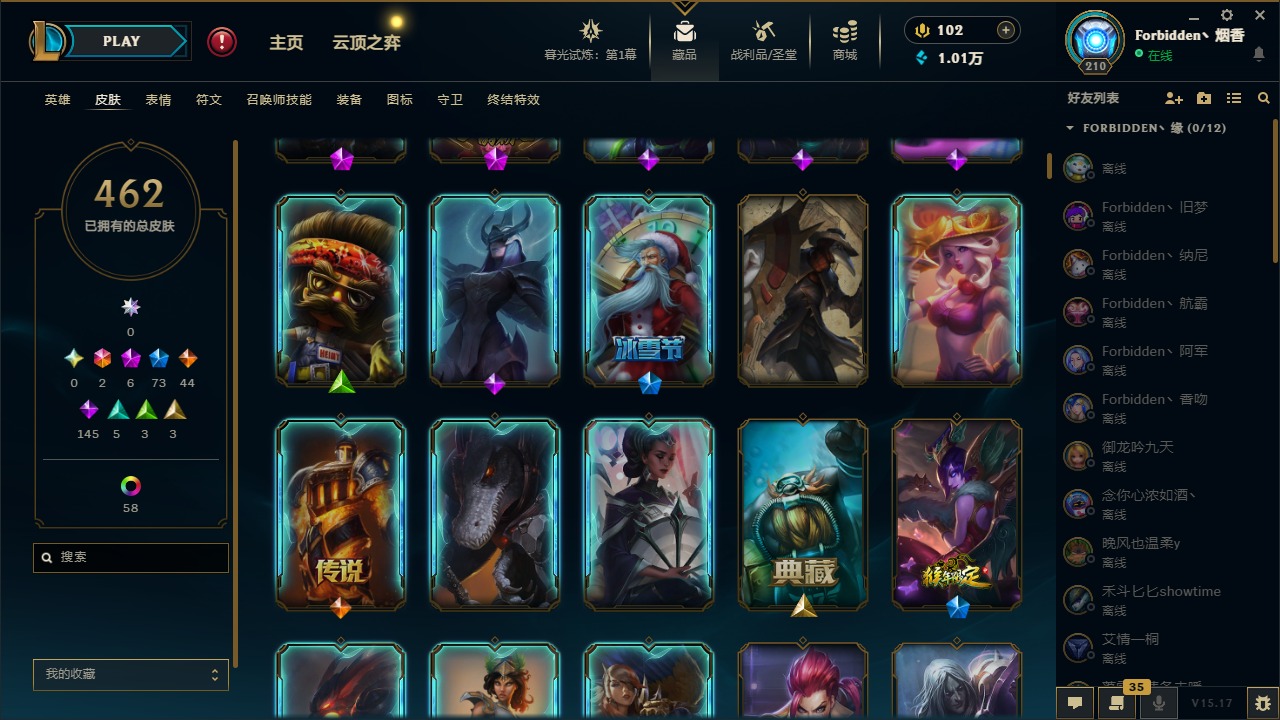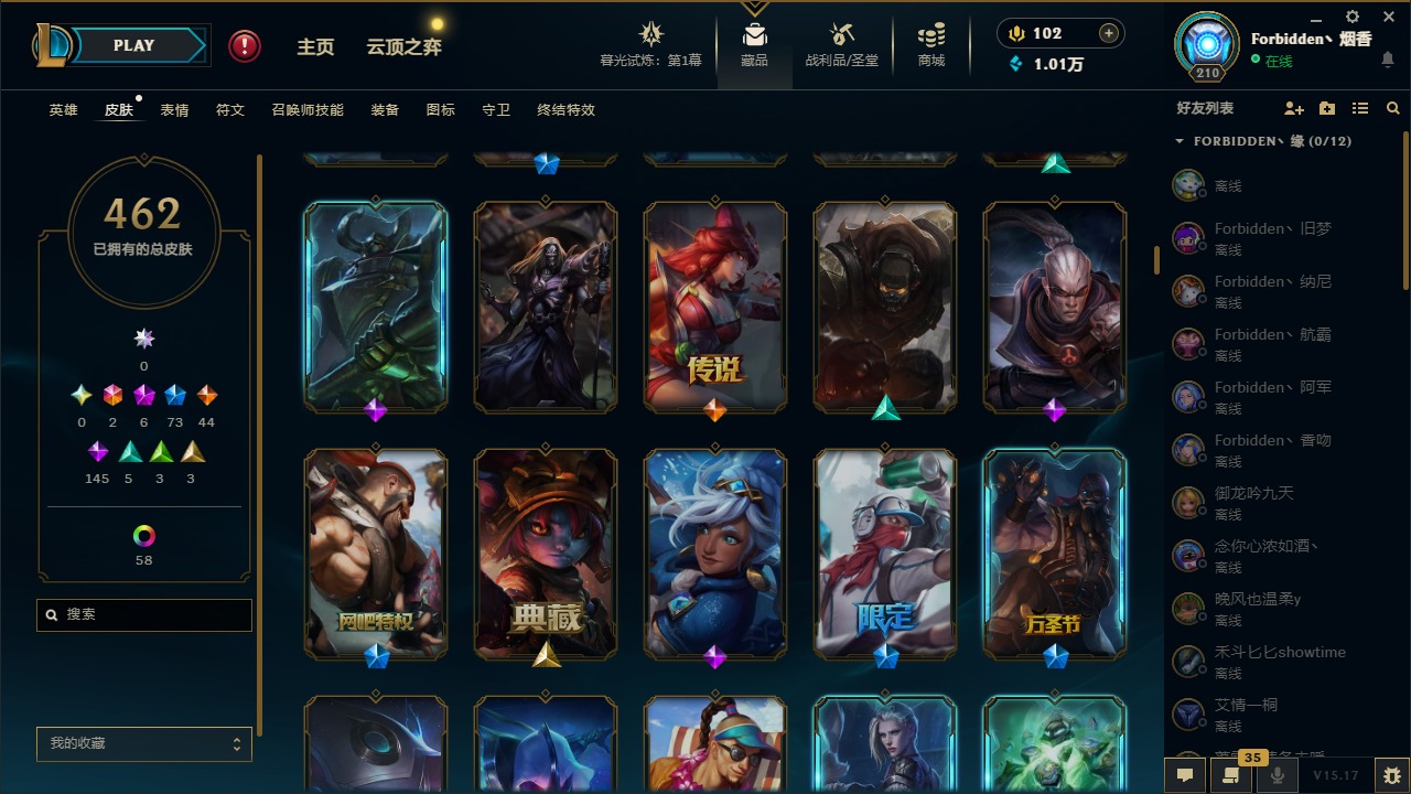 [11710577]2终极 6神话 73限定 44传说 145史诗 462皮肤 80炫彩 151英雄 可二次 可修改实名 优质装备:至臻 K/DA 阿卡丽,斩星魔剑,防爆天使 凯尔,暗影 沃里克,地底世界 崔斯特,钢铁之翼 凤凰,冠军典狱长 锤石,冠军之血 希瓦娜,冠军之隐 劫,鸡里奥,惊悚派对 阿木木,警用试作体K-9 内瑟斯,克格汪 克格莫,蓝色忧郁 崔斯特,密林猎手 提莫,女猎手 希维尔,送披萨的小姐姐 希维尔,野兽猎人 德莱文,御魔星矢 寒冰,大元素使,未来战士,冰霜之刃 艾瑞莉娅 炫金,冰雪游神 巴德 炫金,冰雪风暴 希维尔 炫金,冠军之隐 劫 凯旋圣装,红莲之刃 锐雯 海克斯:摄魂 薇恩,海克斯 阿利斯塔,海克斯 克格莫,海克斯 阿木木 限定:战熊骑士,创星之灵 璐璐 情人节限定:觅心之翼 奎因,甜心宝贝 安妮 冠军限定系列:S1FNC 酒桶,S1FNC 迦娜,S1FNC 卡尔萨斯,S2 暗杀星 发条,S2 暗杀星 蒙多,S2 暗杀星 慎,S2 暗杀星 伊泽瑞尔,S3 SKT T1 贾克斯,S4 SSW 泰隆,S4 SSW 图奇,S4 SSW 炼金,S6 SKT T1 艾克 冰雪节限定:“主人不要我了” 阿木木,冰雪节 格雷福斯,冰雪节 马尔扎哈,冰雪节 炼金,冬季仙境 发条,冬季仙境 卡尔玛,胡桃夹子 小丑,平安夜女神 娑娜,魄罗骑士 瑟庄妮,圣诞开心鬼 提莫,圣诞精灵 崔丝塔娜,圣诞狂欢 时光,圣诞狂欢 努努,圣诞老人 酒桶,圣诞糖果棒 厄运小姐,圣诞玩偶 波比,圣诞驯鹿 克格莫,冰雪节 茂凯,邪恶圣诞老人 维迦,幸福女神 乐芙兰,雪默丁格 泳池派对:泳池派对 吉格斯,泳池派对 雷克顿,泳池派对 李青,泳池派对 塔里克 万圣节限定:鬼影森森 茂凯,鬼影重重 魔腾,海贼 瑞兹,魅惑女巫 奈德丽,南瓜头 费德提克,无头骑士 人马 年限:龙年 孙悟空,蛇年 库奇,马年 黛安娜,猴年 莫甘娜,鸡年 阿兹尔,鸡年 盖伦,狗年 内瑟斯 周年:2周年 德莱厄斯,4周年 锐雯,10周年 安妮