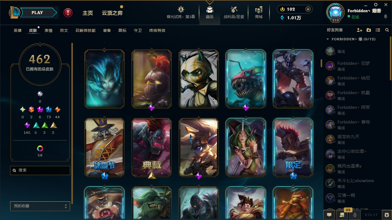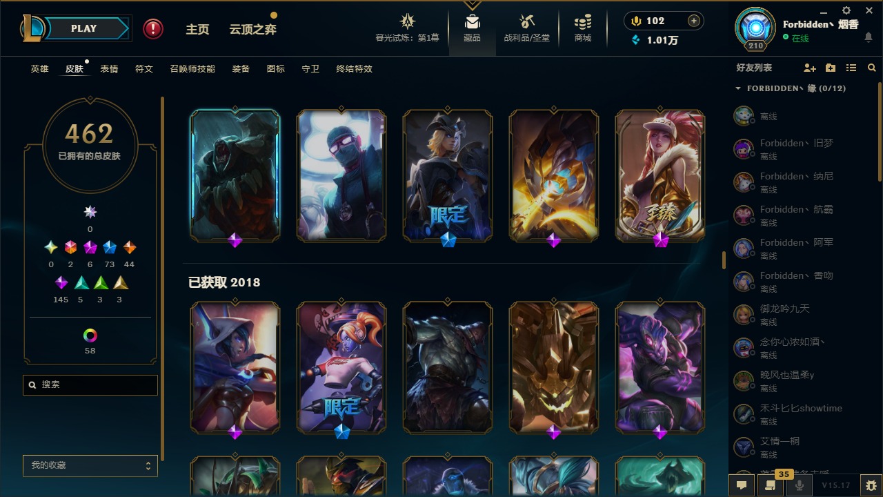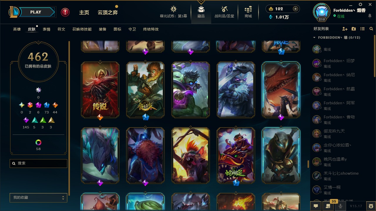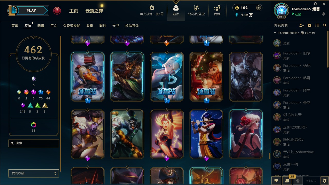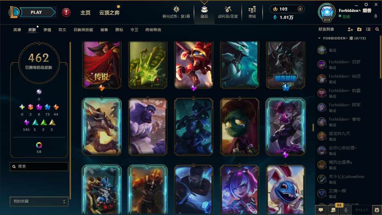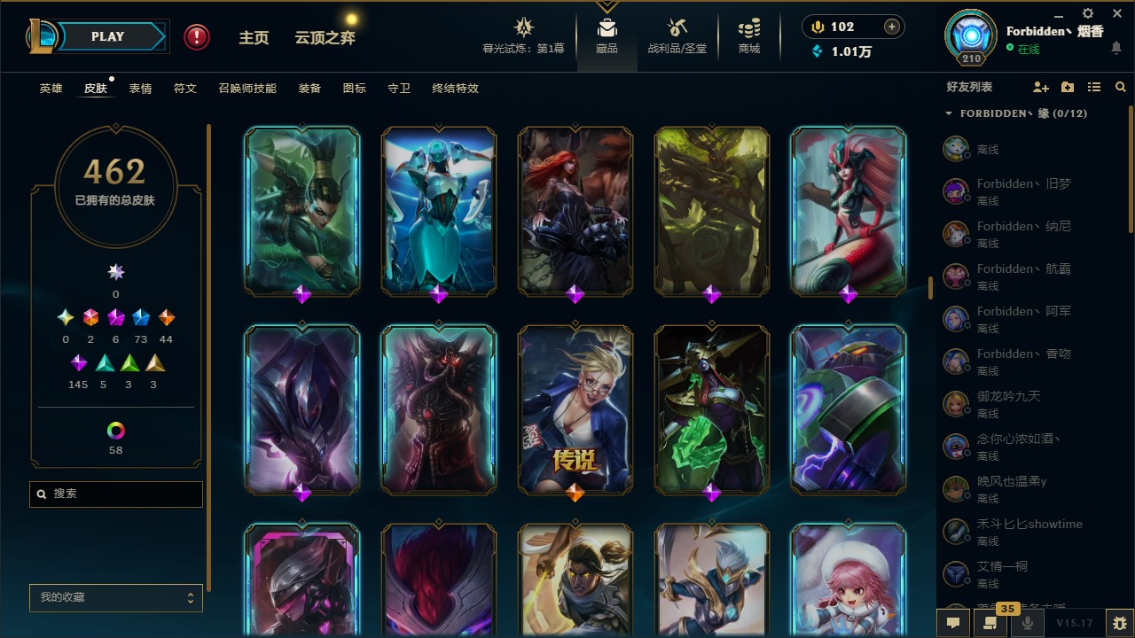 [11710577]2终极 6神话 73限定 44传说 145史诗 462皮肤 80炫彩 151英雄 可二次 可修改实名 优质装备:至臻 K/DA 阿卡丽,斩星魔剑,防爆天使 凯尔,暗影 沃里克,地底世界 崔斯特,钢铁之翼 凤凰,冠军典狱长 锤石,冠军之血 希瓦娜,冠军之隐 劫,鸡里奥,惊悚派对 阿木木,警用试作体K-9 内瑟斯,克格汪 克格莫,蓝色忧郁 崔斯特,密林猎手 提莫,女猎手 希维尔,送披萨的小姐姐 希维尔,野兽猎人 德莱文,御魔星矢 寒冰,大元素使,未来战士,冰霜之刃 艾瑞莉娅 炫金,冰雪游神 巴德 炫金,冰雪风暴 希维尔 炫金,冠军之隐 劫 凯旋圣装,红莲之刃 锐雯 海克斯:摄魂 薇恩,海克斯 阿利斯塔,海克斯 克格莫,海克斯 阿木木 限定:战熊骑士,创星之灵 璐璐 情人节限定:觅心之翼 奎因,甜心宝贝 安妮 冠军限定系列:S1FNC 酒桶,S1FNC 迦娜,S1FNC 卡尔萨斯,S2 暗杀星 发条,S2 暗杀星 蒙多,S2 暗杀星 慎,S2 暗杀星 伊泽瑞尔,S3 SKT T1 贾克斯,S4 SSW 泰隆,S4 SSW 图奇,S4 SSW 炼金,S6 SKT T1 艾克 冰雪节限定:“主人不要我了” 阿木木,冰雪节 格雷福斯,冰雪节 马尔扎哈,冰雪节 炼金,冬季仙境 发条,冬季仙境 卡尔玛,胡桃夹子 小丑,平安夜女神 娑娜,魄罗骑士 瑟庄妮,圣诞开心鬼 提莫,圣诞精灵 崔丝塔娜,圣诞狂欢 时光,圣诞狂欢 努努,圣诞老人 酒桶,圣诞糖果棒 厄运小姐,圣诞玩偶 波比,圣诞驯鹿 克格莫,冰雪节 茂凯,邪恶圣诞老人 维迦,幸福女神 乐芙兰,雪默丁格 泳池派对:泳池派对 吉格斯,泳池派对 雷克顿,泳池派对 李青,泳池派对 塔里克 万圣节限定:鬼影森森 茂凯,鬼影重重 魔腾,海贼 瑞兹,魅惑女巫 奈德丽,南瓜头 费德提克,无头骑士 人马 年限:龙年 孙悟空,蛇年 库奇,马年 黛安娜,猴年 莫甘娜,鸡年 阿兹尔,鸡年 盖伦,狗年 内瑟斯 周年:2周年 德莱厄斯,4周年 锐雯,10周年 安妮