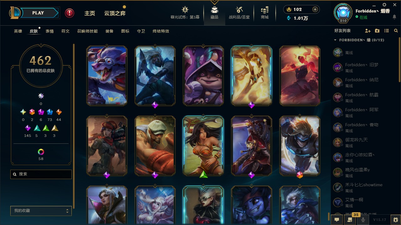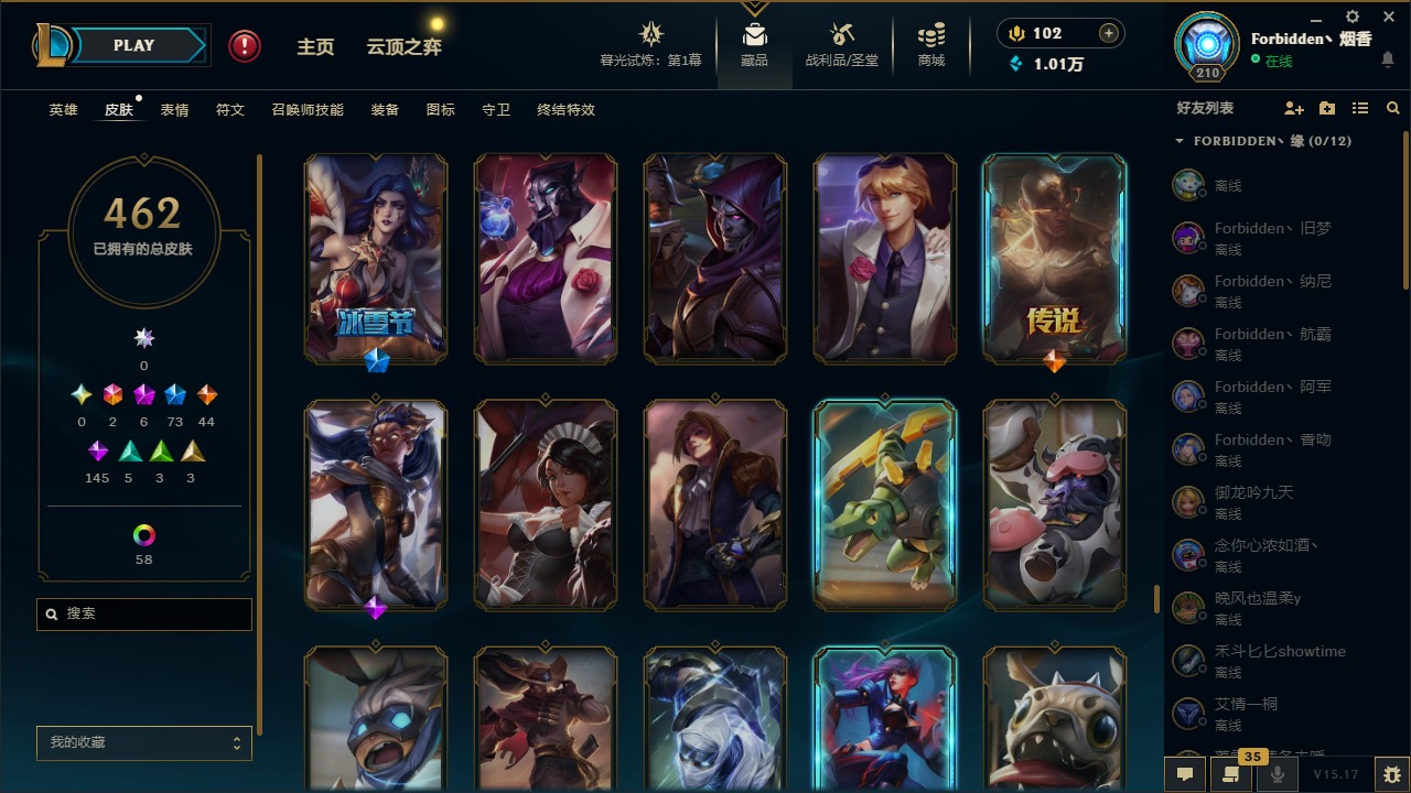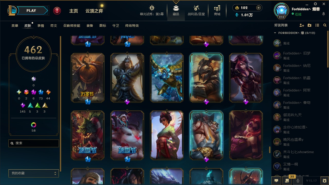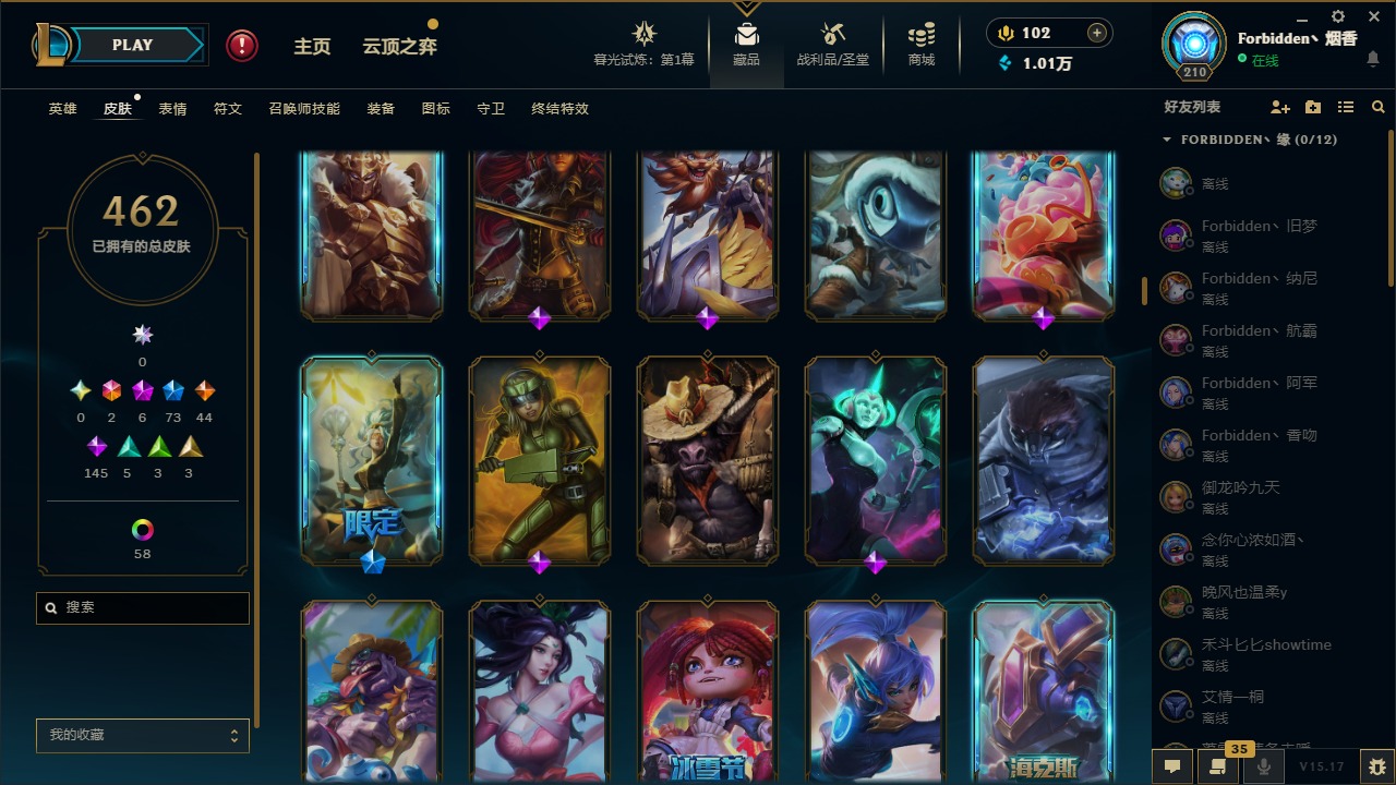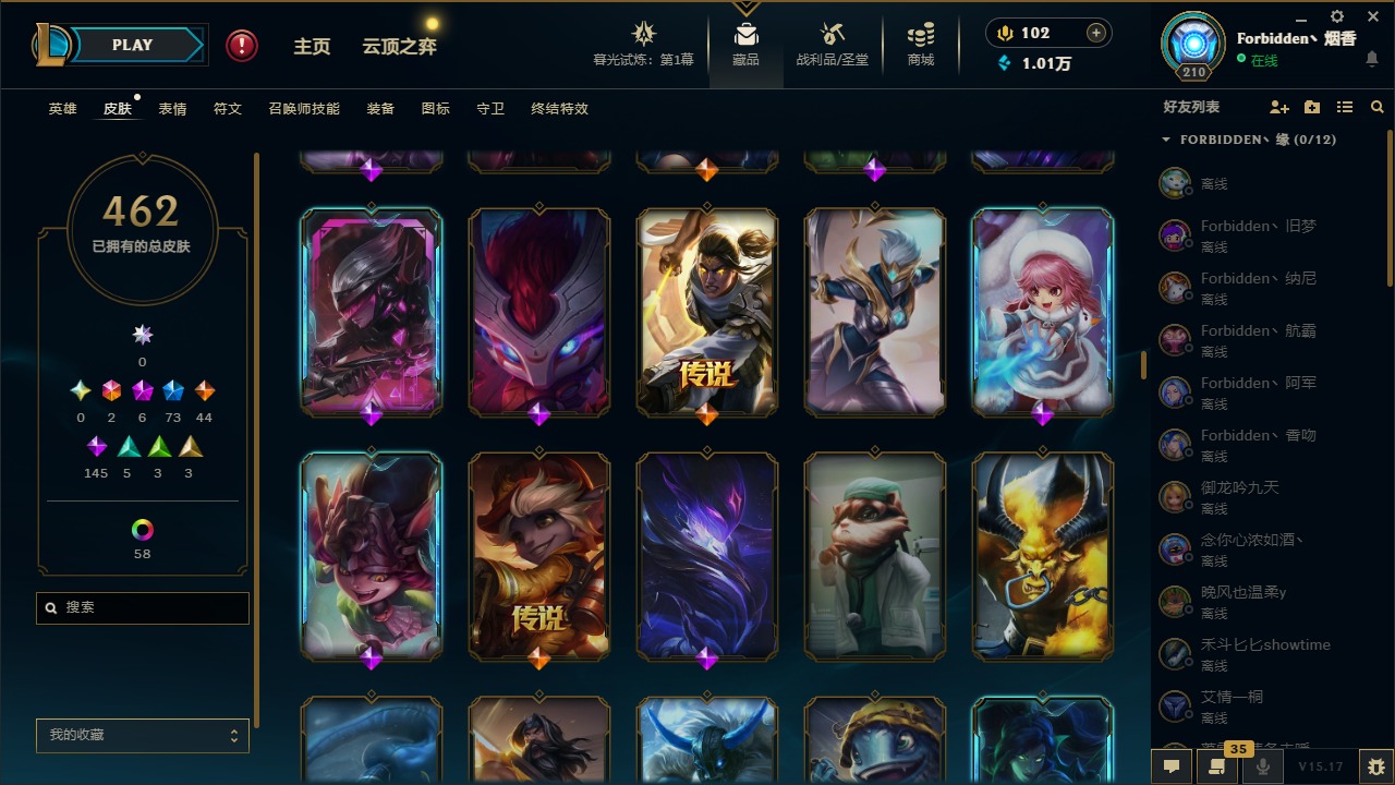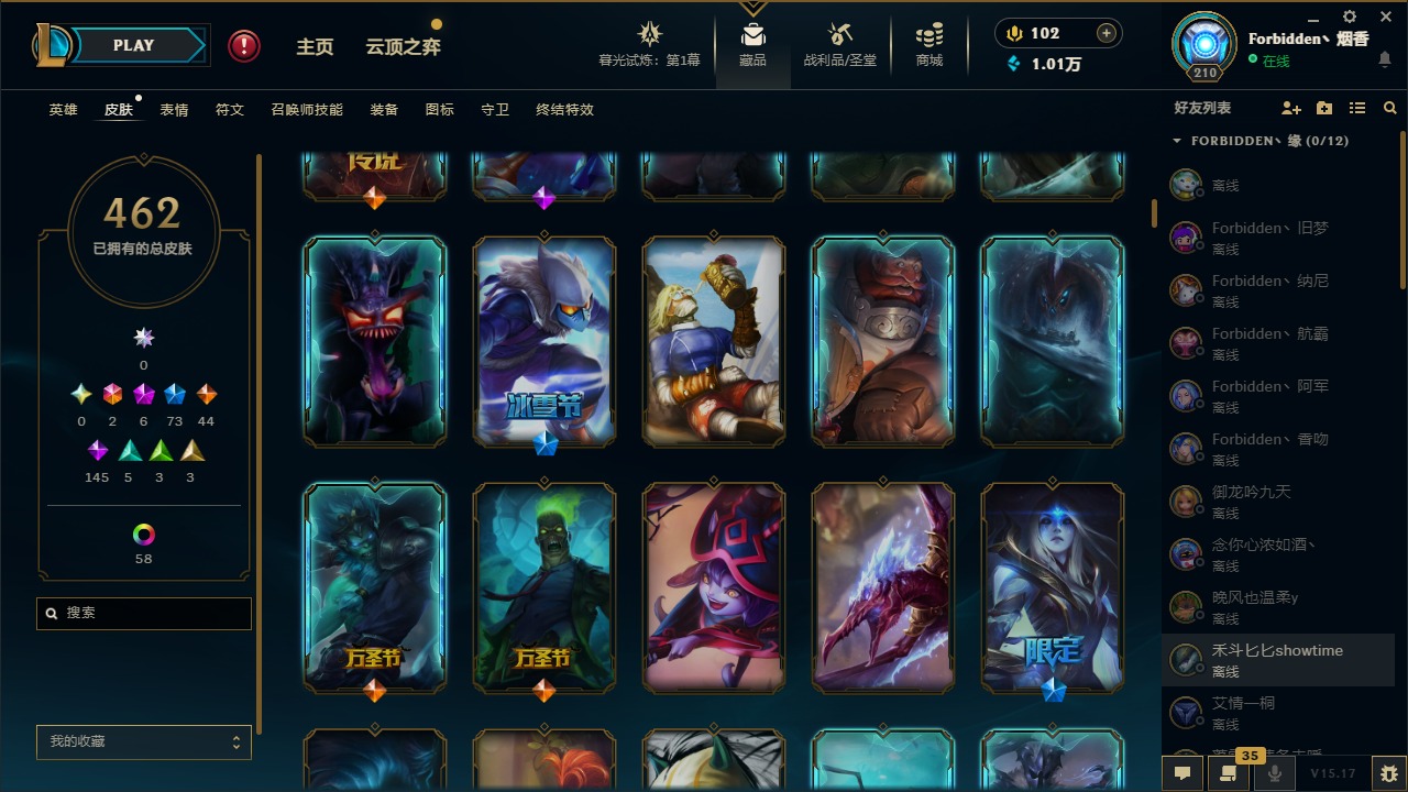 [11710577]2终极 6神话 73限定 44传说 145史诗 462皮肤 80炫彩 151英雄 可二次 可修改实名 优质装备:至臻 K/DA 阿卡丽,斩星魔剑,防爆天使 凯尔,暗影 沃里克,地底世界 崔斯特,钢铁之翼 凤凰,冠军典狱长 锤石,冠军之血 希瓦娜,冠军之隐 劫,鸡里奥,惊悚派对 阿木木,警用试作体K-9 内瑟斯,克格汪 克格莫,蓝色忧郁 崔斯特,密林猎手 提莫,女猎手 希维尔,送披萨的小姐姐 希维尔,野兽猎人 德莱文,御魔星矢 寒冰,大元素使,未来战士,冰霜之刃 艾瑞莉娅 炫金,冰雪游神 巴德 炫金,冰雪风暴 希维尔 炫金,冠军之隐 劫 凯旋圣装,红莲之刃 锐雯 海克斯:摄魂 薇恩,海克斯 阿利斯塔,海克斯 克格莫,海克斯 阿木木 限定:战熊骑士,创星之灵 璐璐 情人节限定:觅心之翼 奎因,甜心宝贝 安妮 冠军限定系列:S1FNC 酒桶,S1FNC 迦娜,S1FNC 卡尔萨斯,S2 暗杀星 发条,S2 暗杀星 蒙多,S2 暗杀星 慎,S2 暗杀星 伊泽瑞尔,S3 SKT T1 贾克斯,S4 SSW 泰隆,S4 SSW 图奇,S4 SSW 炼金,S6 SKT T1 艾克 冰雪节限定:“主人不要我了” 阿木木,冰雪节 格雷福斯,冰雪节 马尔扎哈,冰雪节 炼金,冬季仙境 发条,冬季仙境 卡尔玛,胡桃夹子 小丑,平安夜女神 娑娜,魄罗骑士 瑟庄妮,圣诞开心鬼 提莫,圣诞精灵 崔丝塔娜,圣诞狂欢 时光,圣诞狂欢 努努,圣诞老人 酒桶,圣诞糖果棒 厄运小姐,圣诞玩偶 波比,圣诞驯鹿 克格莫,冰雪节 茂凯,邪恶圣诞老人 维迦,幸福女神 乐芙兰,雪默丁格 泳池派对:泳池派对 吉格斯,泳池派对 雷克顿,泳池派对 李青,泳池派对 塔里克 万圣节限定:鬼影森森 茂凯,鬼影重重 魔腾,海贼 瑞兹,魅惑女巫 奈德丽,南瓜头 费德提克,无头骑士 人马 年限:龙年 孙悟空,蛇年 库奇,马年 黛安娜,猴年 莫甘娜,鸡年 阿兹尔,鸡年 盖伦,狗年 内瑟斯 周年:2周年 德莱厄斯,4周年 锐雯,10周年 安妮