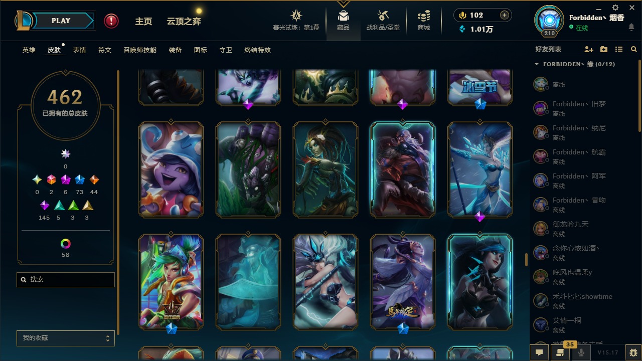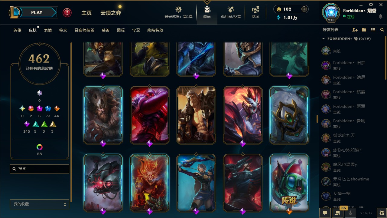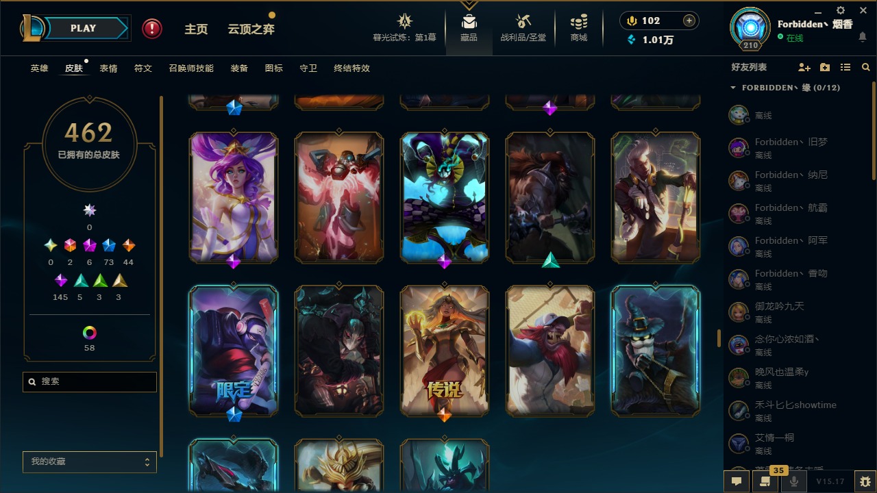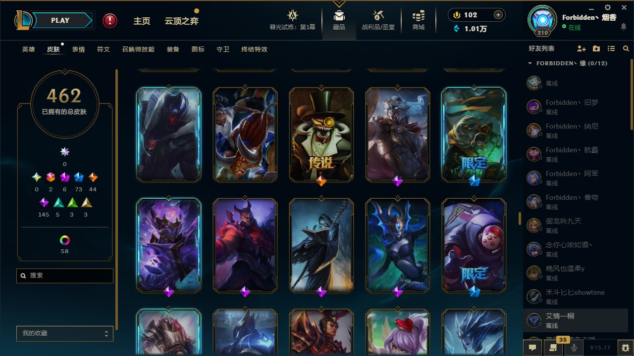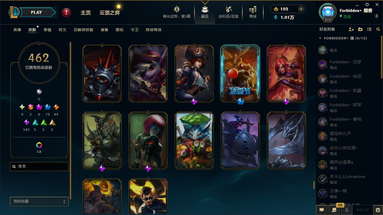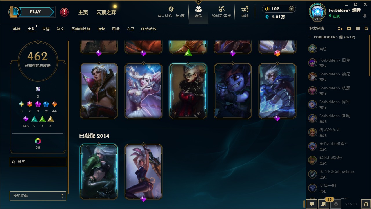 [11710577]2终极 6神话 73限定 44传说 145史诗 462皮肤 80炫彩 151英雄 可二次 可修改实名 优质装备:至臻 K/DA 阿卡丽,斩星魔剑,防爆天使 凯尔,暗影 沃里克,地底世界 崔斯特,钢铁之翼 凤凰,冠军典狱长 锤石,冠军之血 希瓦娜,冠军之隐 劫,鸡里奥,惊悚派对 阿木木,警用试作体K-9 内瑟斯,克格汪 克格莫,蓝色忧郁 崔斯特,密林猎手 提莫,女猎手 希维尔,送披萨的小姐姐 希维尔,野兽猎人 德莱文,御魔星矢 寒冰,大元素使,未来战士,冰霜之刃 艾瑞莉娅 炫金,冰雪游神 巴德 炫金,冰雪风暴 希维尔 炫金,冠军之隐 劫 凯旋圣装,红莲之刃 锐雯 海克斯:摄魂 薇恩,海克斯 阿利斯塔,海克斯 克格莫,海克斯 阿木木 限定:战熊骑士,创星之灵 璐璐 情人节限定:觅心之翼 奎因,甜心宝贝 安妮 冠军限定系列:S1FNC 酒桶,S1FNC 迦娜,S1FNC 卡尔萨斯,S2 暗杀星 发条,S2 暗杀星 蒙多,S2 暗杀星 慎,S2 暗杀星 伊泽瑞尔,S3 SKT T1 贾克斯,S4 SSW 泰隆,S4 SSW 图奇,S4 SSW 炼金,S6 SKT T1 艾克 冰雪节限定:“主人不要我了” 阿木木,冰雪节 格雷福斯,冰雪节 马尔扎哈,冰雪节 炼金,冬季仙境 发条,冬季仙境 卡尔玛,胡桃夹子 小丑,平安夜女神 娑娜,魄罗骑士 瑟庄妮,圣诞开心鬼 提莫,圣诞精灵 崔丝塔娜,圣诞狂欢 时光,圣诞狂欢 努努,圣诞老人 酒桶,圣诞糖果棒 厄运小姐,圣诞玩偶 波比,圣诞驯鹿 克格莫,冰雪节 茂凯,邪恶圣诞老人 维迦,幸福女神 乐芙兰,雪默丁格 泳池派对:泳池派对 吉格斯,泳池派对 雷克顿,泳池派对 李青,泳池派对 塔里克 万圣节限定:鬼影森森 茂凯,鬼影重重 魔腾,海贼 瑞兹,魅惑女巫 奈德丽,南瓜头 费德提克,无头骑士 人马 年限:龙年 孙悟空,蛇年 库奇,马年 黛安娜,猴年 莫甘娜,鸡年 阿兹尔,鸡年 盖伦,狗年 内瑟斯 周年:2周年 德莱厄斯,4周年 锐雯,10周年 安妮
