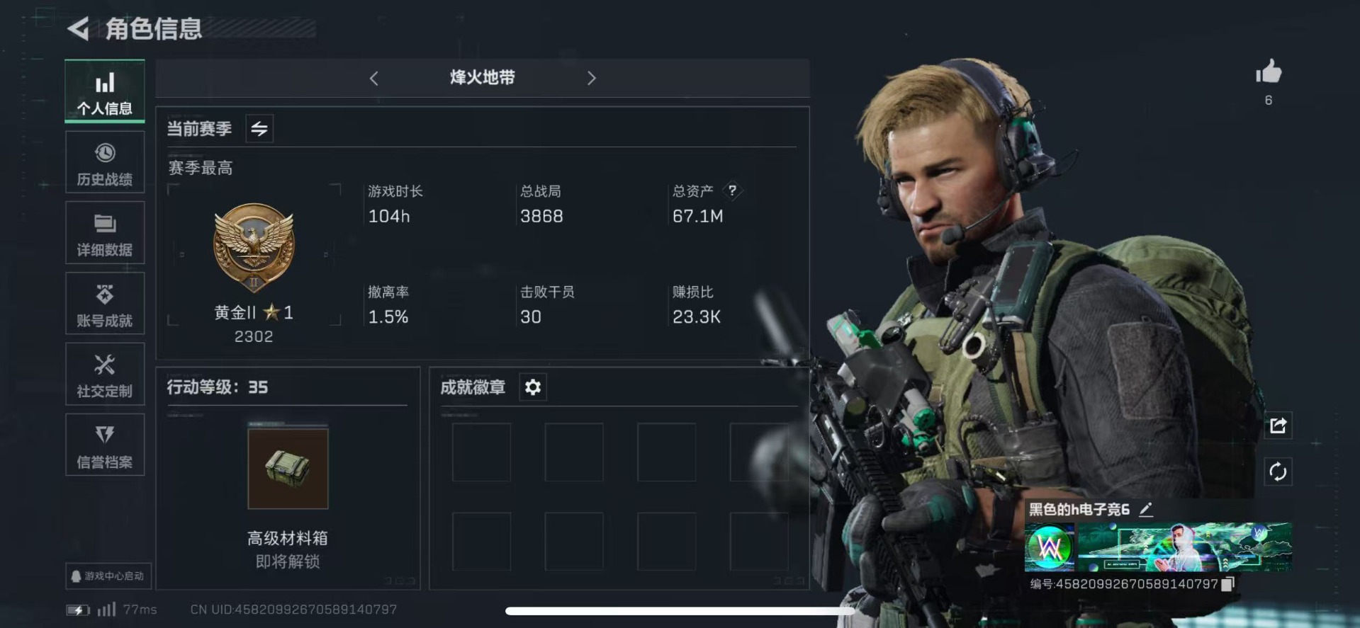 [11711244]总资产:67.1M 1传说枪械 哈夫币:51.437K 进阶安全箱(2×2)9.15号到期 可二次 可修改实名 烽火地带段位:黄金 全面战场段位:无段位 传说武器皮肤:勇士冲锋枪-能天使-午夜邮差