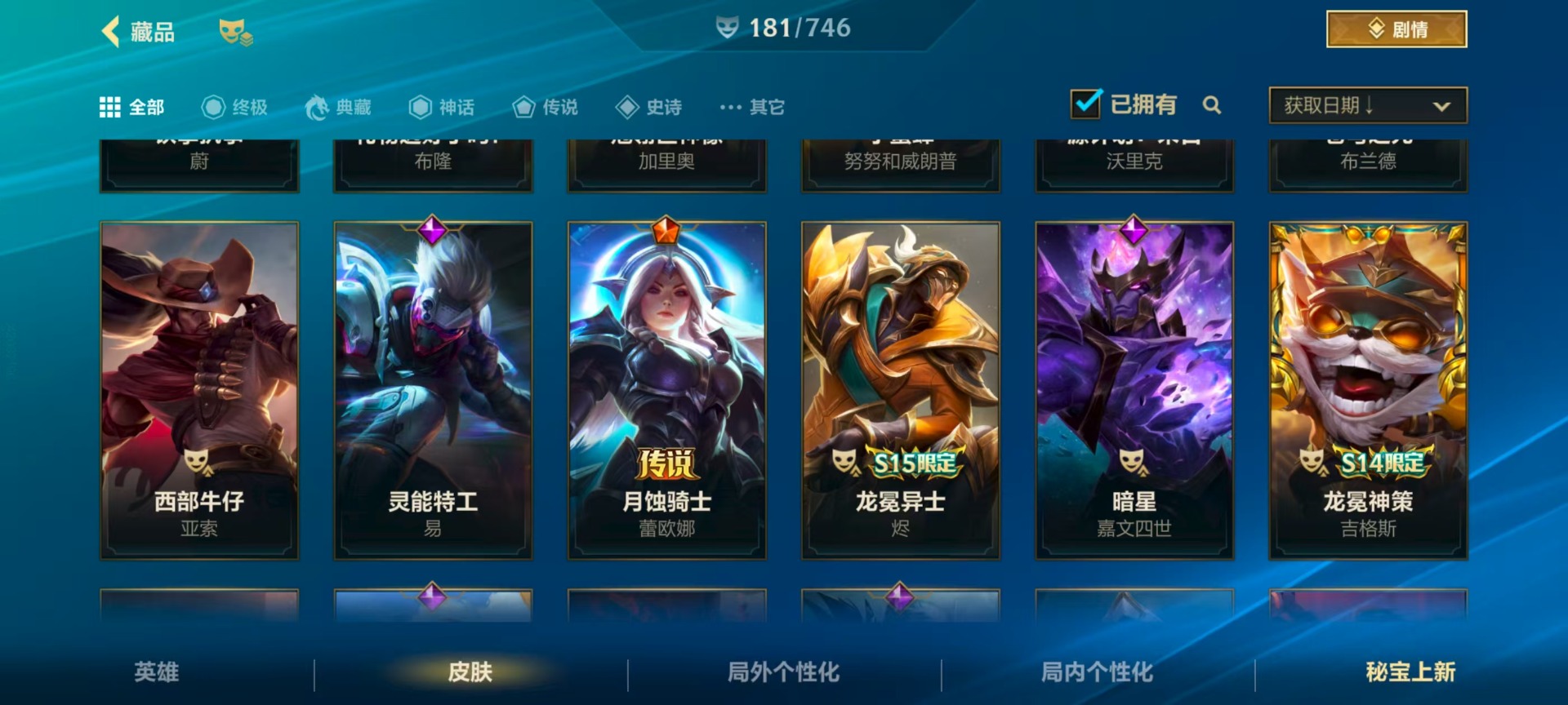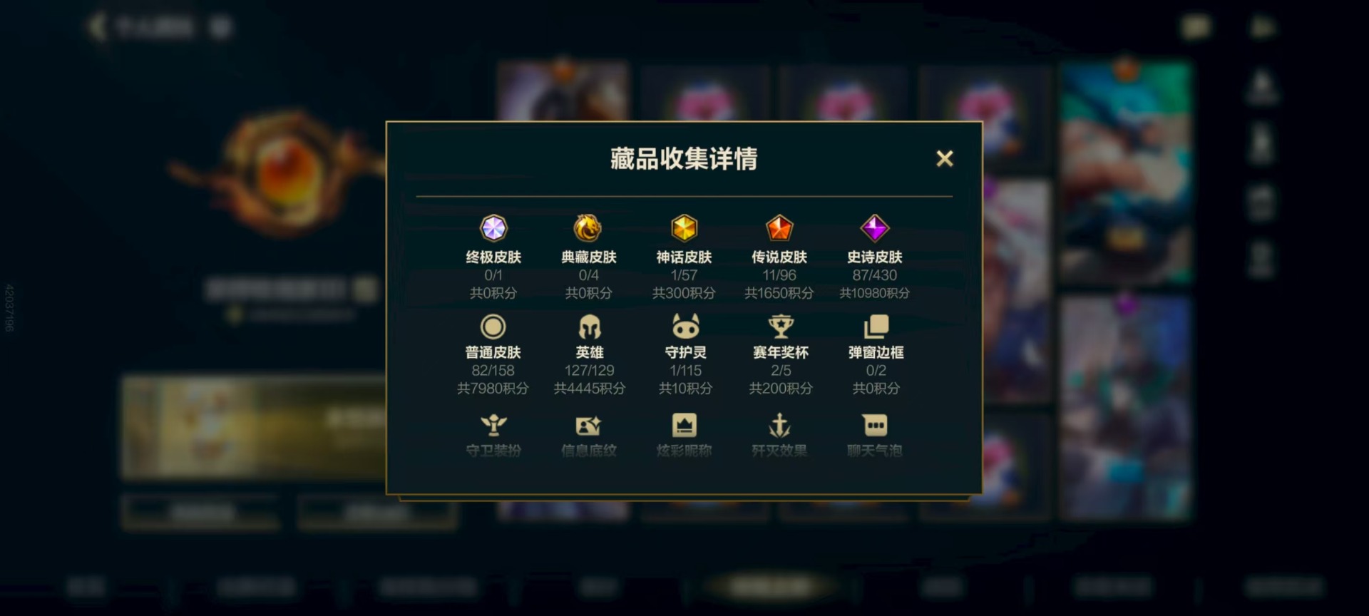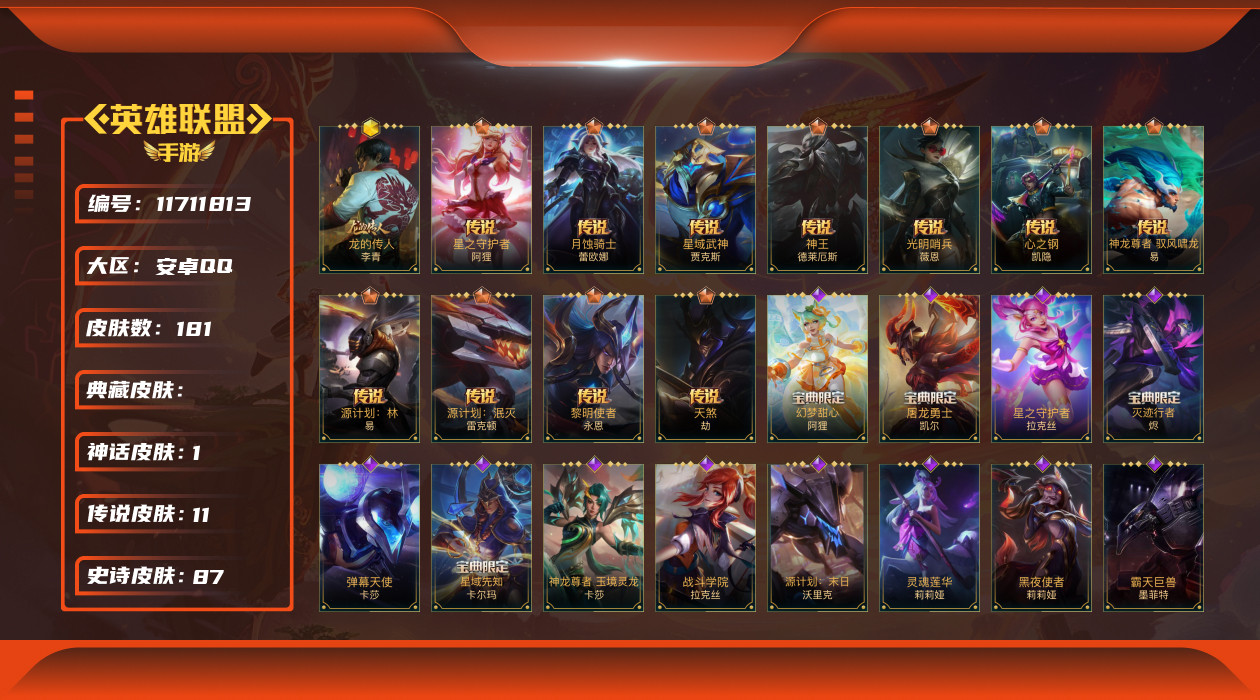 [11711813]1神话 11传说 87史诗 181皮肤 可二次 可修改实名 优质装备:光明哨兵薇恩,神龙尊者 驭风啸龙,神王诺手,天煞劫,星之守护者阿狸,月蚀骑士蕾欧娜,玉剑传说 武剑仙,源计划:林,源计划:泯灭,龙的传人,星域武神贾克斯,心之钢凯隐,龙的传人 段位:铂金 传说皮:黎明使者永恩 亮点:光明哨兵薇恩,神龙尊者 驭风啸龙,神王诺手,天煞劫,星之守护者阿狸,月蚀骑士蕾欧娜,玉剑传说 武剑仙,源计划:林,源计划:泯灭,龙的传人,星域武神贾克斯,心之钢凯隐,龙的传人