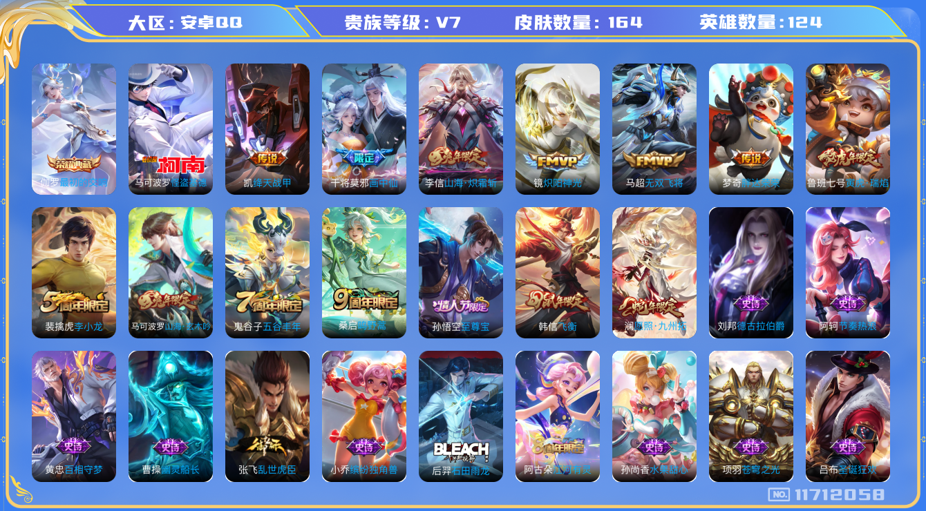 [11712058]V7 1典藏 1珍品传说 9传说 124英雄 164皮肤 可修改实名 优质装备:最初的交响(伽罗典藏),怪盗基德,绛天战甲(鸡嘴战神),炽阳神光,胖达荣荣,无双飞将,山海·炽霜斩(李信年限),画中仙,涂山容容 珍宝阁皮:妄想食味,胡桃夹子 限定皮:愿照·九州拓(澜年限),鸣野蒿,至尊宝,飞衡(韩信年限),五谷丰年,李小龙,寅虎·瑞焰(虎皮蛋子),山海·玄木吟(马可年限) 史诗皮:谪仙醉月,龙之律动,石田雨龙,百相守梦-黄忠,紫霞仙子,苍穹之光,黄金分割率,江河有灵,偶像歌手,电玩·爆裂旋风,末日机甲-吕布,乱世虎臣,节奏热浪,修罗,女仆咖啡,水果甜心,心灵骇客,功夫厨神,德古拉伯爵,暗隐猎兽者,幽灵船长,鬼剑武藏,暗渊魔法,心灵战警,缤纷独角兽,逐浪之夏,龙鼓争鸣,水晶猎龙者,金属风暴,圣诞狂欢,圣诞恋歌,鹰眼统帅,无心