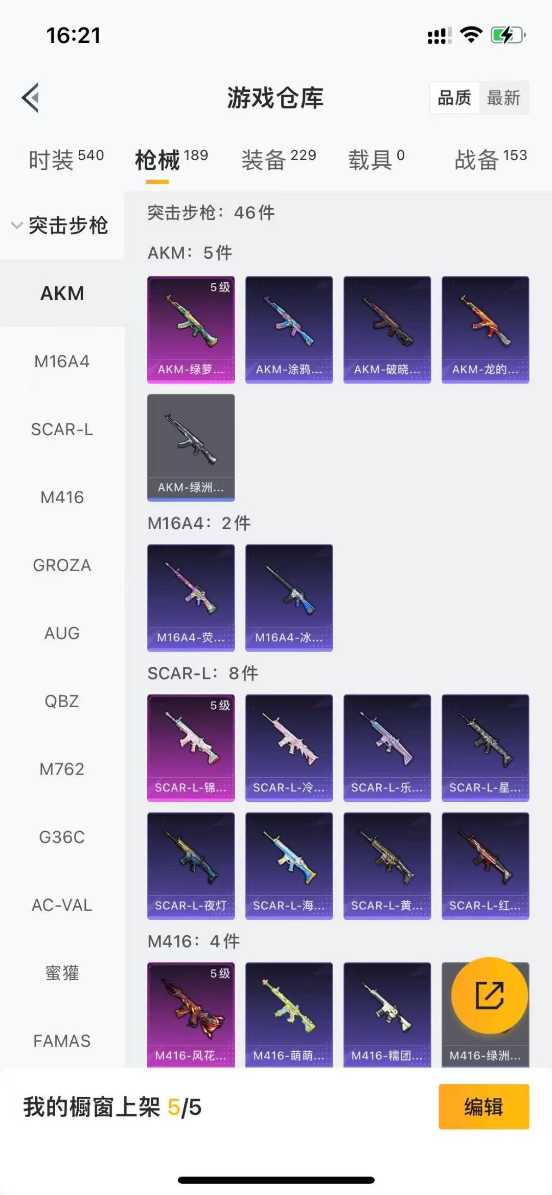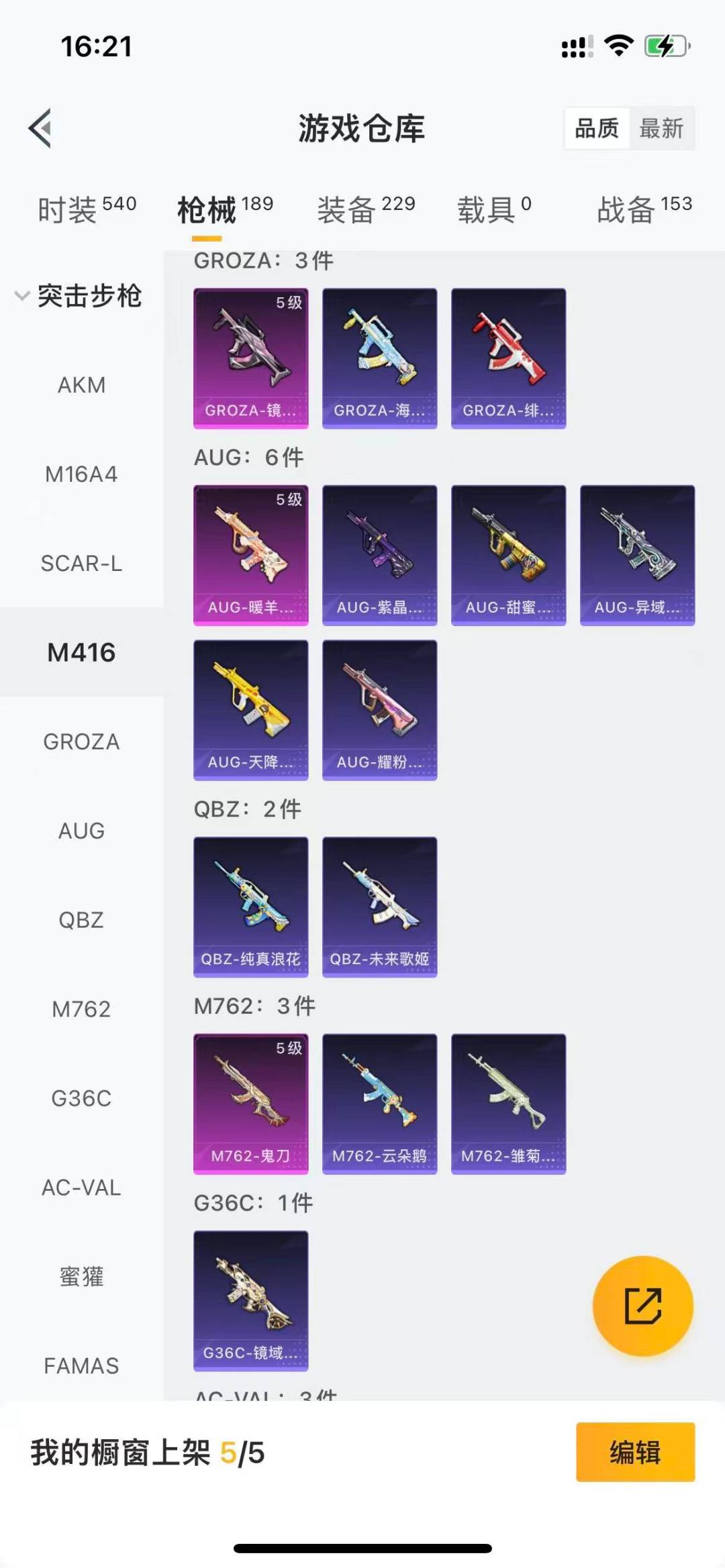 AKM-绿萝繁花,SCAR-L-锦绣绵绵,M416-风花雪月,GROZA-镜光银凌,AUG-暖羊咩咩,M762-鬼刀,Kar98K-巳巳如意
