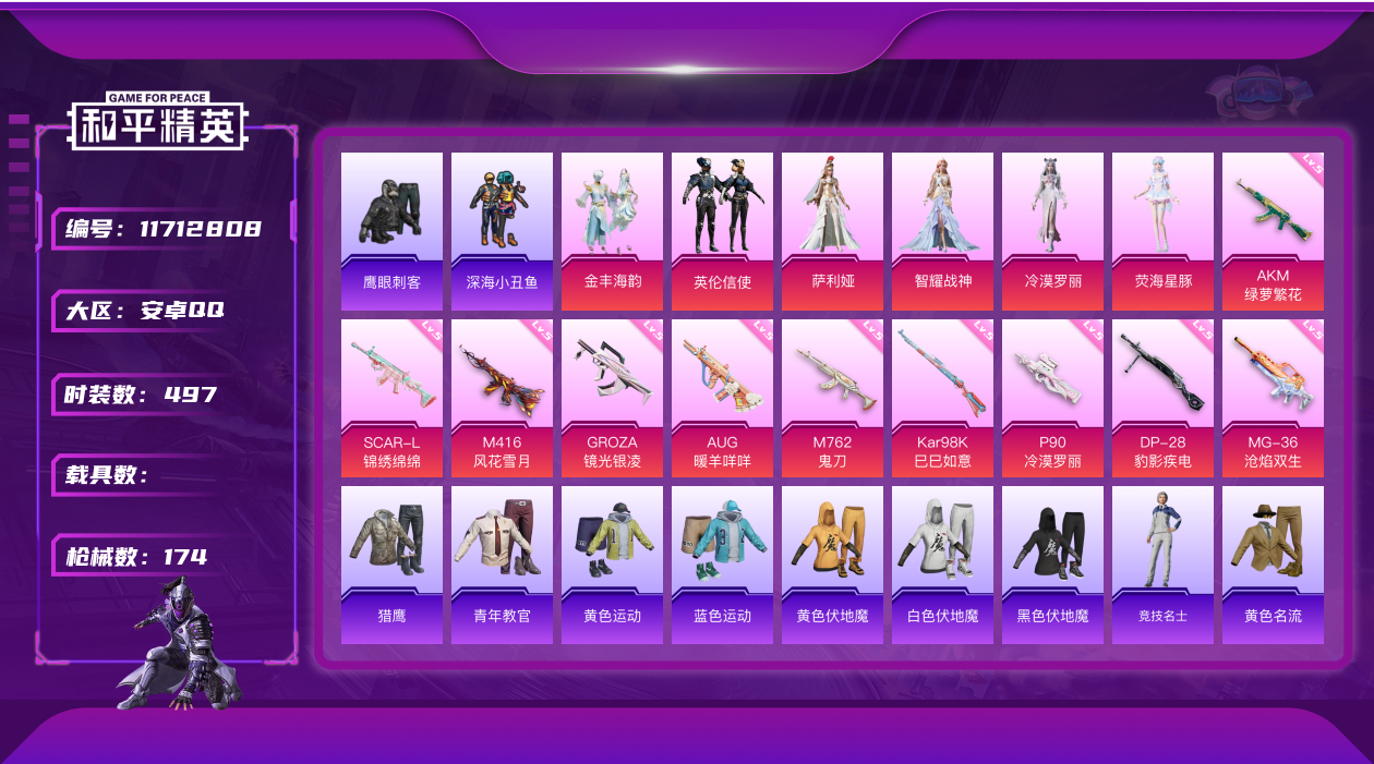 [11712808]6粉装 10特效枪 10印记 可二次 可修改实名 身法装备:暗影哥特(红眼罩),TT追光队服,Mark.06(新蓝螳螂) 优质装备:M416风花雪月,AKM绿萝繁花,SCAR-L-锦绣绵绵,英伦信使,GROZA-镜光银凌,萨利娅,M762-鬼刀,AUG-暖羊咩咩,智耀战神,冷漠罗丽,P90-冷漠罗丽,荧海星豚,Kar98K-巳巳如意 热门装扮:金丰海韵,鹰眼刺客,深海小丑鱼 稀有枪皮:MG-36-沧焰双生,DP-28-豹影疾电 五级特效枪:五级GROZA-镜光银凌,五级Kar98K-巳巳如意,五级P90-冷漠罗丽,五级DP-28-豹影疾电,五级MG-36-沧焰双生,五级M762-鬼刀,五级AUG-暖羊咩咩,五级SCAR-L-锦绣绵绵,五级AKM-绿萝繁花,五级M416-风花雪月 紫色装扮:SS31特训套装,人气偶像,冷焰舞者,北国孤狼,旭日情侣,极速光影,SS30特训套装,云朵鹅,彩虹兔,雪绒豹,乐游熊熊,SS33特训套装,青涩时光,顶瓜瓜,时希公主,灵公主,乐音,竞技角斗士,长空猛禽,雪山精英,霓虹街区,霓虹闪烁,青年教官,缤纷果语,蓝色运动,超能勇士,蓝海鲸歌,魅力单车,黄色伏地魔,黄色名流,黄色运动,黑色伏地魔,龙的传人,龟仙人,冰河战士,龙魂突击队,蝶变,香桃花海,熔岩游骑兵连帽夹克,极地朋克,柠萌假日,沙漠兵团,海岛探路者,涂山之恋,清新柠檬,幻影武者,夏日倾情,完美偶像,帅气教官,战地督导,绮丽涂鸦,疯狂小兔子,白色伏地魔,破蛋小黄鸡,空岛之星,竞技达人朋克,热血青春,燃烧卡路里,猛禽,猎鹰,小熊娃娃,雏菊兔兔,萝兰蝴蝶,SS29特训,多纳泰罗,星途旅人,白光莹,纯真浪花,热情海星,SS28特训,Mark.06(新蓝螳螂),异域银装,鱼渊荷华,玉兔迎春,燕燕于飞,巳巳如意,森林游猎者,海琴烟,风玲,青团波波,糖糖葫芦,棉花软糖,竞技名士,暗影哥特(红眼罩),街头风暴,情公主,TT追光队服,惊鸿侠骨,SS25特训,锦衣飞扬,焰鹰斗篷,幻羽潜行,幽夜迷踪,SS27特训,无暇誓言,Alan Walker,浪漫天命,日照花林,SS26特训,春光漫游,快闪甜心,智谋强哥,裁决冥王,大橘大利,星渊小夜曲,粉恋花,蓝冰羽,紫幽梦,SS32特训服(SS32特训套装),荧光绘影,绯格组合,樱梦幻音,纯白跃动,恋语绒绒,贵族骑装,光之冒险,红剪之缘 优质战备:精灵梦叶罗丽降