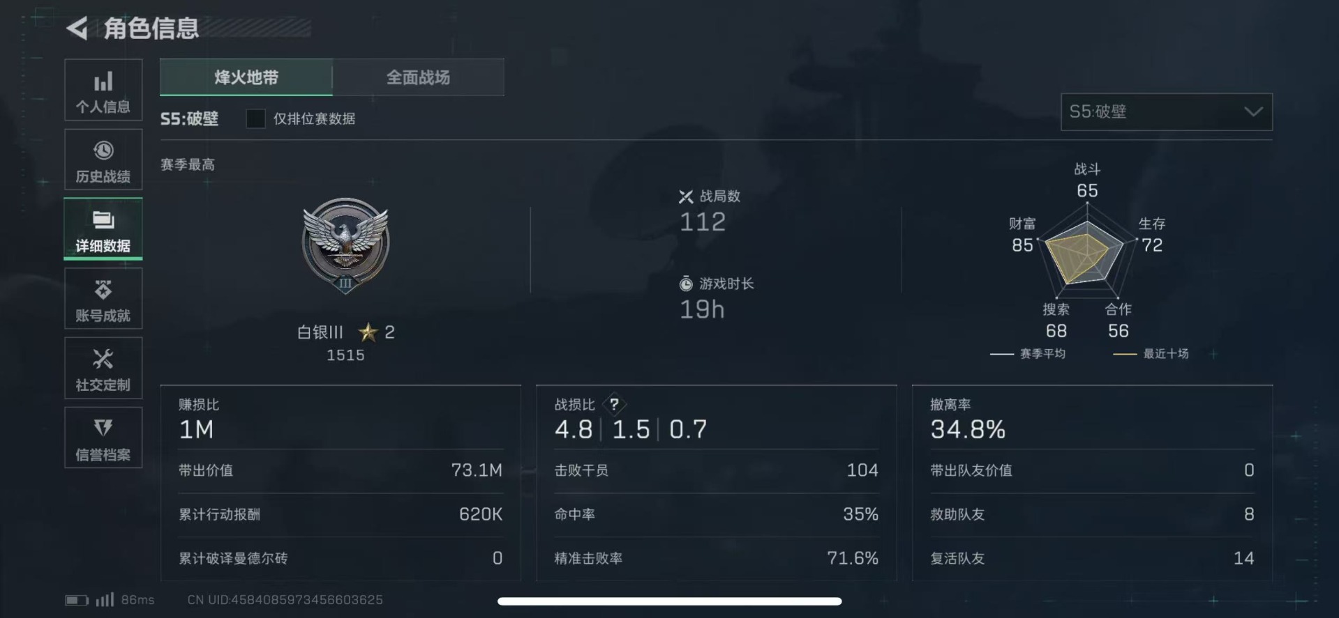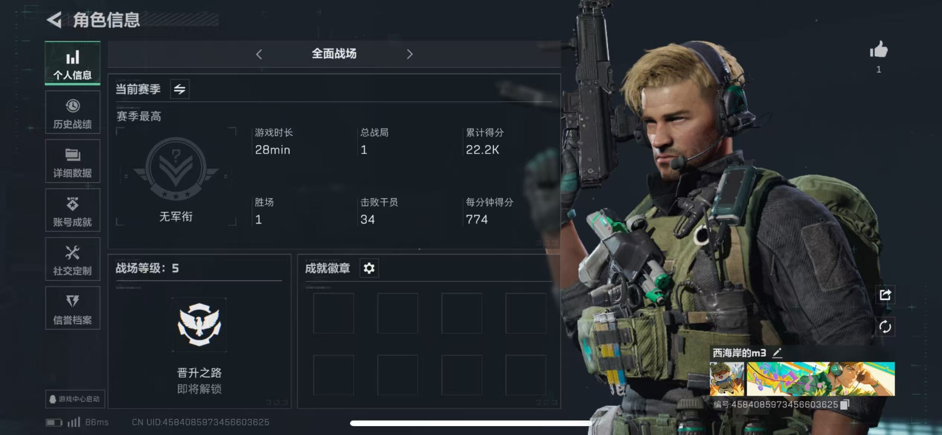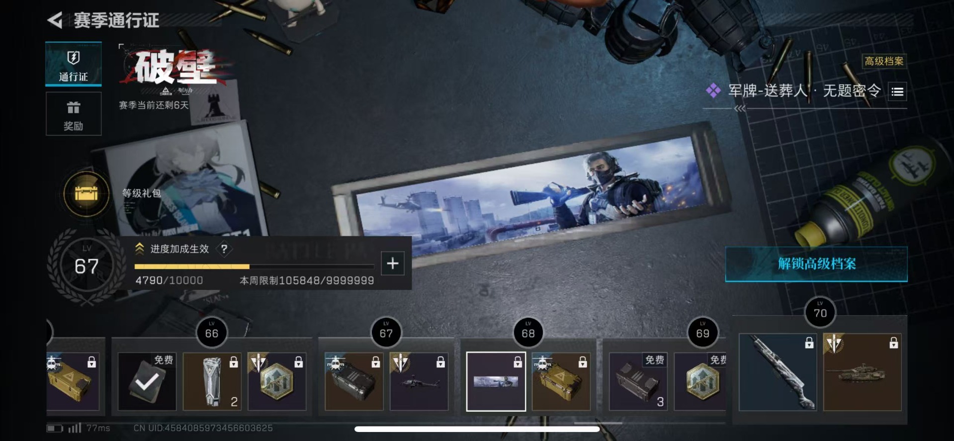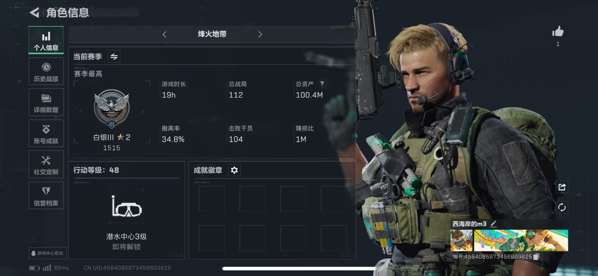 [11713262]总资产:100.4M 3传说枪械 哈夫币:52.701K 进阶安全箱(2×2)9.15号到期 可二次 可修改实名 烽火地带段位:白银 全面战场段位:无段位 传说武器皮肤:勇士冲锋枪-能天使-午夜邮差,复合弓-黑-天际线,M4A1突击步枪-阿米娅