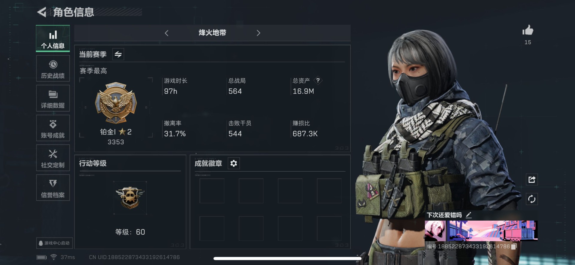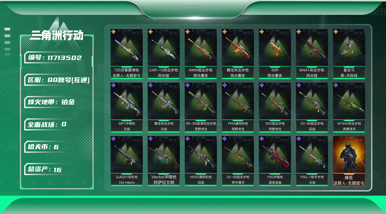 [11713502]总资产:16.9M 1干员外观 7传说枪械 哈夫币:6.789K 高级安全箱(2×3)9.15号到期 可二次 可修改实名 烽火地带段位:铂金 全面战场段位:列兵 传说武器皮肤:AWM狙击步枪-捞点薯条,腾龙突击步枪-捞点薯条,93R-捞点薯条,复合弓-黑-天际线,725双管霰弹枪-送葬人-无题密令,M4A1突击步枪-阿米娅,CAR-15突击步枪-阿米娅 史诗武器皮肤:QJB201轻机枪-Old Habits,M16A4突击步枪-竞赛选手,M250通用机枪-囚徒,SV-98狙击步枪-林中猎手,SV-98狙击步枪-囚徒,腾龙突击步枪-无垢,MP7冲锋枪-无垢,PSG-1射手步枪-无垢,SVD狙击步枪-荒野求生,SR-3M紧凑突击步枪-荒野求生,PKM通用机枪-荒野求生,Vector冲锋枪-阿萨拉文明,P90冲锋枪-紧急戒备 干员外观:蜂医-送葬人·无题密令(S5)