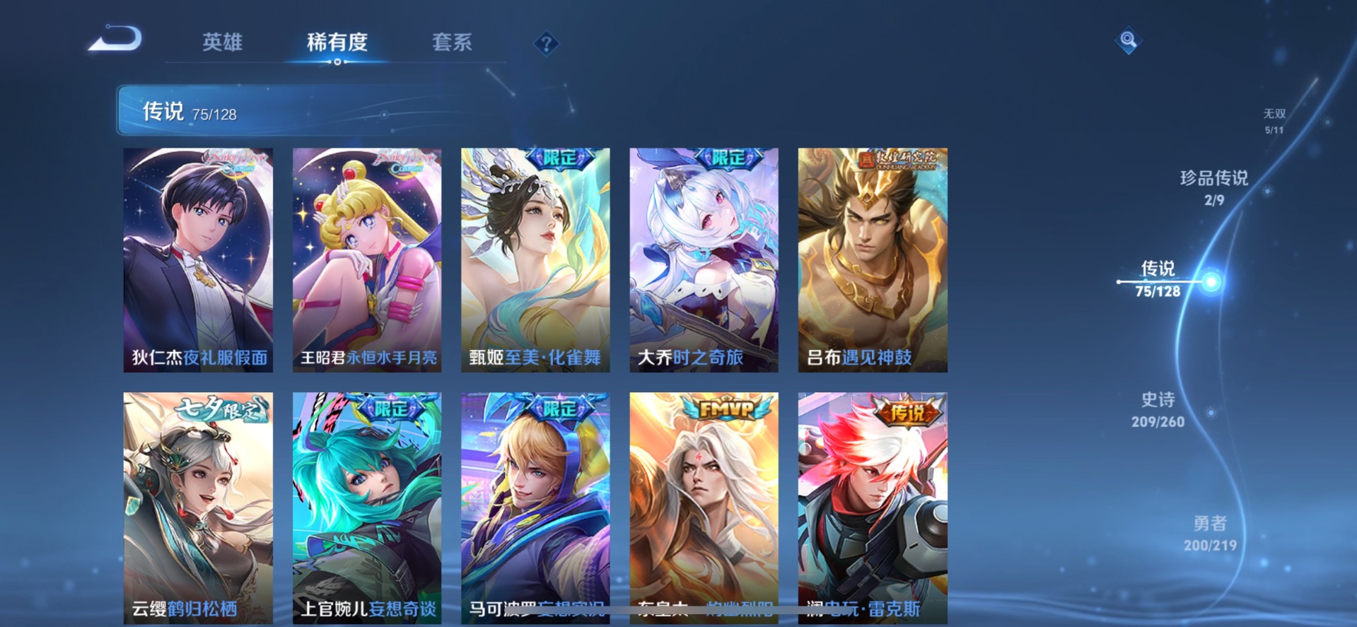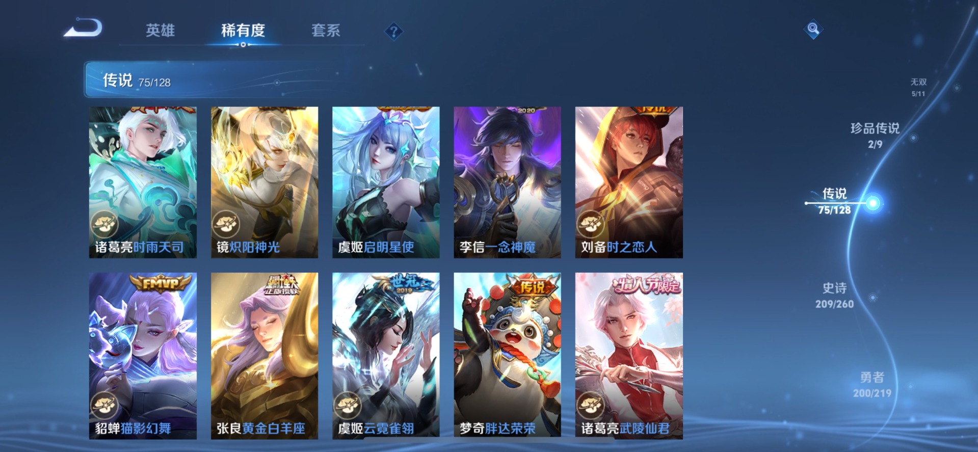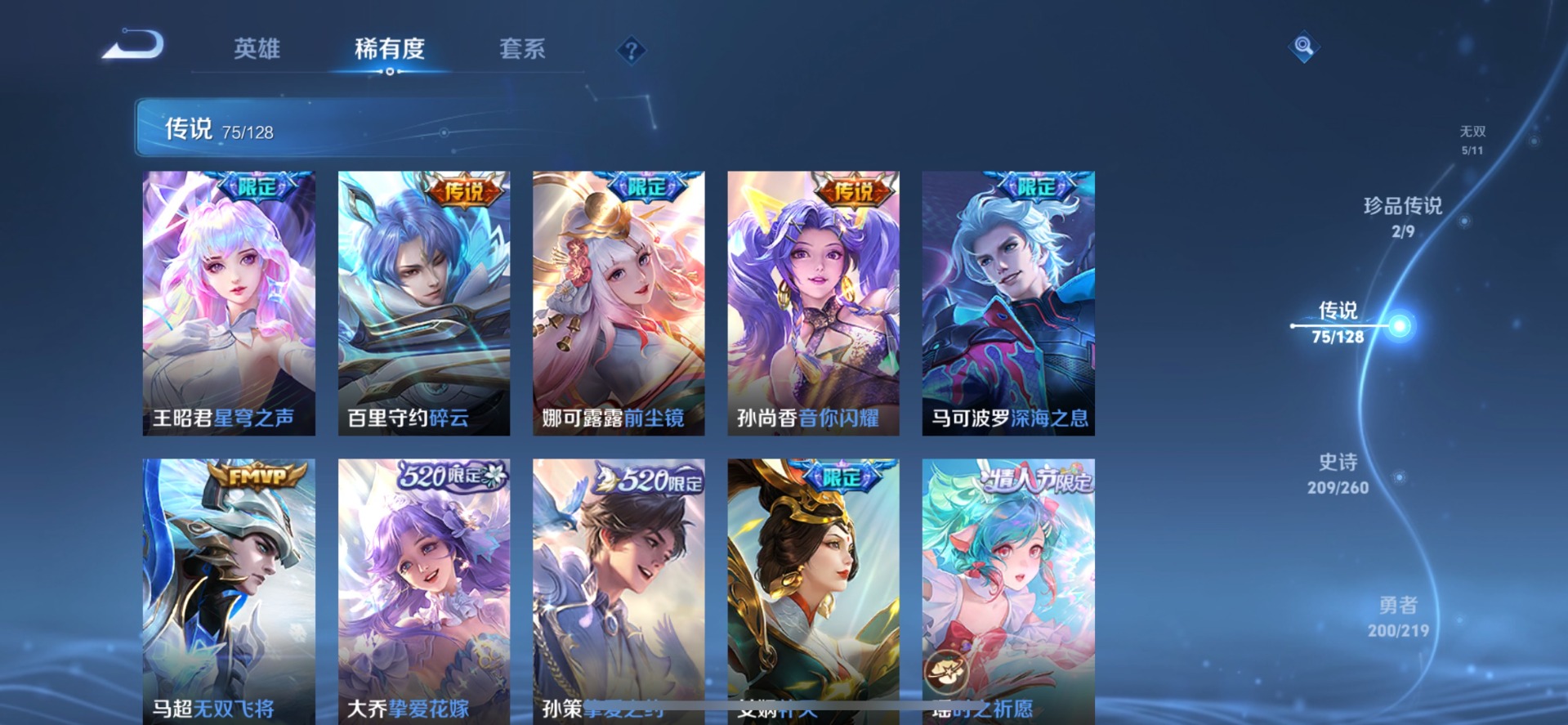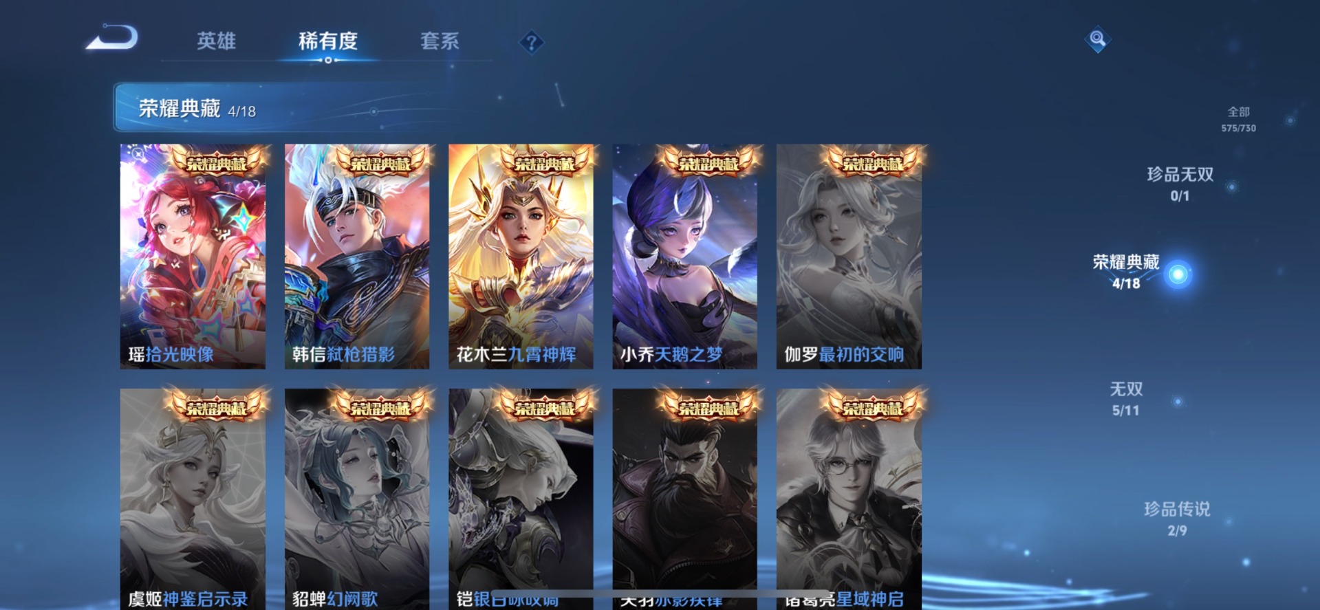 刘备时之恋人,小乔音你心动,李信一念神魔,孙尚香音你闪耀,孙尚香乘龙·问璇玑,镜炽阳神光,朵莉亚心动手记,周瑜音你心动,杨玉环星之鸣奏,貂蝉遇见胡旋,裴擒虎祥瑞亨通,貂蝉猫影幻舞,张良黄金白羊座,云中君群星魔术团,百里守约碎云,澜逐花归海,虞姬云霓雀翎,王昭君永恒水手月亮,大乔挚爱花嫁,大乔时之奇旅,铠琥珀纪元,赵云乘龙·铭钟鼎,孙膑小动物乐团,张飞百相守梦,赵云淬星耀世,干将莫邪画中仙,孙策挚爱之约,孙策乘龙·淬吴钩,王昭君乞巧织情,吕布遇见神鼓,公孙离记忆之芯,夏洛特浮生妄,安琪拉追逃游戏,艾琳觅芳踪,西施游龙清影,西施续相思,狄仁杰夜礼服假面,马超无双飞将,云缨幻光神枪