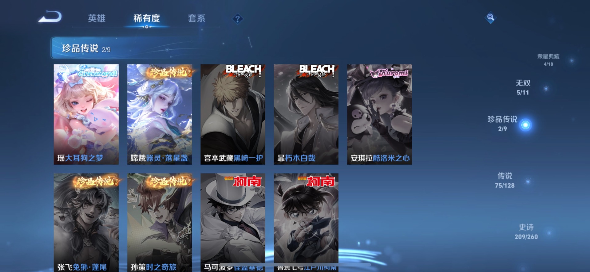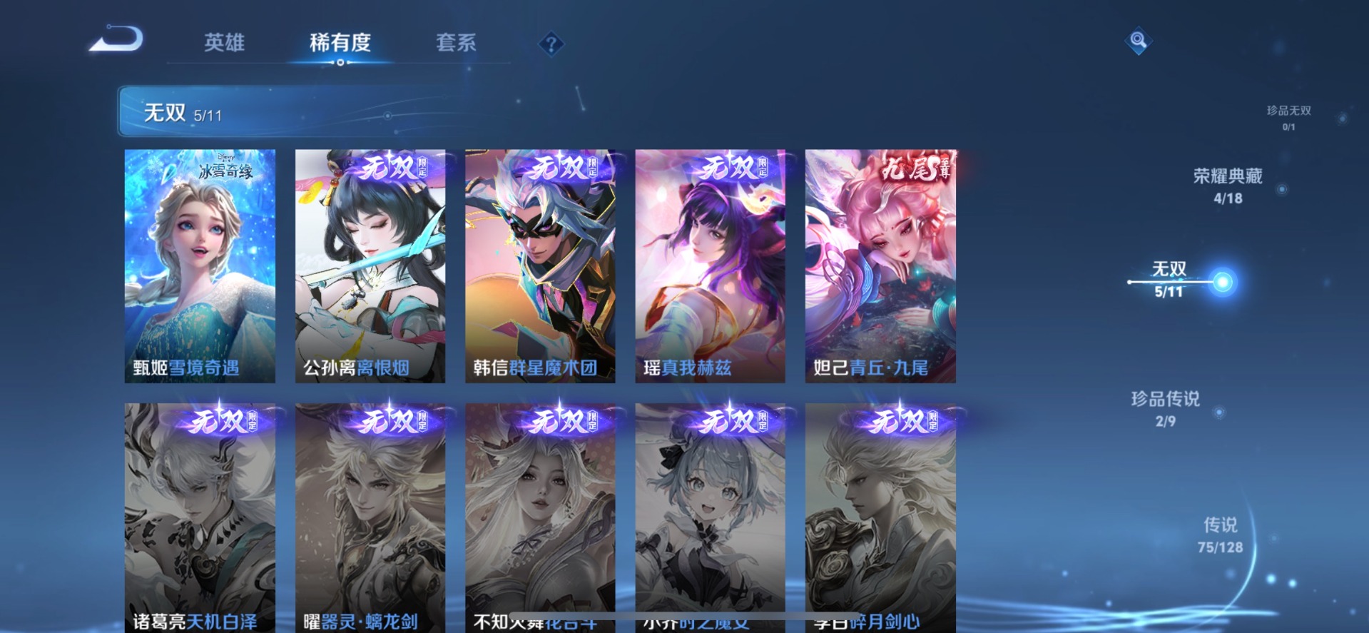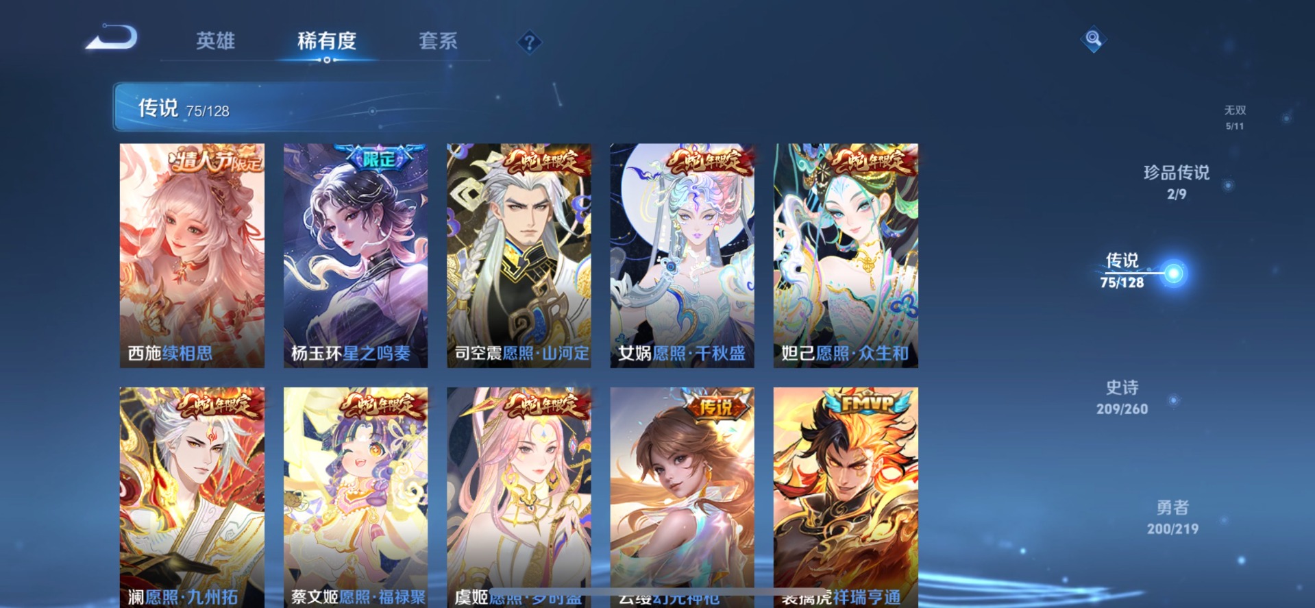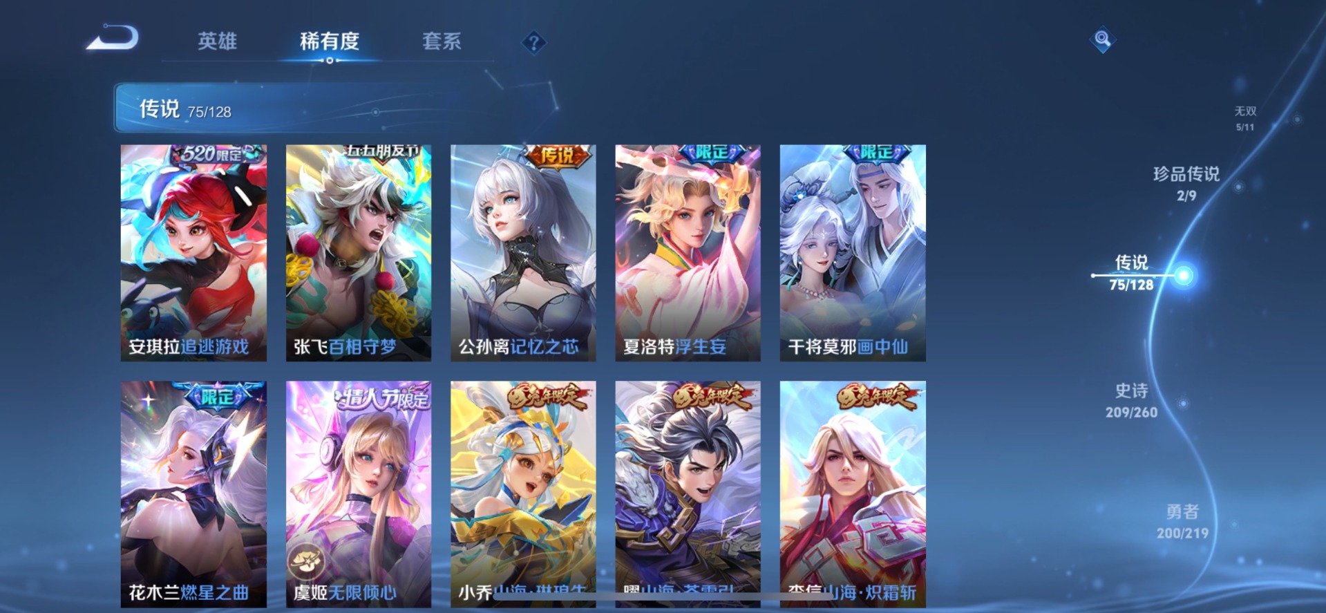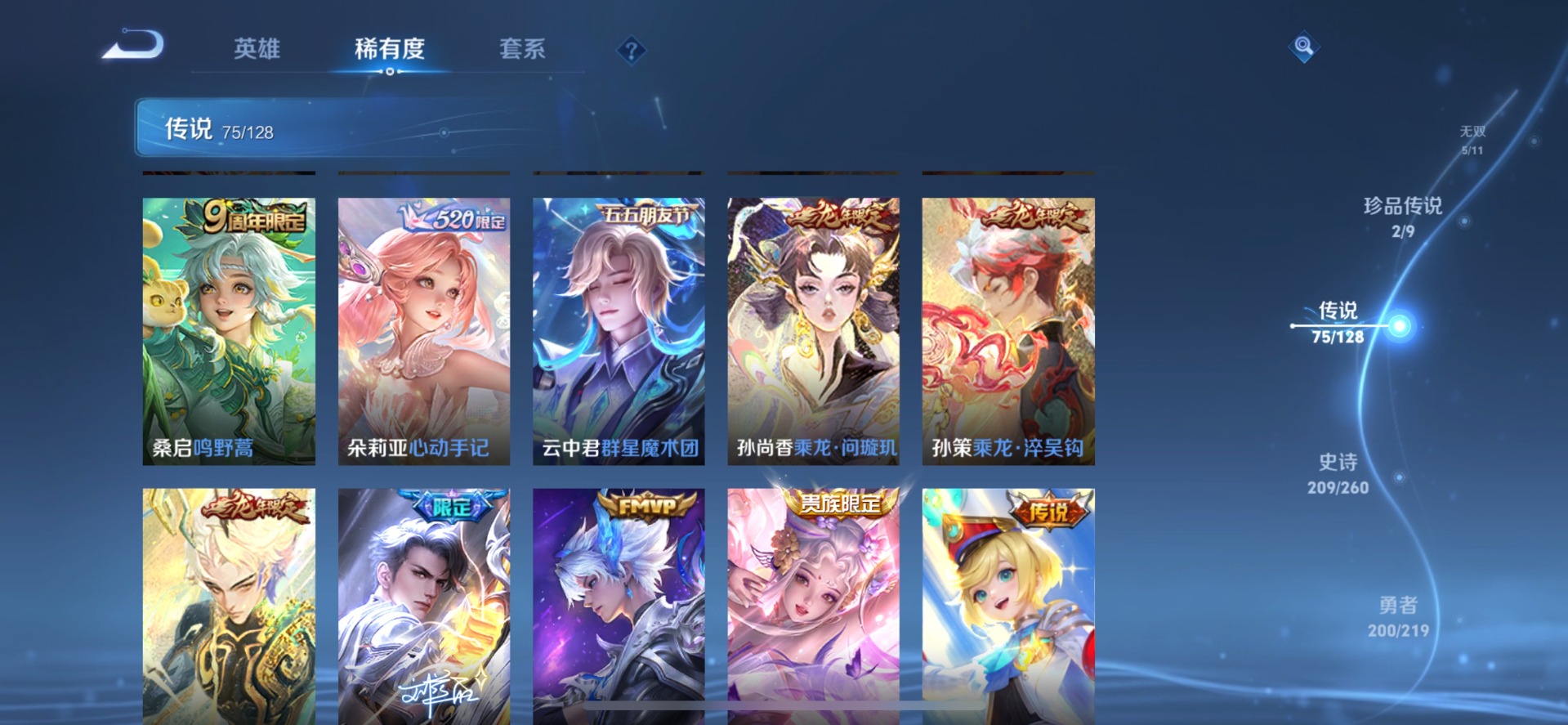 刘备时之恋人,小乔音你心动,李信一念神魔,孙尚香音你闪耀,孙尚香乘龙·问璇玑,镜炽阳神光,朵莉亚心动手记,周瑜音你心动,杨玉环星之鸣奏,貂蝉遇见胡旋,裴擒虎祥瑞亨通,貂蝉猫影幻舞,张良黄金白羊座,云中君群星魔术团,百里守约碎云,澜逐花归海,虞姬云霓雀翎,王昭君永恒水手月亮,大乔挚爱花嫁,大乔时之奇旅,铠琥珀纪元,赵云乘龙·铭钟鼎,孙膑小动物乐团,张飞百相守梦,赵云淬星耀世,干将莫邪画中仙,孙策挚爱之约,孙策乘龙·淬吴钩,王昭君乞巧织情,吕布遇见神鼓,公孙离记忆之芯,夏洛特浮生妄,安琪拉追逃游戏,艾琳觅芳踪,西施游龙清影,西施续相思,狄仁杰夜礼服假面,马超无双飞将,云缨幻光神枪