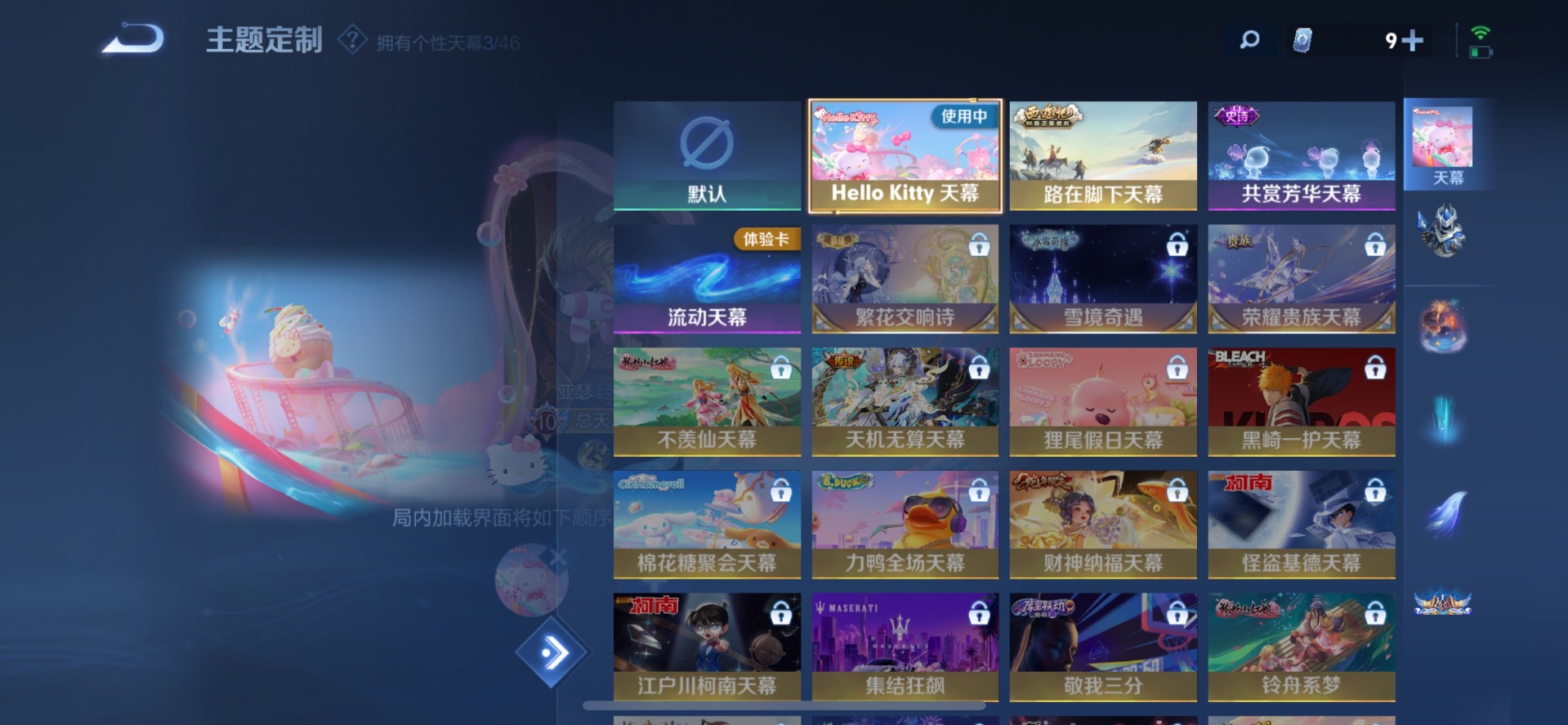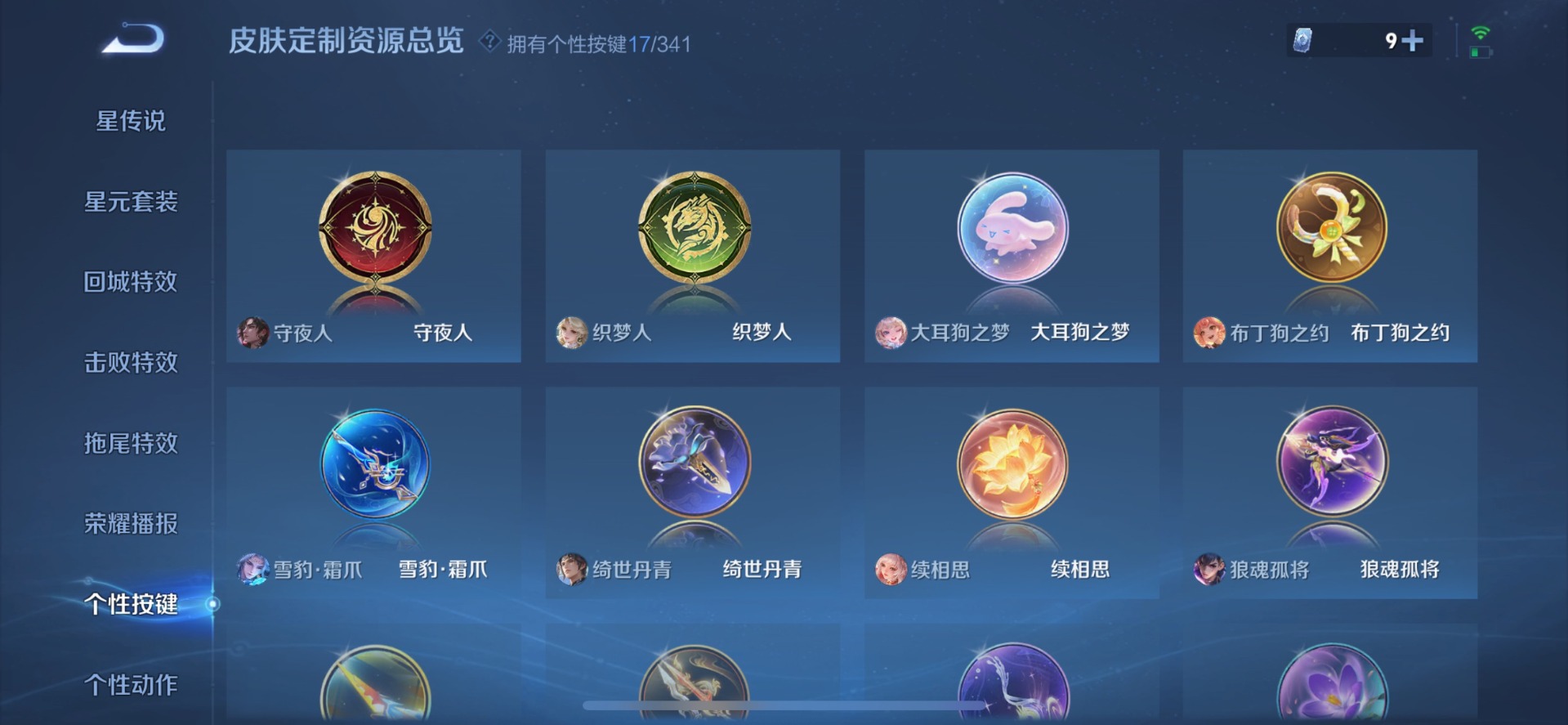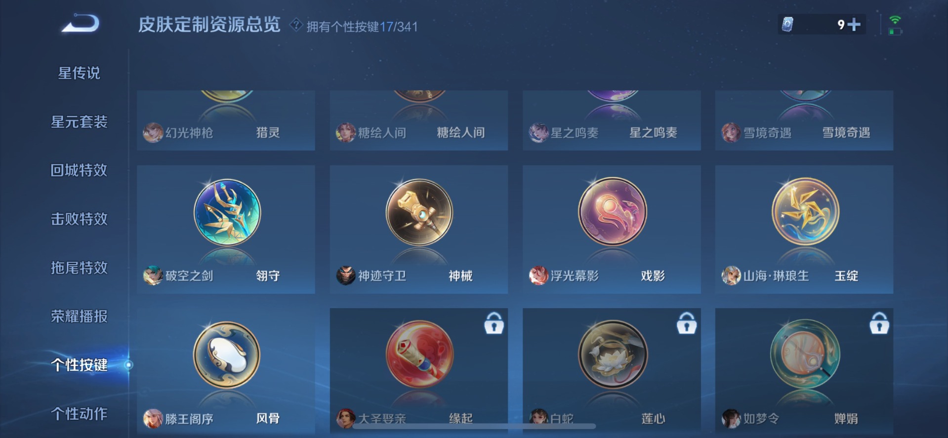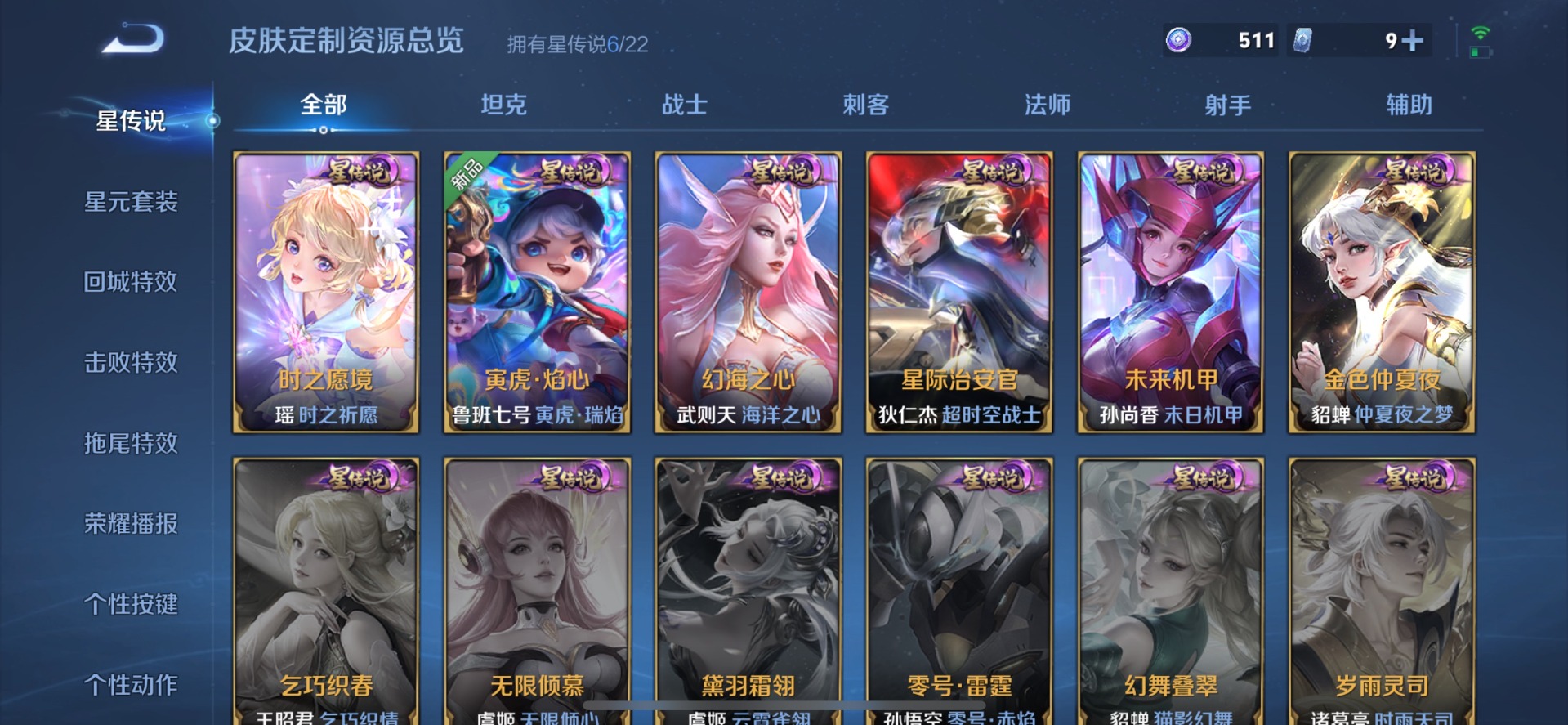 刘备时之恋人,小乔音你心动,李信一念神魔,孙尚香音你闪耀,孙尚香乘龙·问璇玑,镜炽阳神光,朵莉亚心动手记,周瑜音你心动,杨玉环星之鸣奏,貂蝉遇见胡旋,裴擒虎祥瑞亨通,貂蝉猫影幻舞,张良黄金白羊座,云中君群星魔术团,百里守约碎云,澜逐花归海,虞姬云霓雀翎,王昭君永恒水手月亮,大乔挚爱花嫁,大乔时之奇旅,铠琥珀纪元,赵云乘龙·铭钟鼎,孙膑小动物乐团,张飞百相守梦,赵云淬星耀世,干将莫邪画中仙,孙策挚爱之约,孙策乘龙·淬吴钩,王昭君乞巧织情,吕布遇见神鼓,公孙离记忆之芯,夏洛特浮生妄,安琪拉追逃游戏,艾琳觅芳踪,西施游龙清影,西施续相思,狄仁杰夜礼服假面,马超无双飞将,云缨幻光神枪