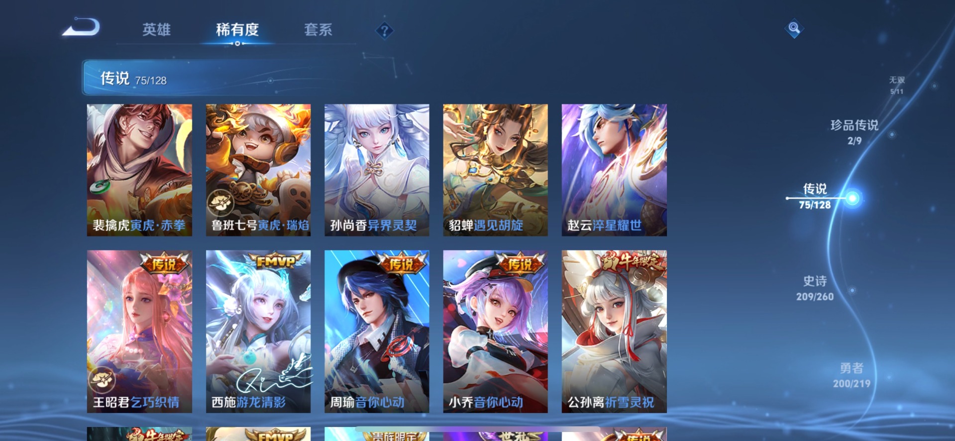 金蝉唐三藏,夏侯惇匿光决锋者,苏烈玄武志,小乔纯白花嫁,孙尚香异界灵契,牛魔奔雷神使,庄周玄嵩,镜匿光追影者,庄周云端筑梦师,周瑜真爱至上,诸葛亮时雨天司,杨玉环寅虎·心曲,司空震愿照·山河定,貂蝉逐梦之音,裴擒虎李小龙,裴擒虎天狼狩猎者,裴擒虎寅虎·赤拳,上官婉儿梁祝,上官婉儿天狼绘梦者,花木兰默契交锋,花木兰瑞麟志,花木兰青春决赛季,马可波罗山海·玄木吟,马可波罗深海之息,芈月白晶晶,云中君时之祈愿,韩信傲雪梅枪,韩信飞衡,百里守约朱雀志,澜愿照·九州拓,虞姬霸王别姬,虞姬愿照·岁时盈,王昭君凤凰于飞,嫦娥如梦令,王昭君星穹之声,大乔白鹤梁神女,甄姬幽恒,甄姬女儿国国王,甄姬至美·化雀舞,铠青龙志,廉颇寅虎·御盾,伽罗天狼溯光者,张飞虎魄,孙膑天狼运算者,孙膑寅虎·展翼,干将莫邪冰霜恋舞曲,鲁班七号寅虎·瑞焰,吕布御风骁将,后羿如梦令,公孙离祈雪灵祝,公孙离玉兔公主,公孙离蜜橘之夏,鲁班大师匿光启智者,西施至美·乘鲤谣,桑启鸣野蒿,女娲补天,女娲愿照·千秋盛,马超神威,妲己时之奇旅,妲己愿照·众生和,蔡文姬奇迹圣诞,蔡文姬愿照·福禄聚,瑶时之祈愿,瑶山海·碧波行,娜可露露前尘镜,妲己热情桑巴