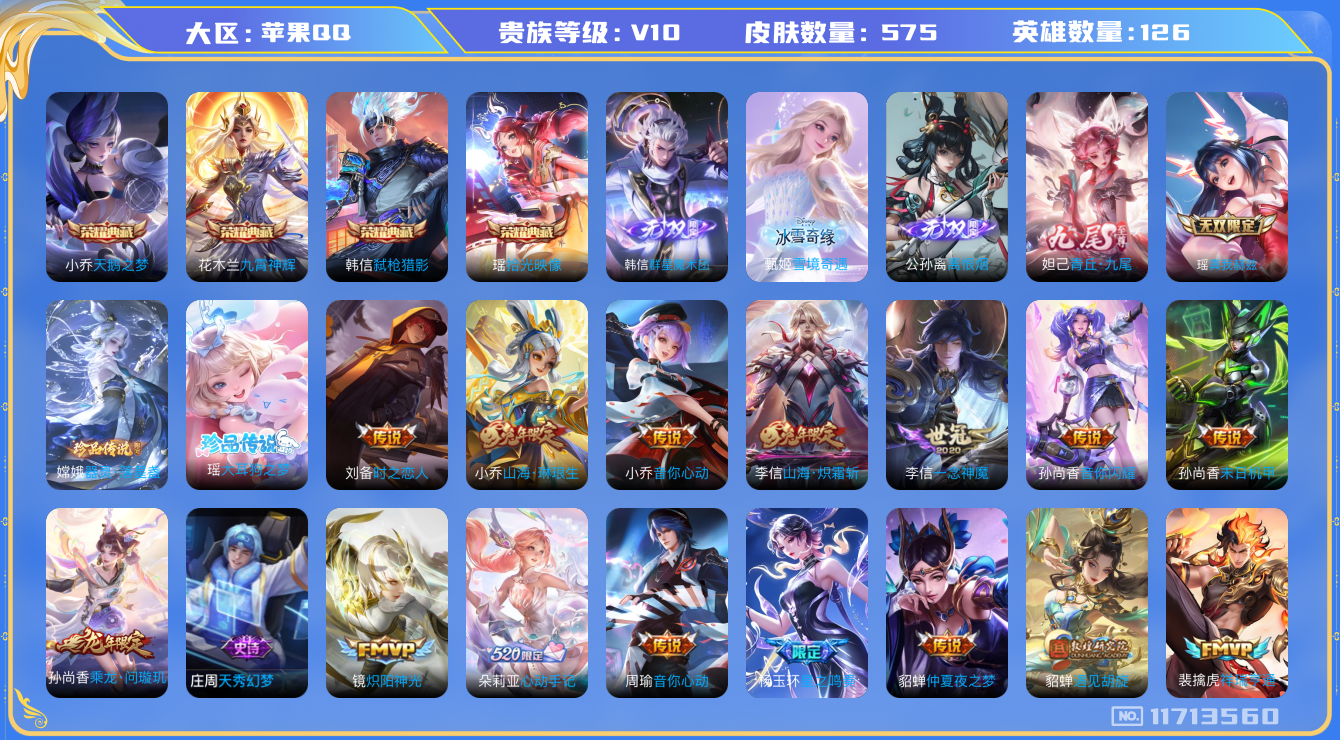 [11713560]V10 4典藏 5无双 2珍品传说 75传说 126英雄 575皮肤 典藏英雄武则天 可修改实名 优质装备:天鹅之梦(小乔典藏),九霄神辉(木兰典藏),弑枪猎影(韩信典藏),真我赫兹(瑶)(瑶无双),青丘·九尾(妲己无双),韩信群星魔术团(韩信无双),离恨烟(公孙离无双),拾光映像(瑶典藏),雪境奇遇-甄姬,器灵·落星盏,大耳狗之梦,黄金白羊座,猫影幻舞,炽阳神光,一念神魔,云霓雀翎,末日机甲-孙尚香(绿蚂蚱),仲夏夜之梦(大飞蛾),音你心动-小乔,海洋之心,音你心动-周瑜,胖达荣荣,乞巧织情,时之恋人-刘备(电焊工),游龙清影(小青龙),淬星耀世,超时空战士-狄仁杰,遇见胡旋,挚爱之约,挚爱花嫁,无双飞将,音你闪耀(rap皮),碎云,天秀幻梦,山海·炽霜斩(李信年限),山海·琳琅生(小乔年限),山海·苍雷引(电光曜子),燃星之曲,画中仙,浮生妄,记忆之芯(机甲兔),青丘·九尾,百相守梦(张飞),追逃游戏(安琪拉),电玩·雷克斯,灼幽烈阳,妄想实况,妄想奇谈,鹤归松栖(云缨),遇见神鼓,大乔-时之奇旅,永恒水手月亮,夜礼服假面,小动物乐团,澜逐花归海,艾琳觅芳踪,琥珀纪元铠,云中君群星魔术团,朵莉亚心动手记,涂山容容 传说皮:乘龙·问璇玑(孙尚香年限),乘龙·铭钟鼎(赵云年限),乘龙·淬吴钩(孙策年限),续相思,星之鸣奏,祥瑞亨通,幻光神枪 珍宝阁皮:万物之道,优雅恋人,蔷薇恋人,玩趣恶龙 限定皮:愿照·九州拓(澜年限),愿照·福禄聚(蔡文姬年限),愿照·岁时盈(虞姬年限),愿照·山河定(司空震年限),愿照·众生和(妲己年限),愿照·千秋盛(女娲年限),逐霄战戟,鸣野蒿,凤凰于飞,武陵仙君(小桃花),异界灵契(白毛香),傲雪梅枪,补天,寅虎·展翼(孙膑年限),前尘镜,星穹之声,白鹤梁神女,白晶晶,时雨天司(水龙头),神威(电光马子),飞衡(韩信年限),玄嵩(庄周年限),山海·碧波行(瑶年限),瑞麟志(木兰年限),至美·乘鲤谣,至美·化雀舞,遇见飞天,高山流水,无限倾心-虞姬,匿光决锋者,五谷丰年,青龙志(铠年限),幽恒(沐浴露),天狼运算者,游园惊梦,梁祝,御风骁将(吕布年限),天狼狩猎者,天狼溯光者,虎魄,逐梦之音,奔雷神使(牛魔年限),祈雪灵祝(雪兔子),天狼绘梦者,李小龙,玄武志(苏烈年限),朱雀志(守约年限),如梦令-嫦娥,如梦令-后羿,霸王别姬-虞姬
