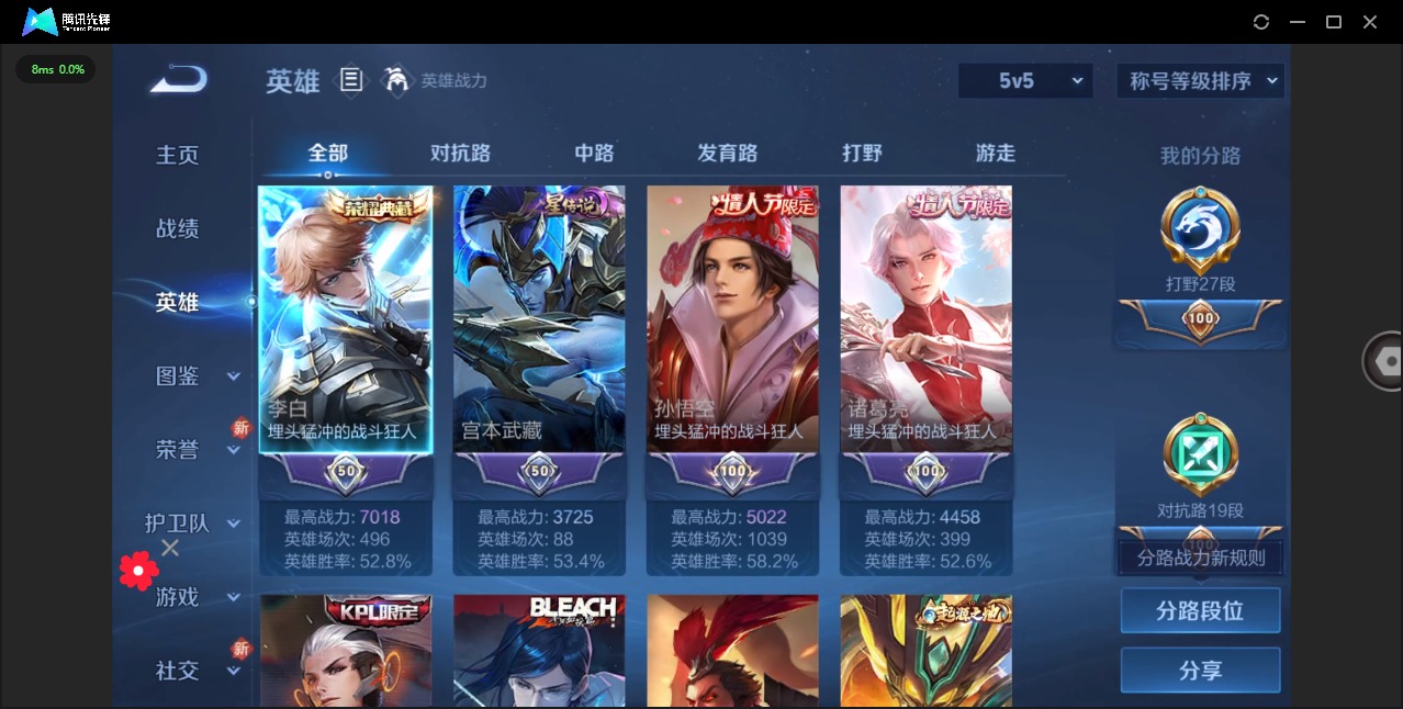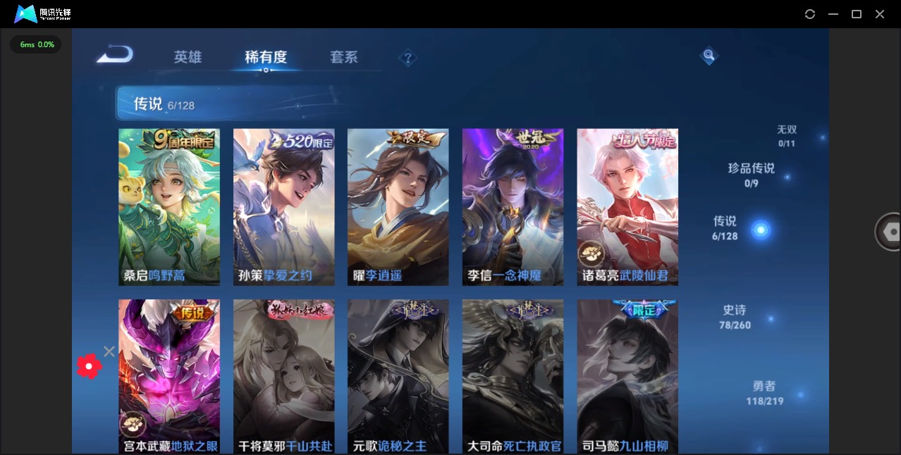 - [12145648]V6 4传说 101英雄 104皮肤 可修改实名 女号 优质装备:黄金射手座,久胜战神,末日机甲-孙尚香(绿蚂蚱),超时空战士-狄仁杰 限定皮:李小龙,逐梦之影,霸王别姬-项羽 史诗皮:紫霞仙子,白龙吟,特工魅影,千年之狐,冰冠公主,晚萤,偶像歌手,修罗,心灵骇客,幽灵船长,心灵战警,纤云弄巧,繁星吟游(呼啦呼啦),缤纷独角兽,乘风破浪,逐浪之夏,原初追逐者,鹰眼统帅