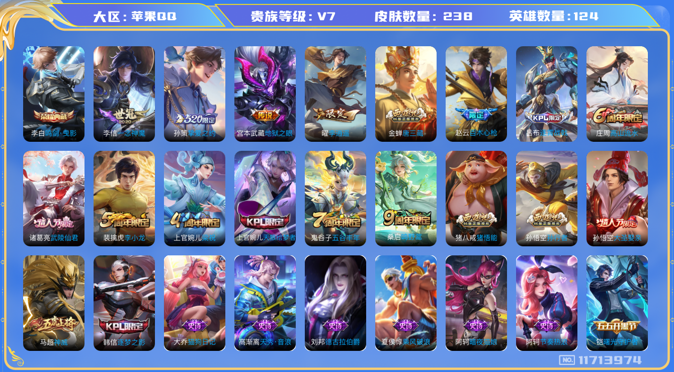 [11713974]V7 1典藏 6传说 124英雄 238皮肤 可修改实名 优质装备:鸣剑·曳影,一念神魔,地狱之眼,李逍遥,挚爱之约 珍宝阁皮:优雅恋人,女武神 限定皮:逐霄战戟,鸣野蒿,武陵仙君(小桃花),神威(电光马子),高山流水,五谷丰年,梁祝,天狼绘梦者,李小龙,逐梦之影,孙行者,猪悟能,大圣娶亲,百木心枪,唐三藏 史诗皮:星界战将,谪仙醉月,石田雨龙,决胜骁骑,紫霞仙子,电玩小子(小书包),黄金分割率,特工魅影,千年之狐,永昼,魅语,蒙恬荣光圣徽,偶像歌手,暗夜猫娘,猫狗日记-孙策,猫狗日记-大乔,乱世虎臣,节奏热浪,修罗,女仆咖啡,水果甜心,绅士熊喵,星夜王子,心灵骇客,时之奇旅-安琪拉,功夫厨神,德古拉伯爵,暗隐猎兽者,幽灵船长,鬼剑武藏,暗渊魔法,心灵战警,天秀·启明,地狱岩魂,纤云弄巧,繁星吟游(呼啦呼啦),拒霜思,缤纷独角兽,乘风破浪,逐浪之夏,水晶猎龙者,曙光守护者,箭羽风息,金属风暴,原初追逐者,圣诞狂欢,圣诞恋歌,鹰眼统帅,魅力维加斯,黎明之约,天秀·音浪,无心