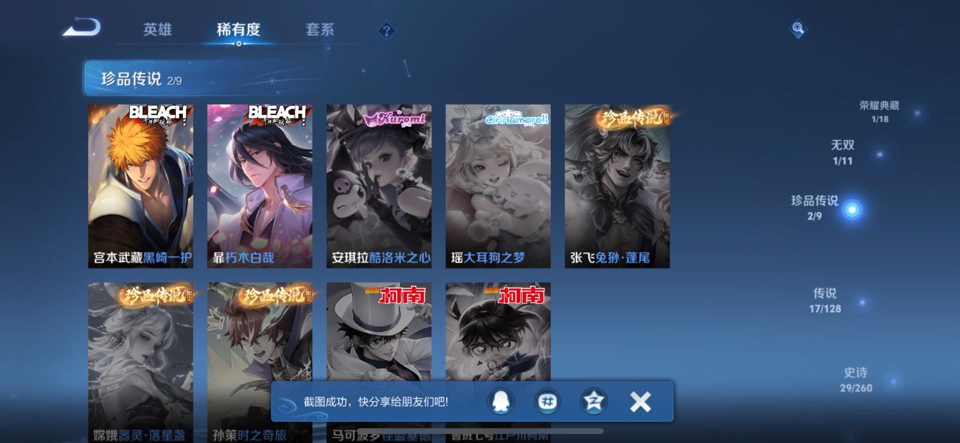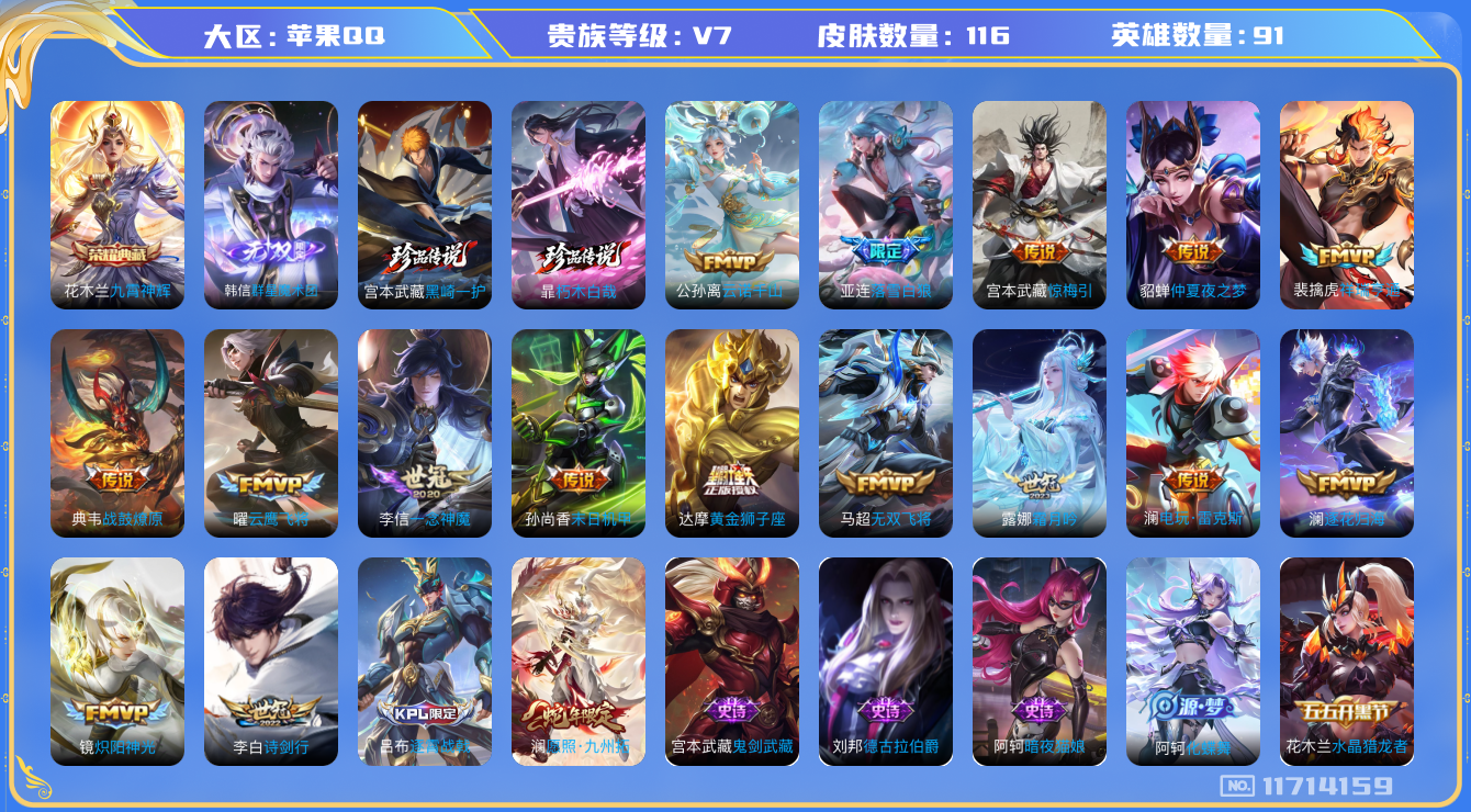 [11714159]V7 1典藏 1无双 2珍品传说 17传说 91英雄 116皮肤 可修改实名 优质装备:九霄神辉(木兰典藏),韩信群星魔术团(韩信无双),朽木白哉,黑崎一护,黄金狮子座,云鹰飞将(小将军),炽阳神光,一念神魔,末日机甲-孙尚香(绿蚂蚱),仲夏夜之梦(大飞蛾),无双飞将,电玩·雷克斯,惊梅引,霜月吟,澜逐花归海 传说皮:典韦战鼓燎原,落雪白狼,云诺千山,祥瑞亨通 限定皮:愿照·九州拓(澜年限),逐霄战戟,诗剑行 史诗皮:鸭鸭历险记-刘禅,化蝶舞,龙之律动,百相守梦-周瑜,茶境仙,幻珠鲛人,百相守梦-百里守约,百相守梦-黄忠,紫霞仙子,黄金分割率,特工魅影,偶像歌手,暗夜猫娘,猫狗日记-孙策,水果甜心,绅士熊喵,德古拉伯爵,幽灵船长,鬼剑武藏,乐园奇幻夜,水晶猎龙者,曙光守护者,圣诞狂欢,鹰眼统帅,魅力维加斯,赏金猎手