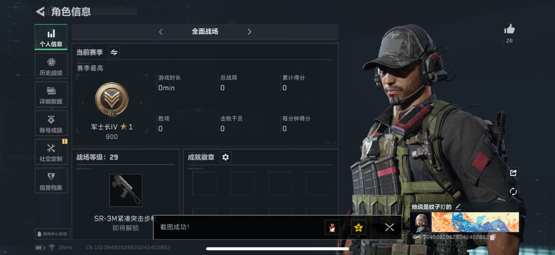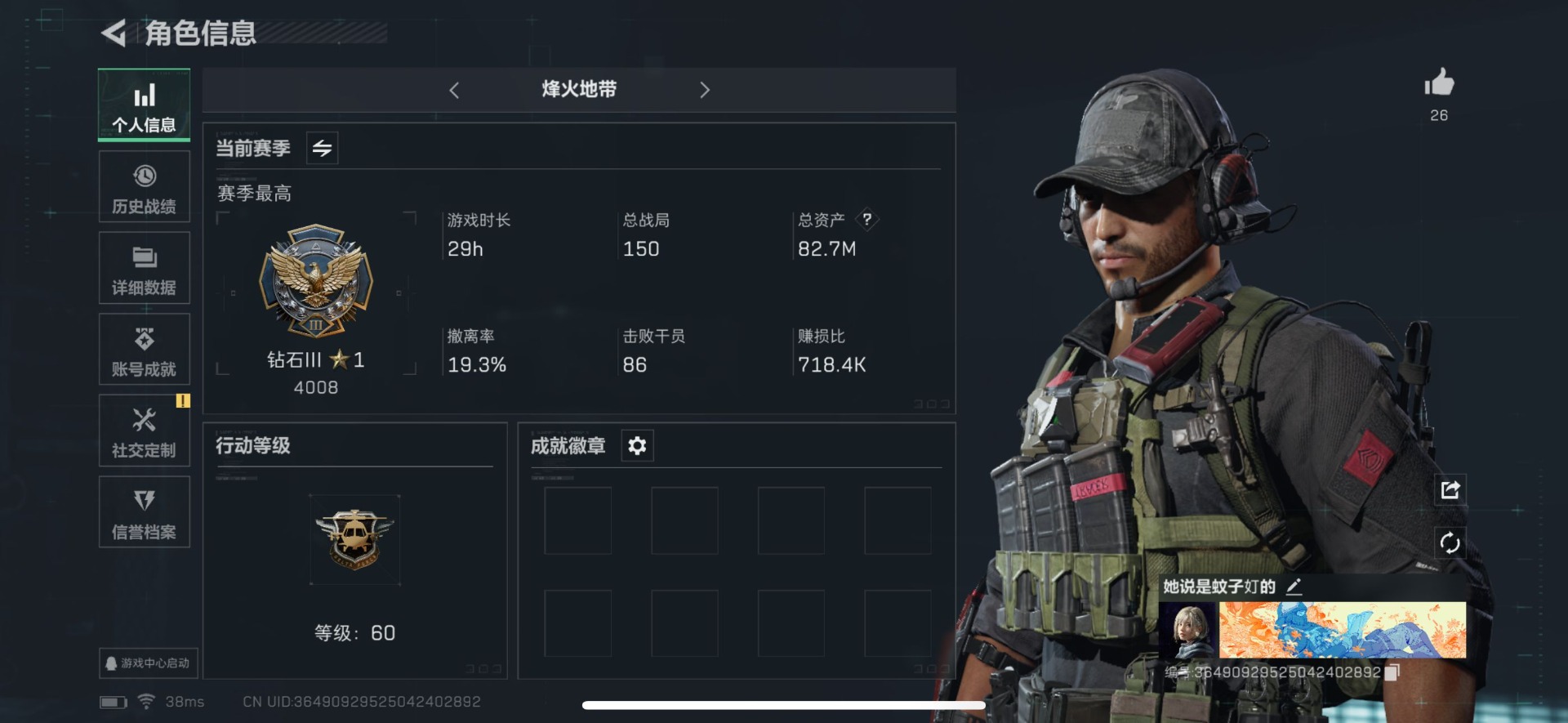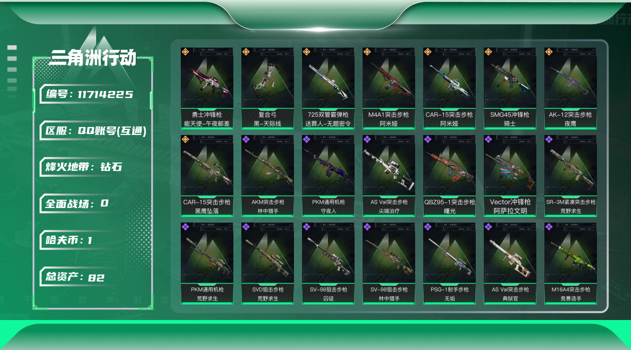 [11714225]总资产:82.7M 8传说枪械 哈夫币:1.368K 高级安全箱(2×3)9.15号到期 可二次 可修改实名 烽火地带段位:钻石 全面战场段位:军士长 传说武器皮肤:SMG45冲锋枪-骑士,勇士冲锋枪-能天使-午夜邮差,复合弓-黑-天际线,725双管霰弹枪-送葬人-无题密令,M4A1突击步枪-阿米娅,CAR-15突击步枪-阿米娅,AK-12突击步枪-夜鹰,CAR-15突击步枪-黑鹰坠落 史诗武器皮肤:M700狙击步枪-蝮蛇,G3战斗步枪-战场英杰,QJB201轻机枪-Old Habits,PKM通用机枪-守夜人,AS Val突击步枪-尖端治疗,SR-25射手步枪-尖端治疗,AKM突击步枪-林中猎手,.357左轮-幸运时刻,M16A4突击步枪-竞赛选手,SV-98狙击步枪-林中猎手,PTR-32突击步枪-英雄,AS Val突击步枪-典狱官,SV-98狙击步枪-囚徒,PSG-1射手步枪-无垢,SVD狙击步枪-荒野求生,SR-3M紧凑突击步枪-荒野求生,PKM通用机枪-荒野求生,QBZ95-1突击步枪-曙光,Vector冲锋枪-阿萨拉文明,PKM通用机枪-英雄,M700狙击步枪-竞技风