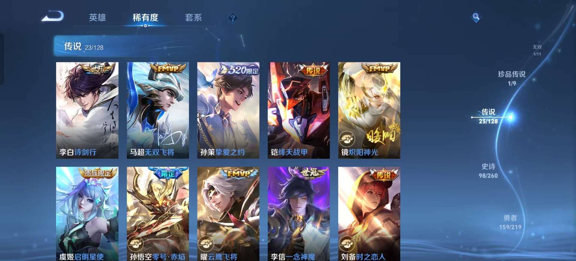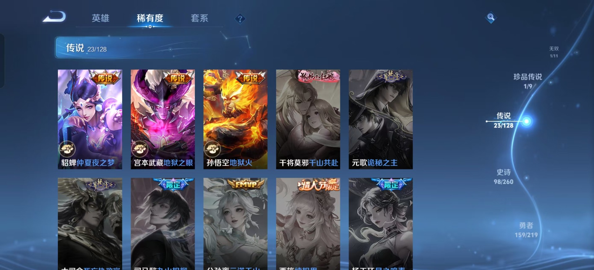 黄忠烈魂,曹操天狼征服者,干将莫邪冰霜恋舞曲,后羿如梦令,裴擒虎李小龙,上官婉儿梁祝,李白诗剑行,桑启鸣野蒿,猪八戒猪悟能,女娲愿照·千秋盛,孙悟空孙行者,孙悟空至尊宝,芈月白晶晶,孙悟空美猴王,马超神威,韩信傲雪梅枪,虞姬愿照·岁时盈
