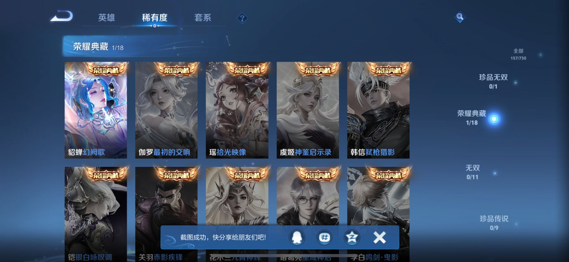 铠曙光守护者,曹操幽灵船长,伽罗箭羽风息,小乔缤纷独角兽,不知火舞魅语,项羽苍穹之光,吕布末日机甲,诸葛亮黄金分割率,刘禅天才门将,宫本武藏鬼剑武藏,貂蝉圣诞恋歌,花木兰水晶猎龙者,安琪拉心灵骇客,嬴政摇滚巨星,百里玄策原初追逐者,雅典娜冰冠公主,雅典娜黎明之约,李元芳逐浪之夏,百里守约特工魅影,墨子龙骑士,娜可露露晚萤