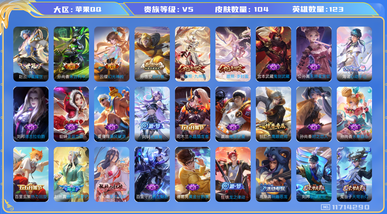 - [12191281]V7 1典藏 12传说 125英雄 237皮肤 可修改实名 优质装备:鸣剑·曳影,黄金狮子座,炽阳神光,一念神魔,末日机甲-孙尚香(绿蚂蚱),李逍遥,时之恋人-刘备(电焊工),浮生妄,电玩·雷克斯,澜逐花归海 珍宝阁皮:胡桃夹子,蔷薇恋人,女武神 限定皮:鸣野蒿,齐天大圣,五谷丰年,冰锋战神,梁祝,李小龙,蜜橘之夏,寅虎·赤拳(老虎年限),玉兔公主,山海·玄木吟(马可年限) 史诗皮:龙之律动,石田雨龙,蔬乡物语(鲁班七号),紫霞仙子,苍穹之光,电玩小子(小书包),白龙吟,特工魅影,千年之狐,百相守梦(刘备),电玩·爆裂旋风,江河有灵,百解令(蒙犽),高渐离燃音魔法,蒙恬荣光圣徽,偶像歌手,晚萤,末日机甲-吕布,猫狗日记-孙策,猫狗日记-大乔,时之恋人-孙尚香,乱世虎臣,节奏热浪,修罗,女仆咖啡,水果甜心,天才门将,星夜王子,德古拉伯爵,暗隐猎兽者,幽灵船长,鬼剑武藏,心灵战警,舞动绿茵,纤云弄巧,拒霜思,乘风破浪,逐浪之夏,水晶猎龙者,热力回旋,金属风暴,原初追逐者,圣诞狂欢,圣诞恋歌,鹰眼统帅,暗夜贵公子,魅力维加斯,赏金猎手,无心,未来纪元-赵云
