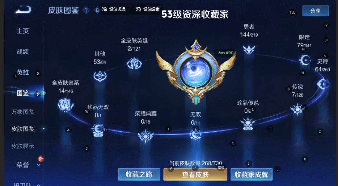 - PX_2105713-实名: 可修改 贵族等级: V6 英雄数: 88 皮肤数: 96 珍品传说: 器灵·落星盏 限定皮: 玉兔公主,鸣野蒿,愿照·众生和