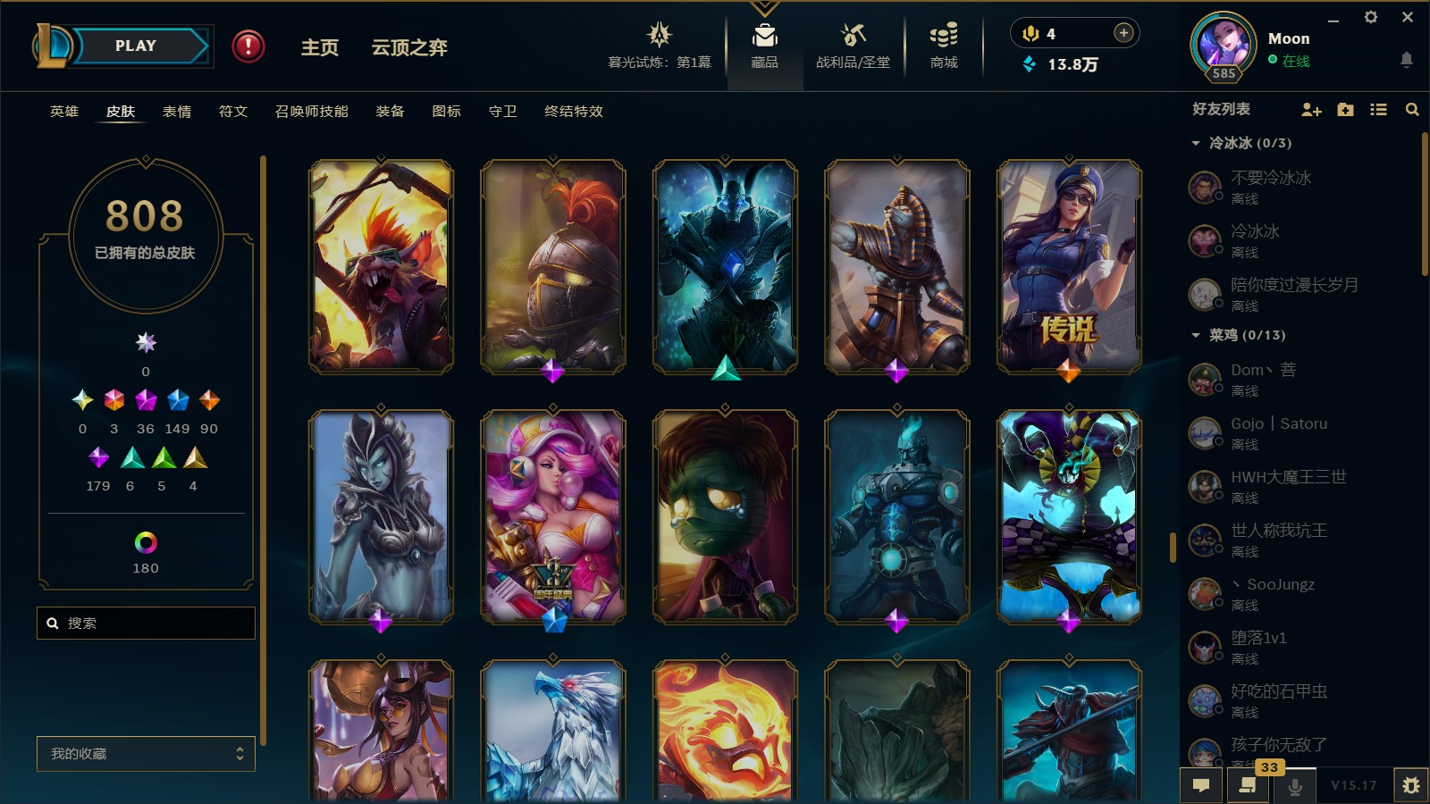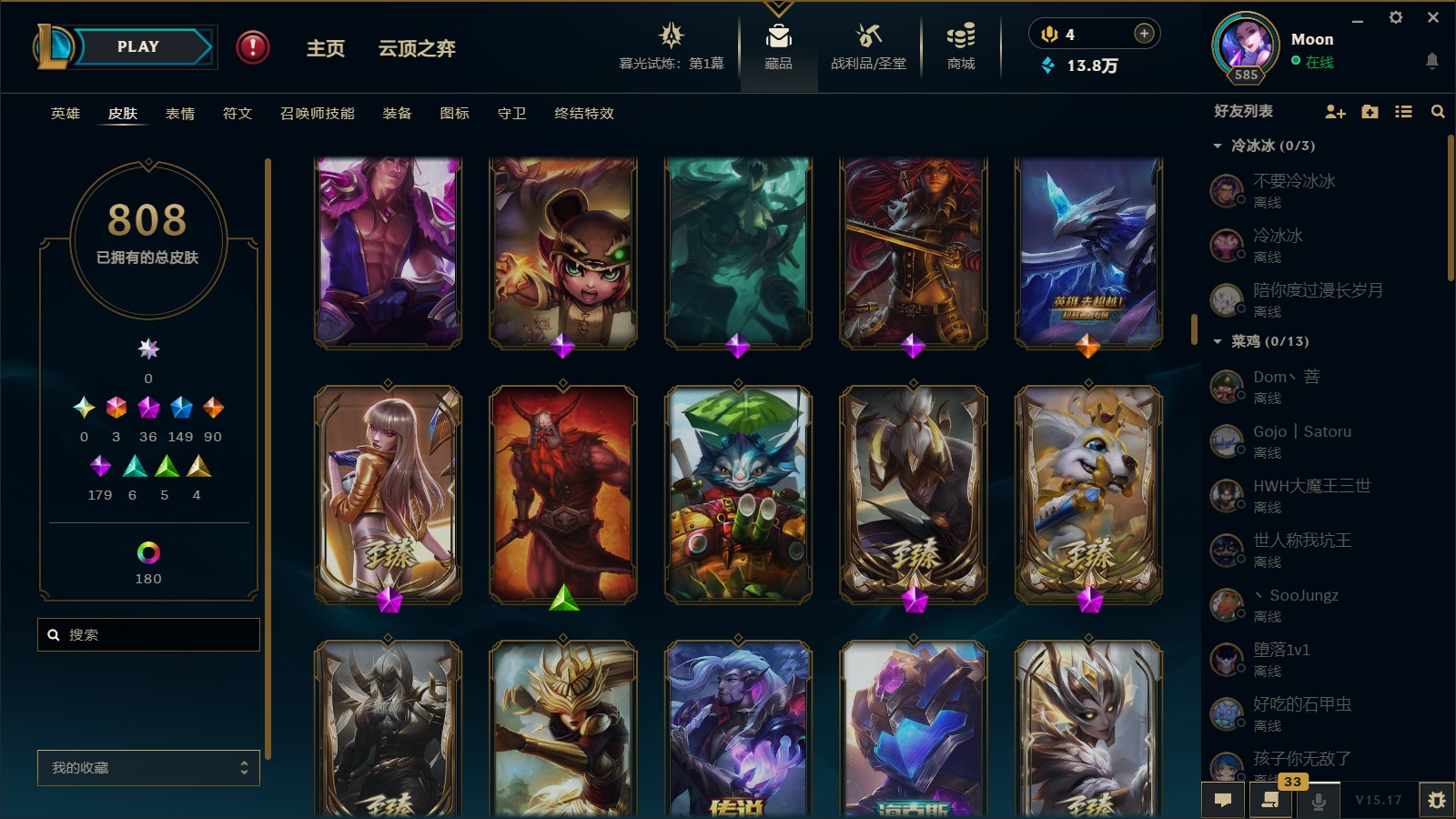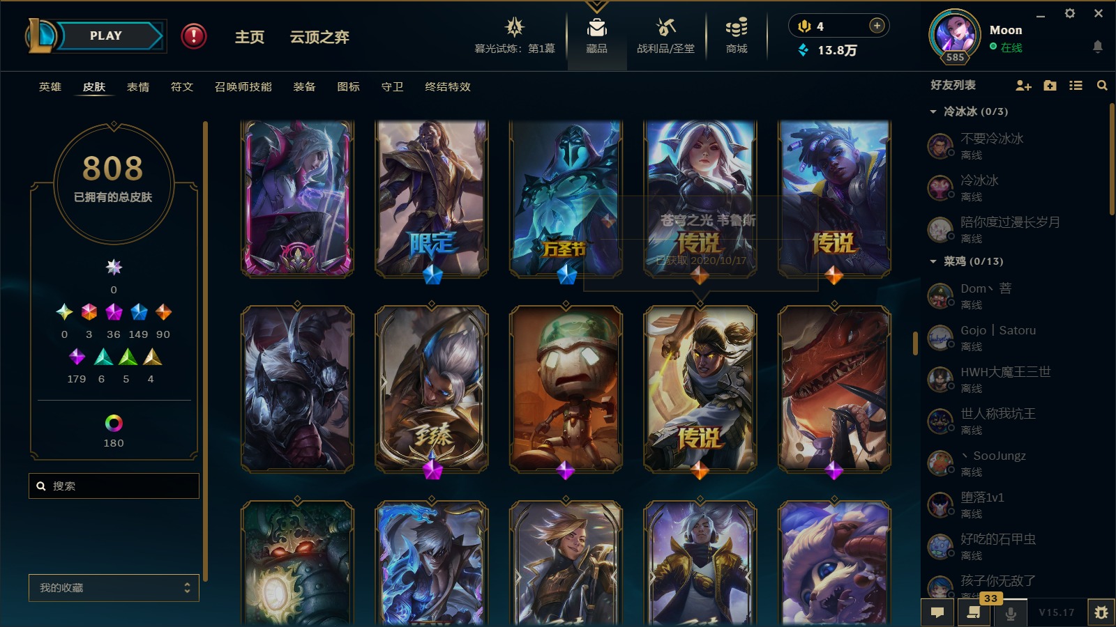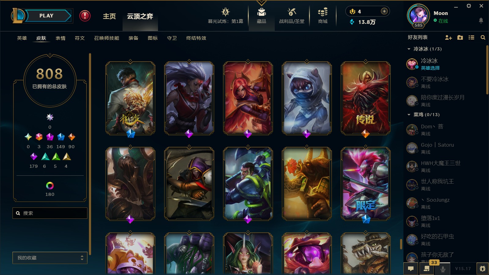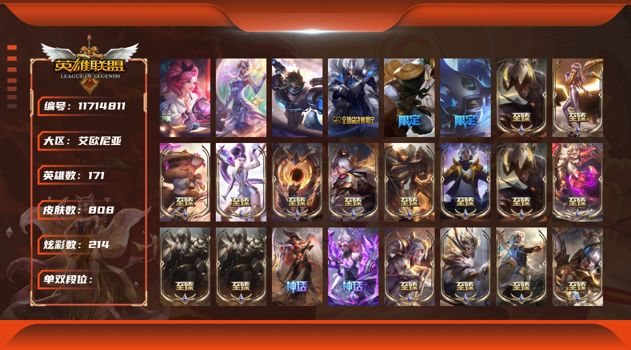 [11714811]3终极 36神话 149限定 90传说 179史诗 808皮肤 214炫彩 171英雄 可二次 可修改实名 优质装备:至臻 源计划:正义 艾瑞莉娅,至臻 腥红之月 亚托克斯,至臻 王国机神玄武 盖伦,至臻 黑夜使者 李青,至臻 绒毛菲兹,至臻 K/DA 卡莎,至臻 暗星 墨菲特,至臻 魔女 婕拉,至臻 女帝 黛安娜,至臻 原计划:逆流 塞拉斯,至臻 战斗学院 蕾欧娜,至臻 征服者 贾克斯,至臻 灵能特工 伊泽瑞尔,至臻 灵魂莲华 提莫,至臻 神龙尊者 炎龙瑟提,至臻 K/DA ALL OUT卡莎,至臻 真实伤害 亚索,至臻 黑夜使者 凯隐,至臻 神龙尊者均衡之龙 沃利贝尔,养蜂人 辛吉德,防爆天使 凯尔,暗影 沃里克,巧克力工坊 波比,地底世界 崔斯特,电玩战魂 人马,都铎王朝 图奇,防爆机器人 布里茨,防爆士兵 格雷福斯,钢铁之翼 凤凰,冠军掠夺者 卡兹克,冠军之矛 滑板鞋,冠军之刃 锐雯 2016,冠军之血 希瓦娜,惊悚派对 阿木木,警用试作体K-9 内瑟斯,克格汪 克格莫,密林猎手 提莫,野兽猎人 德莱文,野兽猎人 泰达米尔,勇者 阿狸,勇者 奈德丽,御魔星矢 寒冰,征服者 韦鲁斯,大元素使,未来战士,K/DA ALL OUT-萨勒芬妮 独立音乐人,灰烬杀手 塞拉斯,2021 全球总决赛 嘉文四世,玉剑传说 无极 白虎,吕布 奉先 炫金战神,泳池派对 奥莉安娜 优雅珠光鲸,神龙尊者 圣龙李青 龙腾云起,张辽 文远 炫金将军,冠军之刃 锐雯 2016 凯旋圣装,霸天战士 雷恩加尔 星啸天火,西部魔影 卢锡安 贝利尔之怠,无畏骑士 瑟庄妮 赤子初心,灵魂莲华 锐雯 流火,外星装甲 库奇,最终BOSS 维迦 里・大魔王,可爱可爱粉红红 布里茨,至臻 黑夜使者 李青(2022),至臻 绒毛 菲兹(2022),至臻 腥红之月 亚托克斯(2022),至臻 绒毛 菲兹,星之守护者 辛德拉 未来之光,净雪之月 莫甘娜 冬虹,墨之影武者 亚索 金墨耀影,水晶圣骑 蕾欧娜,水晶圣骑 艾希,暗星 科加斯,西部魔影 炽天使 永恩,灌篮高手 德莱厄斯 金色神话,心之钢 伊泽瑞尔 天纵才华,魔女 阿卡丽 虚荣,王国机神 白虎 贾克斯 云霄,天龙之子 黛安娜 玉龙舞夜,暗裔英雄 盖伦 至臻:西部魔影 炽天使 永恩,水晶圣骑 艾希,水晶圣骑 蕾欧娜 海克斯:海克斯 嘉文四世,恐惧新星 德莱厄