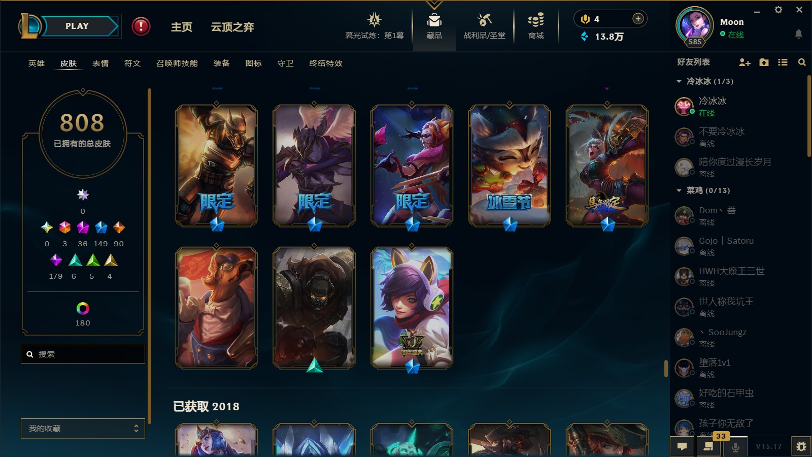 - [11927694]可二次 可修改实名 1神话 18传说 51史诗 136皮肤 109英雄 大师 皮肤:菲奥娜-绯金丽刃,菲奥娜-泳池派对,菲奥娜-皇家守卫,菲奥娜-源计划:火,金克丝-夜星流火,金克丝-星之守护者,金克丝-末路狂花,金克丝-光耀之芒,艾希-王牌司令,艾希-西部天使,艾希-极地女神,艾希-源计划:联合,崔斯特-王牌舰长,崔斯特-星域游侠,崔斯特-未来战士,崔斯特-地底世界,璐璐-光耀之灵,璐璐-邪恶女巫,璐璐-泳池派对,亚索-灵魂莲华,亚索-西部牛仔,亚索-黑夜使者,劫-天煞,劫-冲击之刃,劫-源计划:阴,崔丝塔娜-我,羽饰骑士,崔丝塔娜-欧米伽小队 魔鬼伞兵,崔丝塔娜-驯龙炮手,加里奥-冠翎巨神像,加里奥-地狱火,加里奥-风执事,李青-地下拳王,李青-泳池派对,李青-神拳,内瑟斯-单身贵族,内瑟斯-创世魔神,内瑟斯-炼狱魔犬,德莱厄斯-西部魔影,德莱厄斯-热血班长,德莱厄斯-神王,德莱文-绯金战斧,德莱文-破败军团