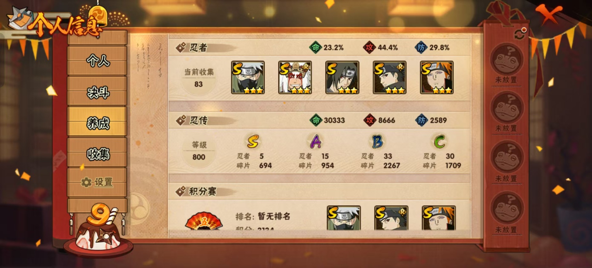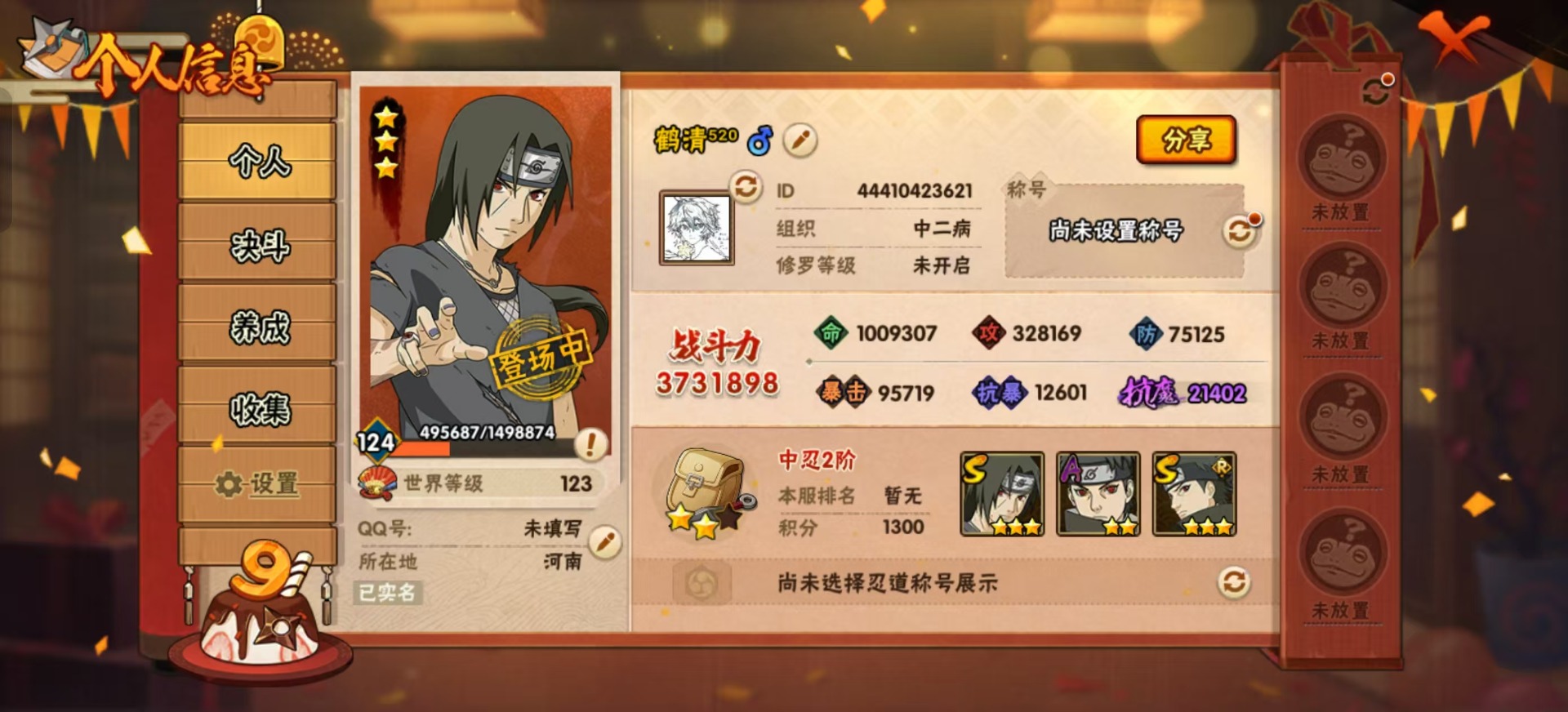 [11714824]V9 5S忍 15A忍 15通灵 373.1W战力 可二次 可修改实名 优质装备:宇智波止水「须佐能乎」,旗木卡卡西「须佐能乎」 S级忍者:自来也 「舞之豪杰」,宇智波鼬 「须佐能乎」,佩恩「天道」