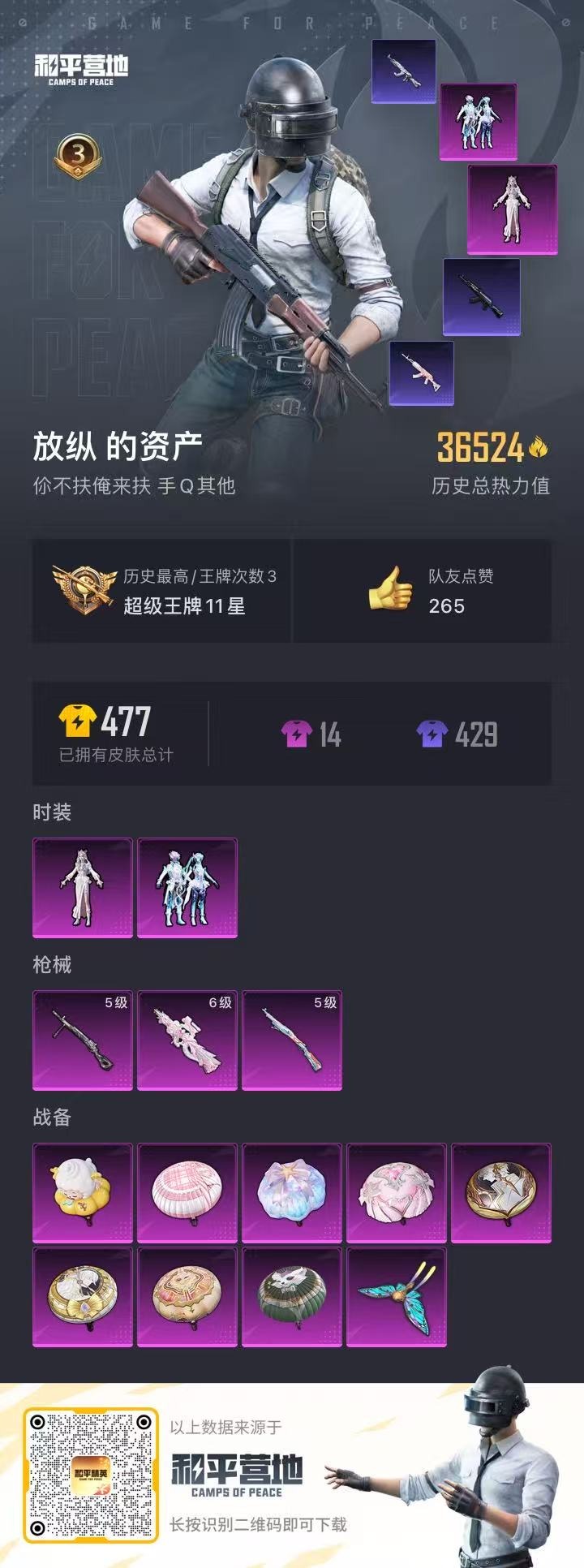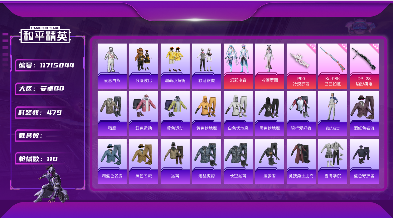 [11715044]2粉装 3特效枪 3印记 可二次 可修改实名 优质装备:幻彩电音,冷漠罗丽,P90-冷漠罗丽,Kar98K-巳巳如意 热门装扮:软萌银虎,潮萌小黄鸭,爱崽白熊,浪漫波比 稀有枪皮:DP-28-豹影疾电 六级特效枪:六级P90-冷漠罗丽 五级特效枪:五级Kar98K-巳巳如意,五级DP-28-豹影疾电 紫色装扮:香榭午后,SS31特训套装,SS5特训,人气偶像,冰川特警,冷焰舞者,凛冬战士,北国孤狼,旭日情侣,云朵鹅,彩虹兔,雪绒豹,SS33特训套装,青涩时光,顶瓜瓜,时希公主,灵公主,乐音,SS14特训,萌趣颜团子,都市魅力,酒红色名流,长空猛禽,迅猛虎鲸,雪山征服者,雪山精英,雪鹰学院,青春校园,缤纷果语,蓝色守护者,街头潮人,超能勇士,青涩年华,无面战甲,骑行爱好者,魅力单车,黄色伏地魔,黄色名流,黄色运动,黑色伏地魔,龙魂突击队,缤纷假日,暗金炫舞,深蓝色名流,幻影武者,圣诞大吉,夜莺强袭者,完美偶像,帅气教官,战地督导,湖蓝色名流,绮丽涂鸦,疯狂小兔子,白熊同盟,白色伏地魔,破晓战魂,破蛋小黄鸡,神秘领域,福星高照,竞技勇士朋克,竞技达人朋克,红色运动,王牌教练,潮流先锋,熔岩使者,牛气满满,猛禽,特战装甲,狂战萌兔,猎鹰,异域银装,竞技名士,SS24特训(SS24特训套装),浪漫天命,精神漫游,炽焰拳师,格斗专家,SS6特训,核芯基因,SS7特训,迷域探索者,SS8特训,玄武圣者,大橘大利,星渊小夜曲,原初圣火,逆风勇士,SS12特训,纯白誓言,SS9特训,暗夜契约,春日漫步,粉恋花,蓝冰羽,紫幽梦,SS32特训服(SS32特训套装),白糯汤圆,糖霜甜心,新风雅兰,恋语绒绒,漫步者,街舞之王,丛林猎人,传奇侦探,海上生明月 优质战备:时光之誓降落伞,时光之吻降落伞,冷漠罗丽降落伞,喜羊羊与灰太狼降落伞,荧海星豚降落伞,第五大道降落伞,飞行器-春暖花开,精灵迷巫降落伞