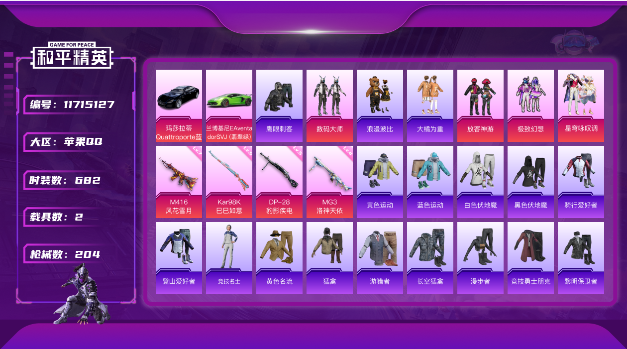[11715127]5粉装 4特效枪 2载具 10印记 可二次 可修改实名 女号优质装备:兰博基尼Aventador SVJ(翡翠绿),玛莎拉蒂Quattroporte(夜幕蓝),MG3洛神天依,数码大师,放客神游,极致幻想,M416风花雪月,七级M416-风花雪月,星穹咏叹调,Kar98K-巳巳如意 热门装扮:大橘为重,鹰眼刺客,浪漫波比 稀有枪皮:DP-28-豹影疾电 五级特效枪:五级Kar98K-巳巳如意,五级DP-28-豹影疾电 四级特效枪:四级MG3-洛神天依 紫色装扮:SS22特训,SS23特训,娇憨猪猪,萌趣咩咩,SS21特训,SS31特训套装,SS5特训,冰川特警,决胜时刻,冷焰舞者,北国孤狼,旭日情侣,SS30特训套装,SS33特训套装,SS20特训,青春冒险家,潮流游乐家,SS15特训,暗夜傀儡,时空追击者,暴风机械师,SS16特训,遗落祭司,银白舞王,SS13特训,浪漫樱花,治愈之星,科技之星,SS14特训,诡面顽熊,萌趣颜团子,SS19特训,英勇保护者,甜心亚梦,虚音幻奏,瑞龙福将,团圆交子,醒狮腾龙,SS17特训,SS18特训,智慧隐士,都市漫游者,都市魅力,酷潮明星,野性战心,野性战魂,长空猛禽,雪山征服者,雪山精英,缤纷果语,耀眼新星,荣耀,蓝色守护者,蓝色运动,虎虎生威吉莉,超能勇士,风行保卫者,飞行日记,龙腾端午,骑行爱好者,魅力单车,鹤鸣,麻辣教官,黄色名流,黄色运动,黎明保卫者,黑色伏地魔,龟仙人,蝶变,香桃花海,沙漠毒蛇,极地朋克,极速红龙,柠萌假日,格斗先锋,沙漠兵团,滨海假日,幻影武者,坚韧舞者,娴静芝兰,夏日音浪,夜莺强袭者,完美偶像,帅气教官,幻世战舞者,怒火燎原,探宝勇士,滨海厨神,绮丽涂鸦,疯狂小兔子,登山爱好者,白色伏地魔,破晓情侣,破晓战魂,破蛋小黄鸡,神秘领域,甜蜜告白,游猎者,福星高照,竞技勇士朋克,甜蜜熊情侣,牛气冲天,灰色格斗者,灿烂千阳,热血青春,燃烧卡路里,牛气满满,猛禽,特战英豪,特战装甲,狂沙舞者,镭射皇者,SS29特训,星途旅人,热情海星,SS28特训,鱼渊荷华,玉兔迎春,燕燕于飞,巳巳如意,竞技名士,绒宝小鹅,摩登魅猫,街头风暴,许七安,惊鸿侠骨,神气柴柴,懵萌河马,SS24特训(SS24特训套装),SS25特训,绝对偶像,锦衣飞扬,粉红小猪,SS27特训,浪漫天命,小丑鱼,SS26特训,智谋强哥,精神漫游