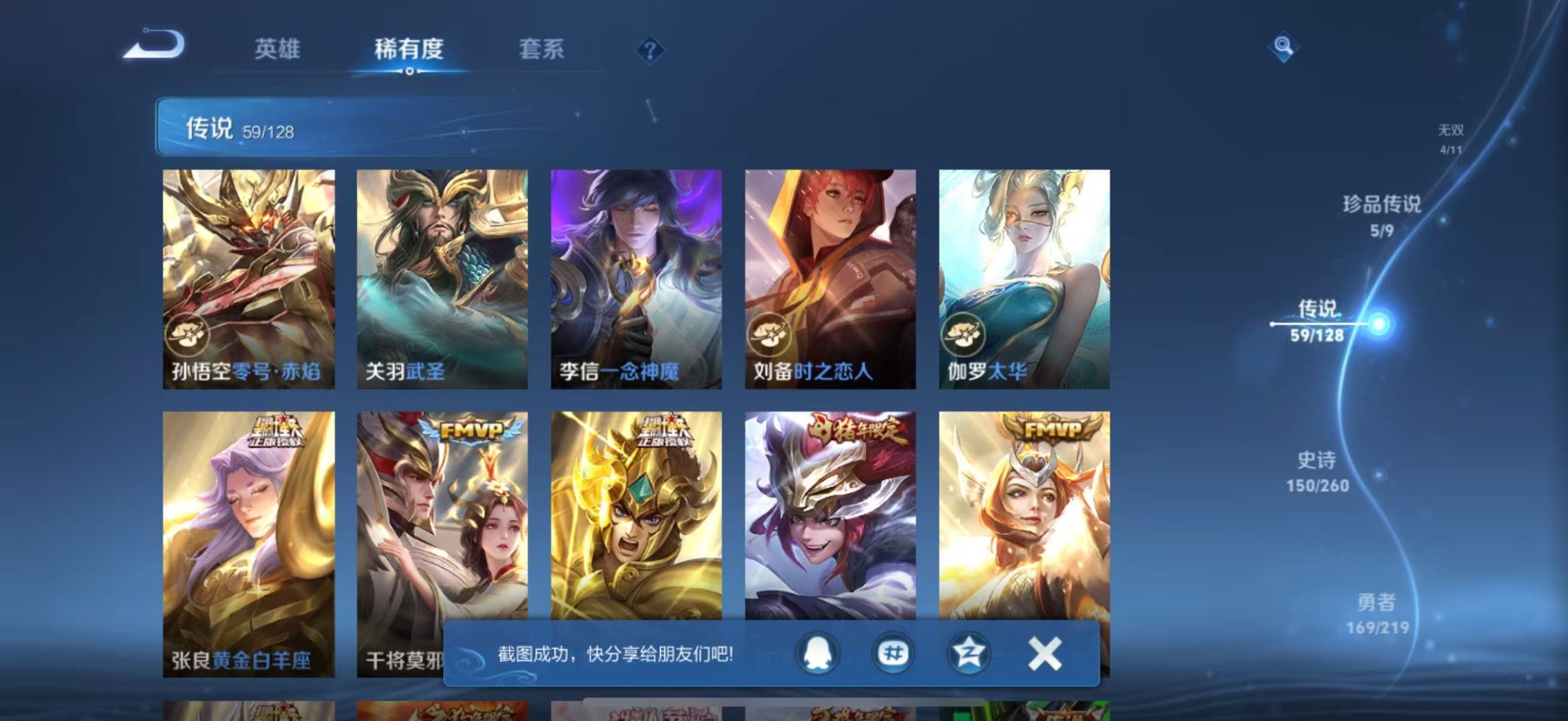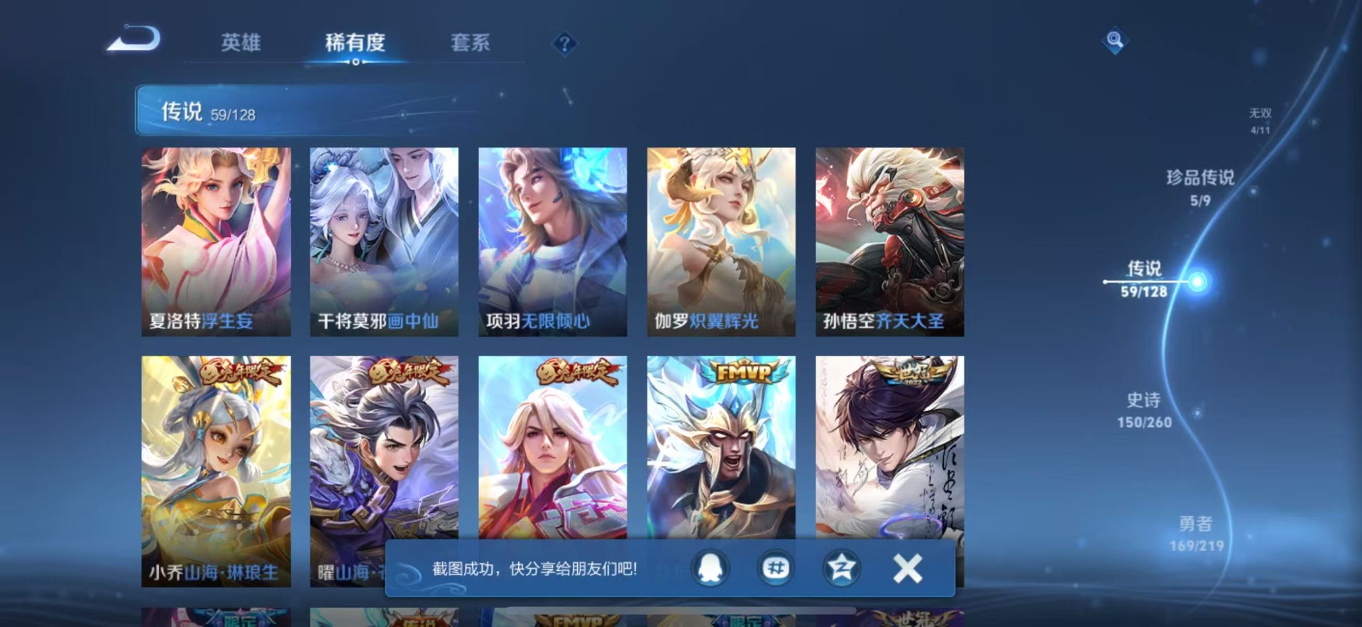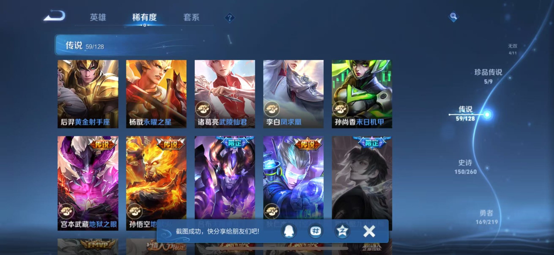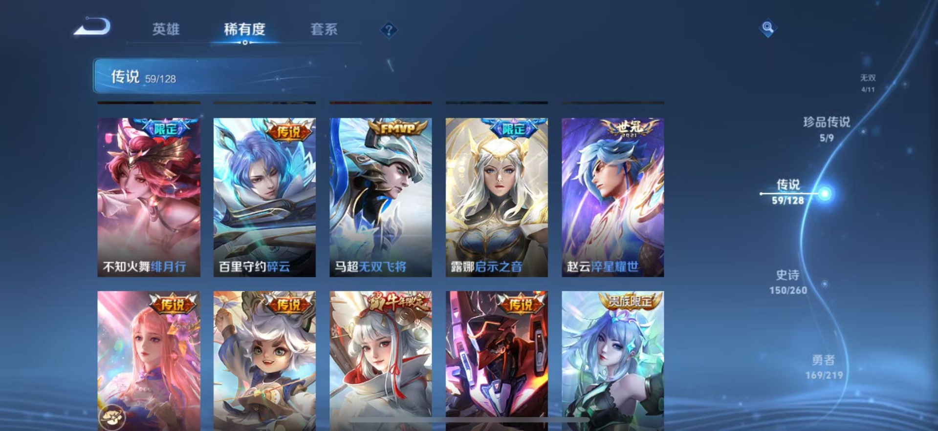 - PX_2073073-贵族等级: V6 英雄数: 118 皮肤数: 71 传说皮: 炽阳神光,一念神魔,无双飞将 限定皮: 孙行者,五谷丰年