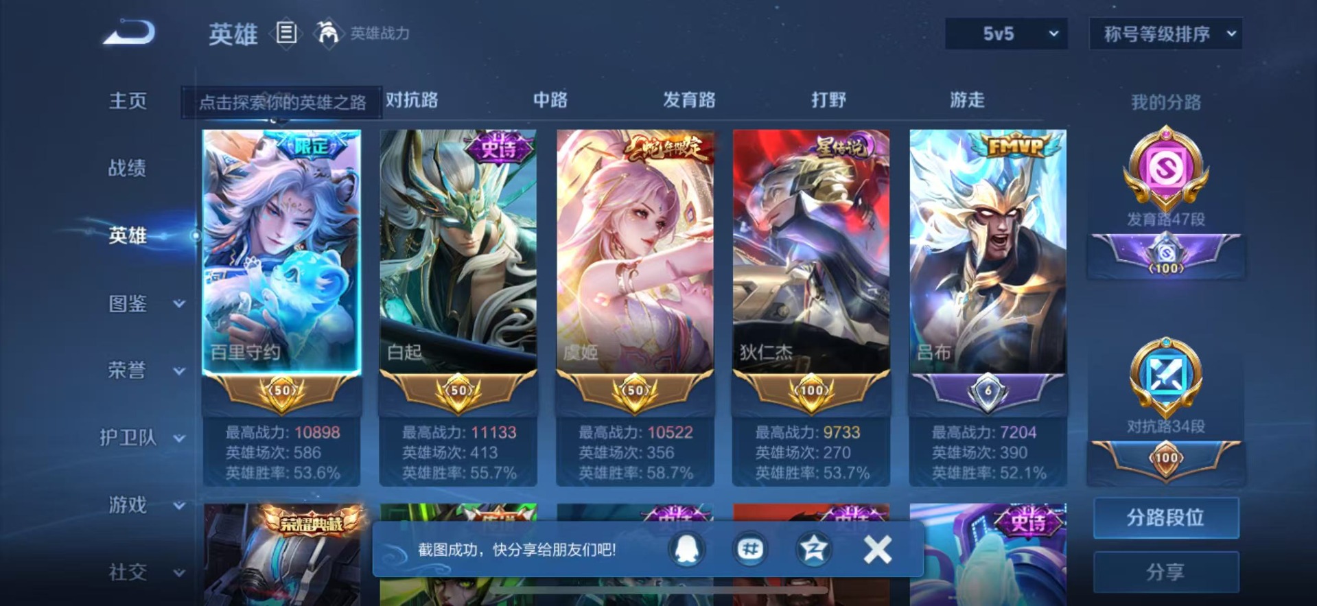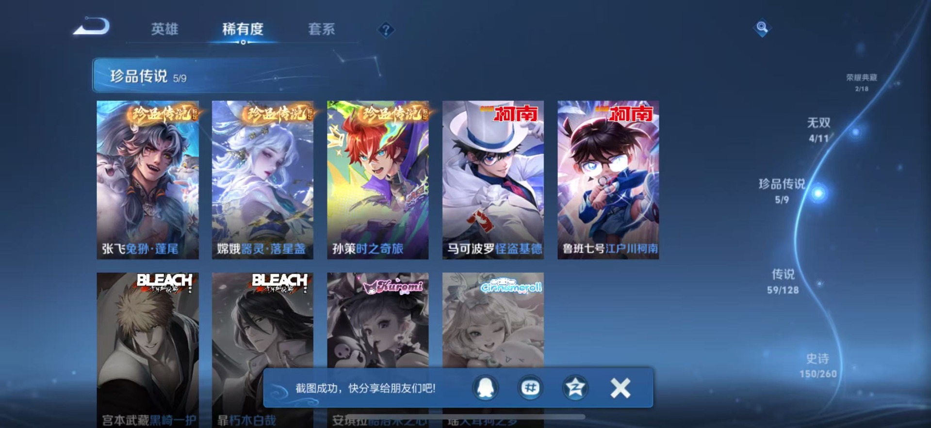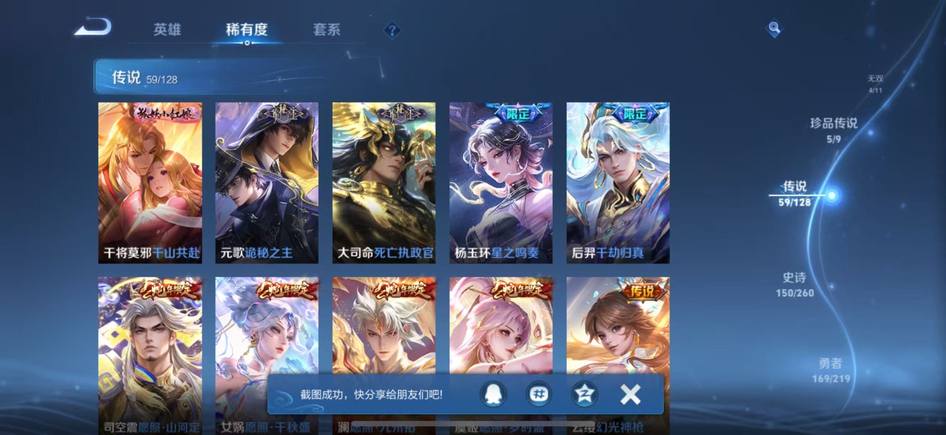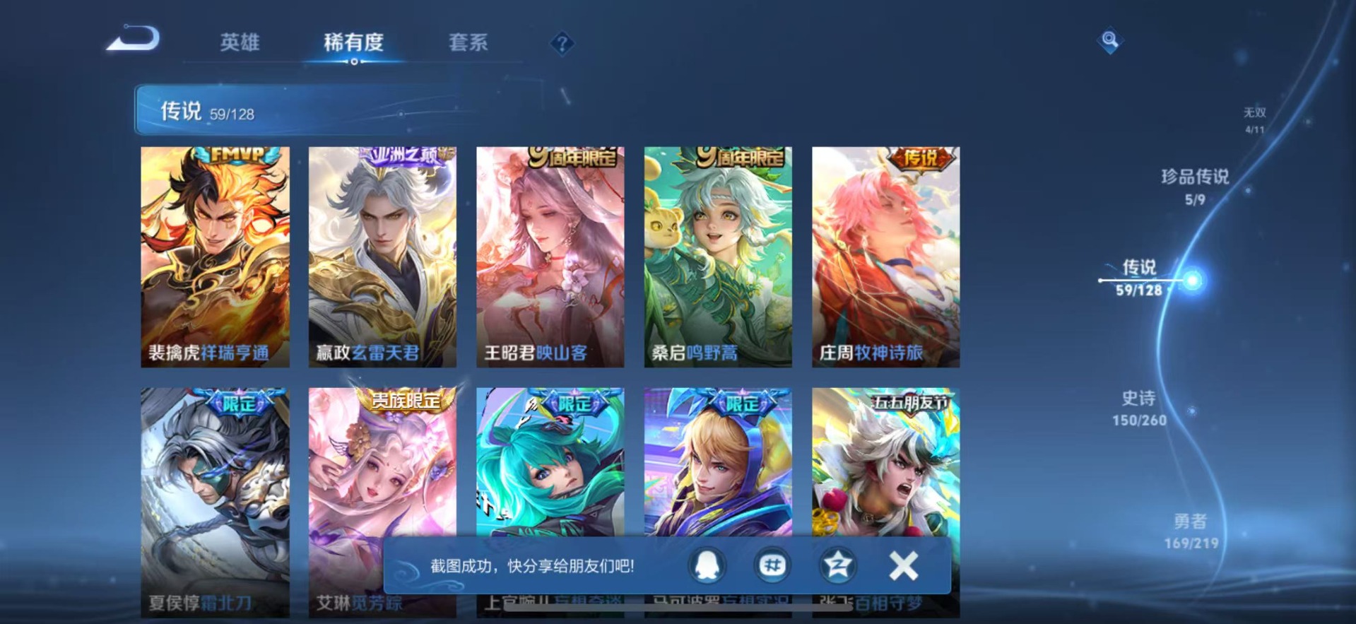 - PX_2073073-贵族等级: V6 英雄数: 118 皮肤数: 71 传说皮: 炽阳神光,一念神魔,无双飞将 限定皮: 孙行者,五谷丰年