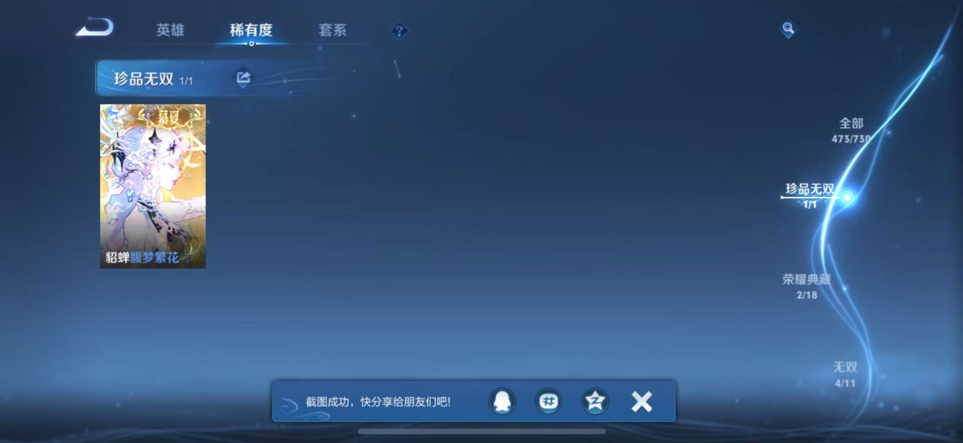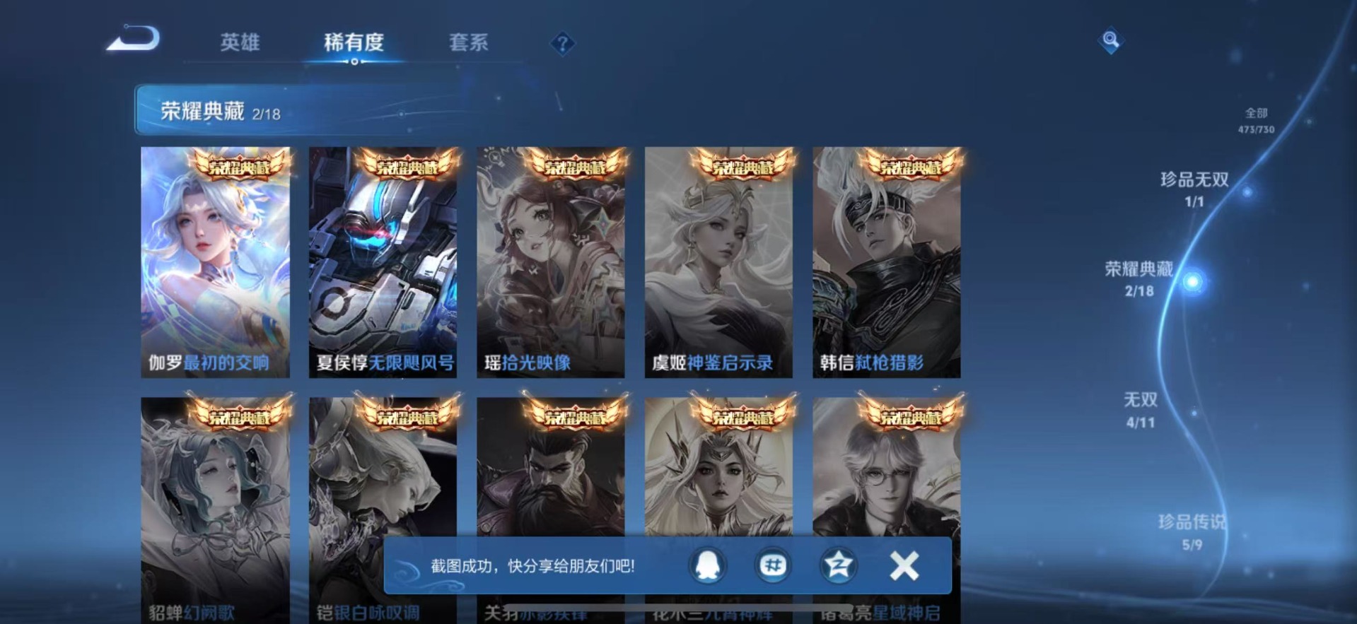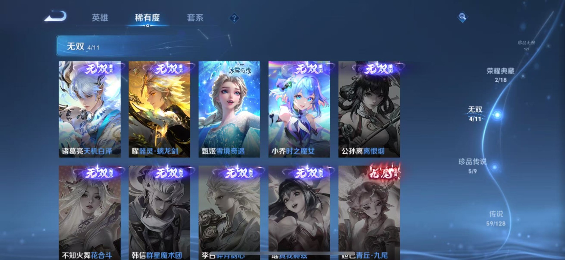 大乔白鹤梁神女,夏侯惇霜北刀,黄忠烈魂,哪吒逐梦之翼,甄姬幽恒,盾山梦圆繁星,铠青龙志,曹操天狼征服者,伽罗太华,苏烈玄武志,干将莫邪冰霜恋舞曲,典韦岱宗,不知火舞绯月行,项羽霸王别姬,后羿如梦令,露娜启示之音,后羿辉光之辰,露娜一生所爱,庄周云端筑梦师,公孙离祈雪灵祝,司空震愿照·山河定,公孙离蜜橘之夏,貂蝉逐梦之音,鲁班大师匿光启智者,裴擒虎李小龙,裴擒虎天狼狩猎者,东皇太一逐梦之光,上官婉儿梁祝,上官婉儿神器·万象笔,李白诗剑行,花木兰瑞麟志,花木兰青春决赛季,马可波罗逐梦之星,马可波罗山海·玄木吟,艾琳陌上桑,西施至美·乘鲤谣,桑启鸣野蒿,女娲愿照·千秋盛,孙悟空大圣娶亲,芈月白晶晶,孙悟空至尊宝,孙悟空美猴王,百里玄策白虎志,马超神威,赵云引擎之心,盘古冰霜神祇,韩信飞衡,韩信逐梦之影,百里守约朱雀志,蔡文姬奇迹圣诞,墨子降魔,瑶山海·碧波行,澜愿照·九州拓,虞姬霸王别姬,虞姬愿照·岁时盈,妲己热情桑巴,王昭君凤凰于飞,嫦娥如梦令,王昭君映山客,关羽武圣,关羽冰锋战神