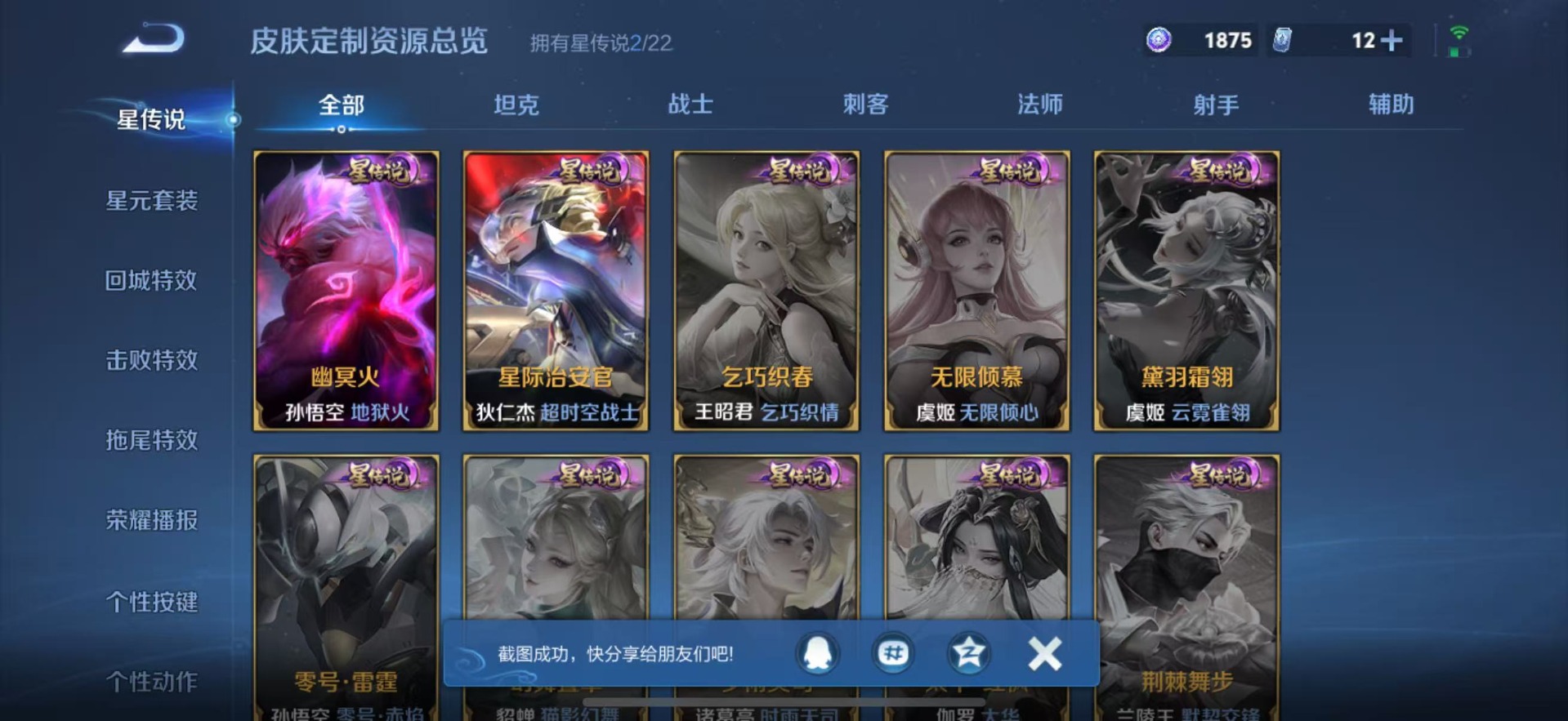 刘备时之恋人,铠绛天战甲,张飞百相守梦,赵云淬星耀世,干将莫邪久胜战神,干将莫邪画中仙,李信一念神魔,达摩黄金狮子座,王昭君乞巧织情,后羿千劫归真,庄周牧神诗旅,杨玉环星之鸣奏,裴擒虎祥瑞亨通,夏洛特浮生妄,艾琳觅芳踪,嬴政玄雷天君,张良黄金白羊座,孙悟空零号·赤焰,马超无双飞将,李元芳飞鸢探春,百里守约碎云,云缨幻光神枪
