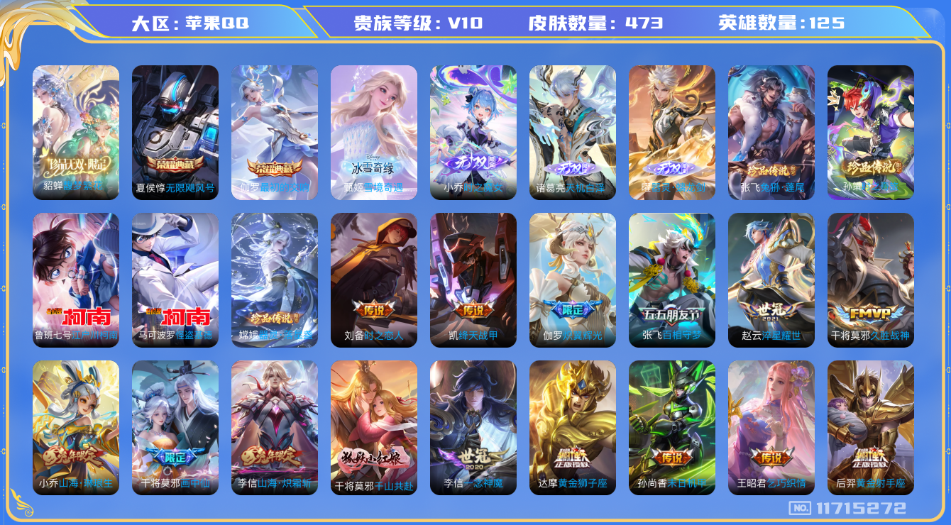 [11715272]V10 2典藏 1珍品无双 3无双 5珍品传说 54传说 125英雄 452皮肤 可修改实名 女号 荣耀水晶:最初的交响(伽罗典藏),无限飓风号(高达) 无双皮:雪境奇遇-甄姬,器灵·螭龙剑,小乔时之魔女(小乔无双) 珍品传说:江户川柯南,怪盗基德,时之奇旅-孙策,器灵·落星盏,兔狲·蓬尾 传说皮:牧神诗旅,祥瑞亨通,千劫归真,星之鸣奏,幻光神枪,玄雷天君,山海·炽霜斩(李信年限),山海·琳琅生(小乔年限),黄金狮子座,黄金射手座,黄金白羊座,零号·赤焰,地狱火,地狱之眼,末日机甲-孙尚香(绿蚂蚱),一念神魔,淬星耀世,冠军飞将,久胜战神,无双飞将,乞巧织情,绛天战甲(鸡嘴战神),超时空战士-狄仁杰,碎云,山海·苍雷引(电光曜子),炽翼辉光(娃娃菜牛角包),画中仙,浮生妄,百相守梦(张飞),妄想实况,妄想奇谈,艾琳觅芳踪 珍宝阁皮:蔷薇恋人,玩趣恶龙 限定皮:愿照·九州拓(澜年限),愿照·岁时盈(虞姬年限),愿照·山河定(司空震年限),愿照·千秋盛(女娲年限),逐霄战戟,映山客,陌上桑,鸣野蒿,夏侯惇霜北刀,至尊宝,白虎志(电光耗子),凤求凰(白切鸡),凤凰于飞,太华(伽罗年限),武陵仙君(小桃花),绯月行,神威(电光马子),飞衡(韩信年限),山海·碧波行(瑶年限),无限倾心-项羽,瑞麟志(木兰年限),至美·乘鲤谣,遇见飞天,诗剑行,齐天大圣,怒海麟威,降魔,五谷丰年,青龙志(铠年限),冰锋战神,幽恒(沐浴露),武圣,游园惊梦,梁祝,天狼狩猎者,逐梦之翼,逐梦之星,烈魂,岱宗(典韦年限),逐梦之音,天狼征服者,祈雪灵祝(雪兔子),李小龙,逐梦之影,逐梦之光,玄武志(苏烈年限),朱雀志(守约年限),永曜之星,辉光之辰,如梦令-嫦娥,如梦令-后羿,霸王别姬-项羽,霸王别姬-虞姬,奇迹圣诞,一生所爱,大圣娶亲,引擎之心,天魔缭乱,青春决赛季,冰霜恋舞曲,云端筑梦师,蜜橘之夏,热情桑巴,美猴王,启示之音,匿光启智者,神器·万象笔,梦圆繁星,山海·玄木吟(马可年限),冰霜神祇 史诗皮:狼魂孤将,百相守梦-百里守约,星界战将,茶境仙,飞车小橘子,苍鳞隐世,器灵·浮梦炉,糖绘人间,星界特工,瑰影绮梦,化蝶舞,鸭鸭历险记-刘禅,灵蛊蚀心,龙之律动,雪豹·霜爪,藏狐·褐绒,谪仙醉月,炽弈燎原,撼地雄心,蔬乡物语(鲁班七号),破空之剑,绮世丹青,石田雨龙,百相守梦-周瑜,紫霞仙子,