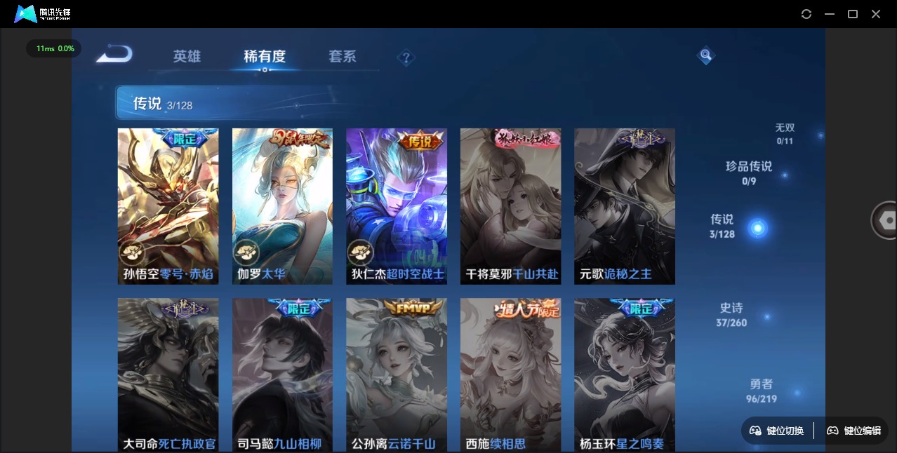 - [10992412]V7 1典藏 1珍品传说 4传说 122英雄 205皮肤 可修改实名 优质装备:拾光映像(瑶典藏),猫影幻舞,地狱火 珍品传说:时之奇旅-孙策 传说皮:典韦战鼓燎原 珍宝阁皮:妄想食味 限定皮:鸣野蒿,梅西,遇见飞天,梁祝,天狼溯光者,李小龙,大圣娶亲 史诗皮:器灵·浮梦炉,化蝶舞,龙之律动,石田雨龙,茶境仙,百相守梦-百里守约,苍穹之光,黄金分割率,特工魅影,千年之狐,龙骑士(小龙虾),末日机甲-吕布,修罗,女仆咖啡,摇滚巨星,水果甜心,星夜王子,德古拉伯爵,暗隐猎兽者,幽灵船长,鬼剑武藏,心灵战警,乐园奇幻夜,天秀·启明,地狱岩魂,纤云弄巧,缤纷独角兽,月团寄思,水晶猎龙者,曙光守护者,金属风暴,圣诞狂欢,圣诞恋歌,鹰眼统帅,魅力维加斯,未来纪元-赵云