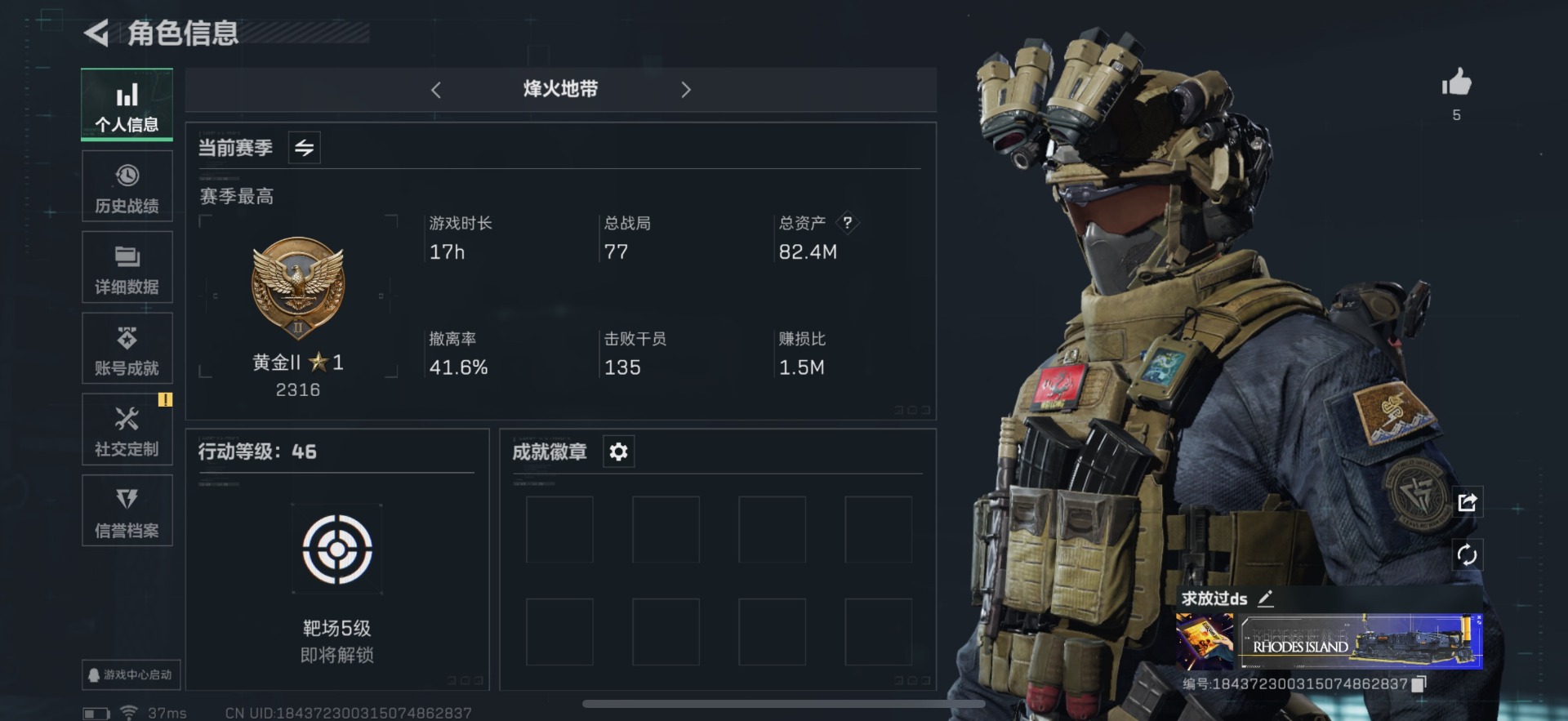 - [11653623]总资产:41.3M 1近战传说 12传说枪械 哈夫币:1.056K 高级安全箱(9.16到期) 可二次 可修改实名 优质装备:近战-北极星 烽火地带段位:钻石 全面战场段位:无段位 传说武器皮肤:UZI冲锋枪-特斯拉线圈,AWM狙击步枪-捞点薯条,93R-捞点薯条,AK-12突击步枪-特斯拉线圈,勇士冲锋枪-能天使-午夜邮差,Vector冲锋枪-能天使-午夜邮差,复合弓-黑-天际线,K437突击步枪-北极星,QCQ171冲锋枪-北极星,725双管霰弹枪-送葬人-无题密令,M4A1突击步枪-阿米娅 史诗武器皮肤:QJB201轻机枪-Old Habits,SG552突击步枪-深海恐惧,M16A4突击步枪-竞赛选手,SV-98狙击步枪-林中猎手,SV-98狙击步枪-囚徒,腾龙突击步枪-无垢,MP7冲锋枪-无垢,PSG-1射手步枪-无垢,SVD狙击步枪-荒野求生