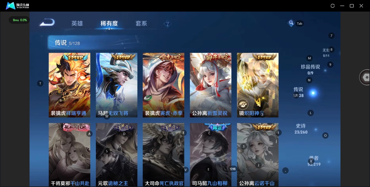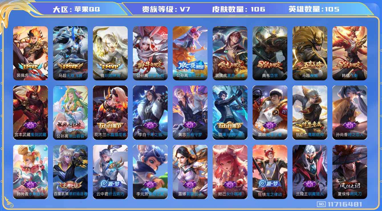 - [12197876]V7 1典藏 1无双 8传说 124英雄 172皮肤 可修改实名 优质装备:鸣剑·曳影,器灵·螭龙剑,一念神魔,地狱之眼,澜逐花归海,琥珀纪元马超 传说皮:乘龙·铭钟鼎(赵云年限) 珍宝阁皮:蔷薇恋人 限定皮:愿照·山河定(司空震年限),白虎志(电光耗子),五谷丰年,李小龙,逐梦之影,寅虎·赤拳(老虎年限) 史诗皮:苍鳞隐世,器灵·浮梦炉,糖绘人间,龙之律动,琥珀纪元伽罗,茶境仙,百相守梦-黄忠,谪仙醉月,星界特工,东方月初,蔬乡物语(鲁班七号),紫霞仙子,苍穹之光,黄金分割率,特工魅影,千年之狐,高渐离燃音魔法,偶像歌手,暗夜猫娘,修罗,女仆咖啡,摇滚巨星,水果甜心,星夜王子,功夫厨神,德古拉伯爵,暗隐猎兽者,幽灵船长,鬼剑武藏,心灵战警,纤云弄巧,乘风破浪,曙光守护者,原初追逐者,圣诞狂欢,鹰眼统帅,魅力维加斯,雪上飞焰,未来纪元-赵云