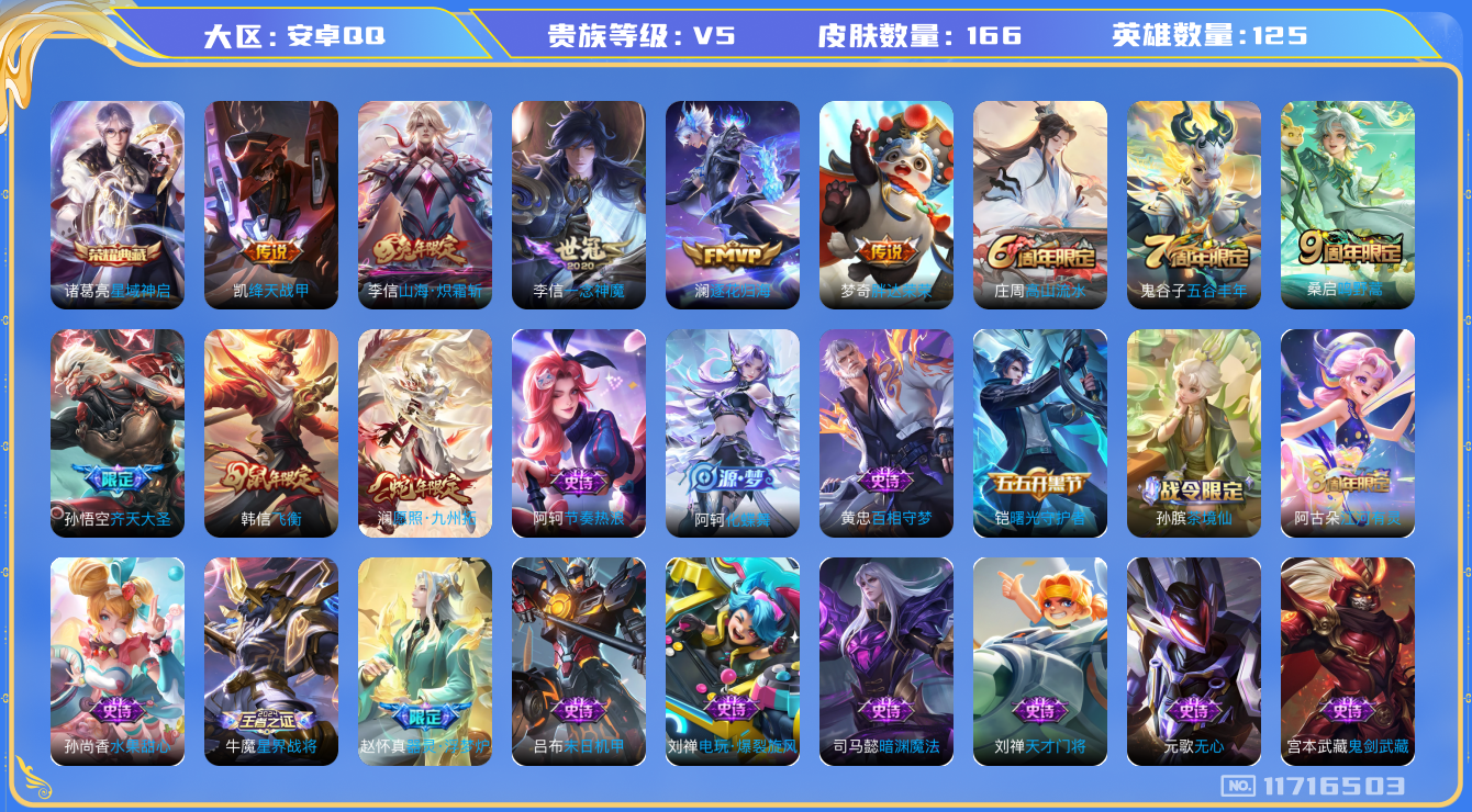 [11716503]V5 1典藏 8传说 125英雄 166皮肤 可修改实名 优质装备:星域神启(倪克斯贼亮),绛天战甲(鸡嘴战神),一念神魔,胖达荣荣,山海·炽霜斩(李信年限),澜逐花归海 珍宝阁皮:妄想食味,女武神 限定皮:愿照·九州拓(澜年限),鸣野蒿,飞衡(韩信年限),高山流水,齐天大圣,五谷丰年 史诗皮:赞萌露比,器灵·浮梦炉,化蝶舞,星界战将,谪仙醉月,茶境仙,破空之剑,蒙犽顽岩魄,百相守梦-黄忠,特工魅影,千年之狐,江河有灵,冰冠公主,电玩·爆裂旋风,末日机甲-吕布,节奏热浪,女仆咖啡,水果甜心,天才门将,功夫厨神,暗隐猎兽者,鬼剑武藏,暗渊魔法,纤云弄巧,逐浪之夏,水晶猎龙者,曙光守护者,金属风暴,原初追逐者,鹰眼统帅,魅力维加斯,无心