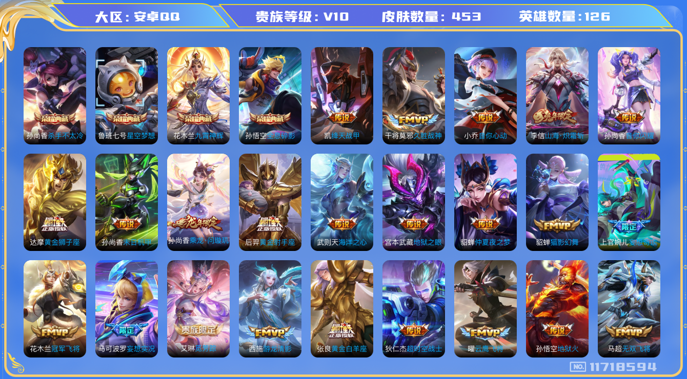[11718594]V10 4典藏 44传说 126英雄 453皮肤 典藏英雄武则天 可修改实名 优质装备:星空梦想(太空人),杀手不太冷,全息碎影(猴子典藏),九霄神辉(木兰典藏),黄金狮子座,黄金射手座,冠军飞将,云鹰飞将(小将军),绛天战甲(鸡嘴战神),黄金白羊座,猫影幻舞,久胜战神,云霓雀翎,末日机甲-孙尚香(绿蚂蚱),地狱火,仲夏夜之梦(大飞蛾),音你心动-小乔,海洋之心,地狱之眼,飞鸢探春,游龙清影(小青龙),超时空战士-狄仁杰,无双飞将,音你闪耀(rap皮),山海·炽霜斩(李信年限),妄想实况,妄想奇谈,鹤归松栖(云缨),澜逐花归海,艾琳觅芳踪 传说皮:乘龙·问璇玑(孙尚香年限),貂蝉曦玄引 珍宝阁皮:妄想食味,优雅恋人,蔷薇恋人,玩趣恶龙 限定皮:鸣野蒿,至尊宝,白虎志(电光耗子),凤求凰(白切鸡),凤凰于飞,太华(伽罗年限),梅西,武陵仙君(小桃花),异界灵契(白毛香),傲雪梅枪,时之彼端,白晶晶,时雨天司(水龙头),飞衡(韩信年限),瑞麟志(木兰年限),遇见飞天,高山流水,诗剑行,匿光决锋者,怒海麟威,五谷丰年,青龙志(铠年限),冰锋战神,天狼运算者,游园惊梦,梁祝,御风骁将(吕布年限),天狼狩猎者,龙胆,逐梦之翼,逐梦之星,烈魂,岱宗(典韦年限),天狼溯光者,逐梦之音,天狼征服者,奔雷神使(牛魔年限),祈雪灵祝(雪兔子),天狼绘梦者,李小龙,逐梦之影,逐梦之光,玄武志(苏烈年限),朱雀志(守约年限),永曜之星,辉光之辰,如梦令-嫦娥,如梦令-后羿,圣诞老人,奇迹圣诞,默契交锋-兰陵王,默契交锋-花木兰,一生所爱,大圣娶亲,引擎之心,天魔缭乱,青春决赛季,冰霜恋舞曲,云端筑梦师,乒乒小将,蜜橘之夏,热情桑巴,神奇女侠,启示之音,深海之息(深海大菠萝),唐三藏,神器·万象笔 史诗皮:灵蛊蚀心,星界战将,石田雨龙,蒙犽顽岩魄,乘龙·聚宝船(安琪拉年限),百相守梦-黄忠,遇见神鹿,紫霞仙子,苍穹之光,电玩小子(小书包),白龙吟,黄金分割率,特工魅影,千年之狐,永昼,江河有灵,鹤归松栖(赵怀真),雪夜绮愿(周瑜),魅语,百解令(蒙犽),高渐离燃音魔法,蒙恬荣光圣徽,无限星赏官,匿光破解者,冰冠公主,偶像歌手,晚萤,电玩·爆裂旋风,暗夜猫娘,龙骑士(小龙虾),末日机甲-吕布,猫狗日记-孙策,猫狗日记-大乔,时之恋人-孙尚香,乱世虎臣,节奏热浪,女仆咖啡,摇滚巨星,水果甜心,