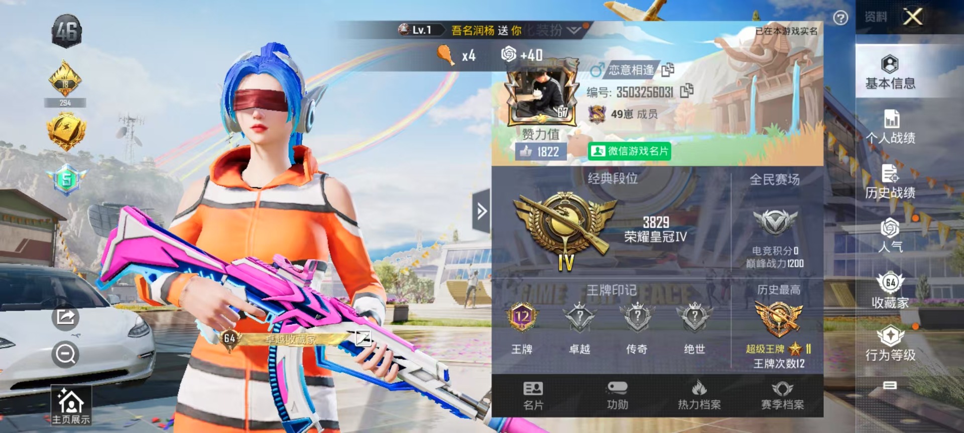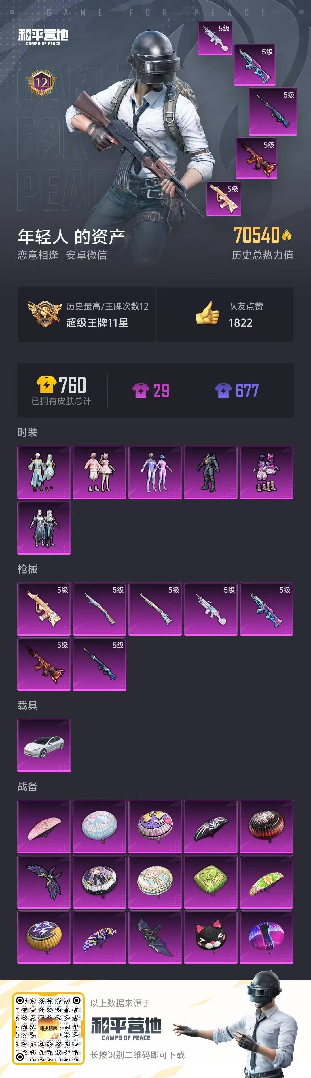 [11723750]6粉装 7特效枪 1载具 12印记 可二次 安全保护中 身法装备:都市猎人,舞王派对(派对舞王、小金鞋),暗影哥特(红眼罩) 热门装扮:梦幻火箭(新101)(新火箭少女101粉色套装),吟月归客,蓝莓炮弹,复仇流浪者,彩虹甜喵,金丰海韵,奶芙汪汪,激萌罗小黑,恶魔喵喵,呆萌铁蟹,深海小丑鱼,都市猎人,派对舞王(小金鞋) 载具:特斯拉Model 3(珍珠白) 稀有枪皮:Kar98K-巳巳如意,AUG-暖羊咩咩,M416风花雪月,AKM梦之光华,SLR暗夜玫瑰,M249彩虹甜喵(M249-彩虹甜喵),Kar98K未来歌姬 五级特效枪:五级AKM-梦之光华,五级Kar98K-巳巳如意,五级AUG-暖羊咩咩,五级Kar98K-未来歌姬,五级SLR-暗夜玫瑰,五级M416-风花雪月,五级M249-彩虹甜喵 紫色装扮:大橘大利,耀粉歌者,SS10特训,机械征服者,智慧之神,科技之星,冰爽海盐,治愈之星,SS14特训,萌趣颜团子,特种颜团子,SS12特训,镭射皇者,银白舞王,SS13特训,SS9特训,照水倚天,田园牧歌,轻风白浪,和煦暖阳,俏皮奶喵,暖心橘喵,SS21特训,娇憨猪猪,萌趣咩咩,SS22特训,猎梦纪元,SS33特训套装,SS23特训,SS20特训,虚音幻奏,冰爽风暴,瑞龙福将,团圆交子,SS17特训,SS16特训,暴风机械师,青春冒险家,潮流游乐家,SS15特训,时空追击者,甜心亚梦,军刀雅典娜,极速竞梦,SS19特训,音速流光,异彩先驱,SS18特训,飞驰魅影,水晶王族,智慧隐士,浓情蜜辣,Alan Walker,SS27特训,SS28特训,SS29特训,SS25特训,SS24特训(SS24特训套装),SS26特训,小丑鱼,浪漫天命,粉红小猪,青玉碎影,萌黄之夏,SS32特训服(SS32特训套装),恋语绒绒,贵族骑装,光之冒险,蜜桃派对,街头风暴,临安公主,竞技名士,暗影哥特(红眼罩),星途旅人,智谋强哥,白糯汤圆,鱼渊荷华,玉兔迎春,燕燕于飞,巳巳如意,森林游猎者 优质战备:炙焰牛王降落伞,恐龙拽拽降落伞,筑梦精灵降落伞,临安公主降落伞,星夜魔法师降落伞,彩虹甜喵降落伞,飞行翼-星夜魔法师,闪光银龙降落伞,百万伏特降落伞,梦幻火箭降落伞,炫紫旋律降落伞,神秘黑猫降落伞,飞行器-古堡领主,王牌四分卫降落伞,碧影闪光降落伞