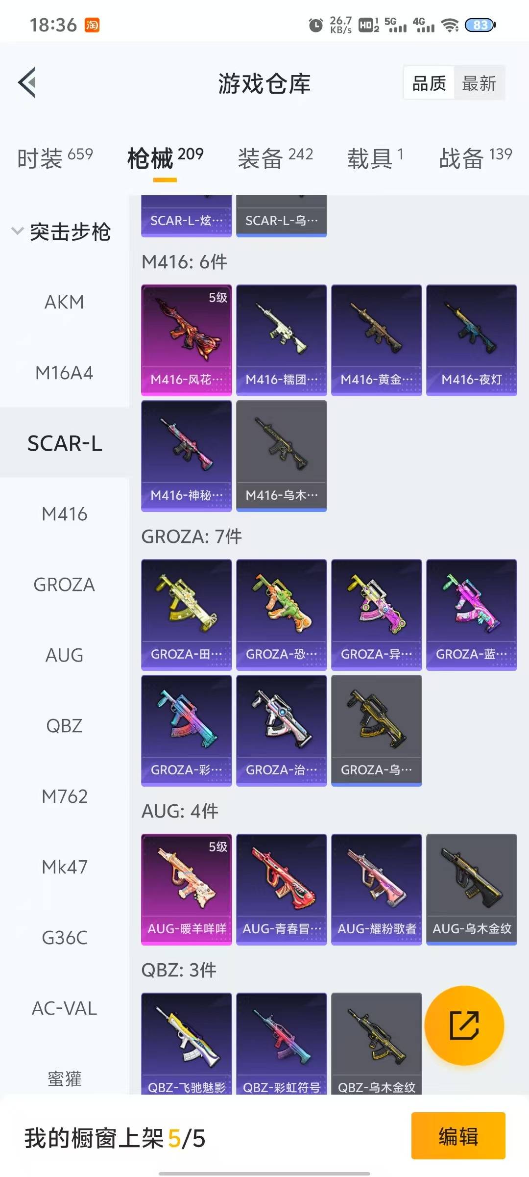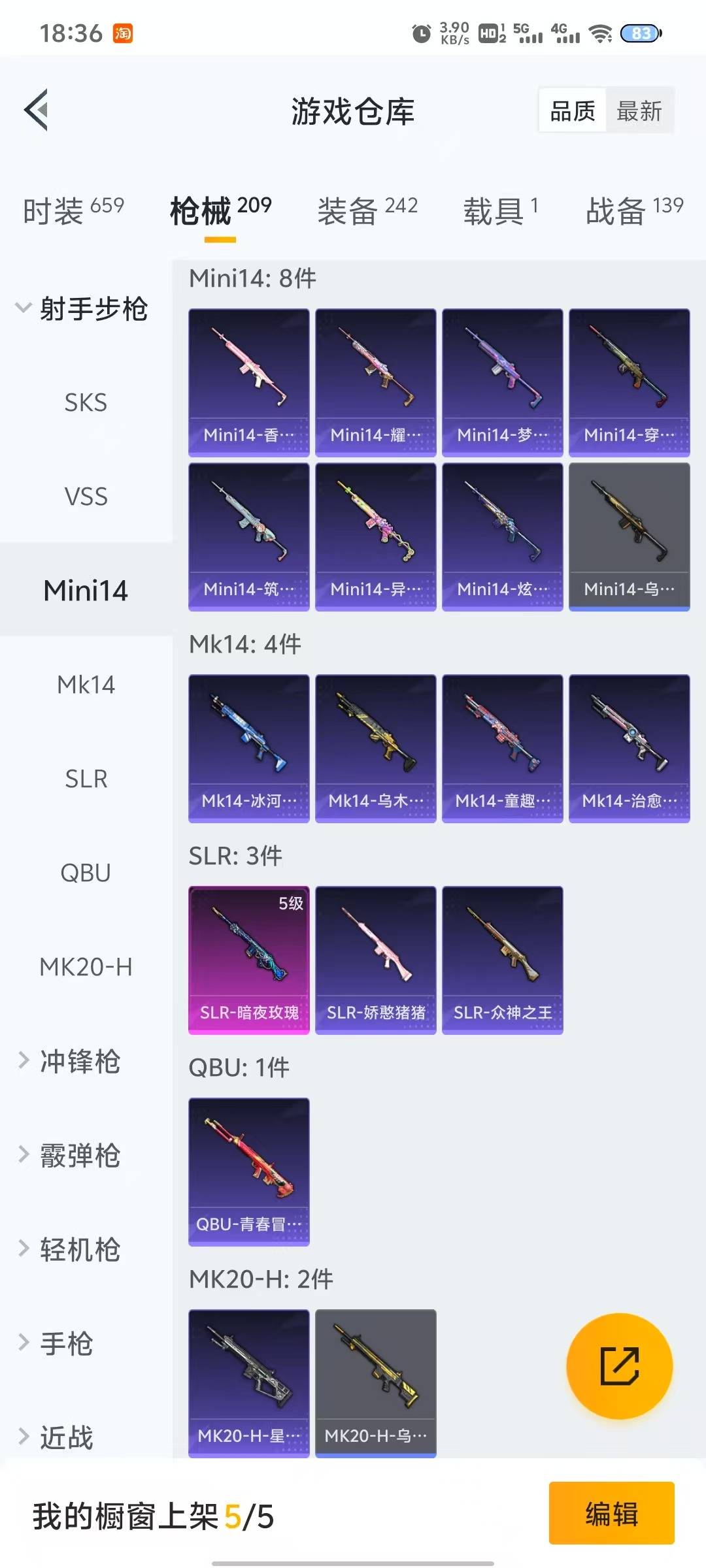 AKM-梦之光华,M416-风花雪月,AUG-暖羊咩咩,Kar98K-未来歌姬,Kar98K-巳巳如意,SLR-暗夜玫瑰,M249-彩虹甜喵