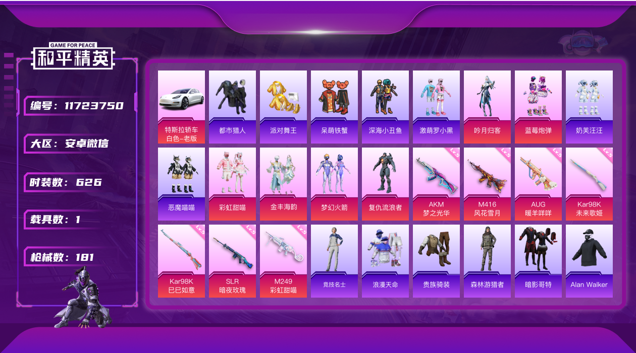 [11723750]6粉装 7特效枪 1载具 12印记 可二次 安全保护中 身法装备:都市猎人,舞王派对(派对舞王、小金鞋),暗影哥特(红眼罩) 热门装扮:梦幻火箭(新101)(新火箭少女101粉色套装),吟月归客,蓝莓炮弹,复仇流浪者,彩虹甜喵,金丰海韵,奶芙汪汪,激萌罗小黑,恶魔喵喵,呆萌铁蟹,深海小丑鱼,都市猎人,派对舞王(小金鞋) 载具:特斯拉Model 3(珍珠白) 稀有枪皮:Kar98K-巳巳如意,AUG-暖羊咩咩,M416风花雪月,AKM梦之光华,SLR暗夜玫瑰,M249彩虹甜喵(M249-彩虹甜喵),Kar98K未来歌姬 五级特效枪:五级AKM-梦之光华,五级Kar98K-巳巳如意,五级AUG-暖羊咩咩,五级Kar98K-未来歌姬,五级SLR-暗夜玫瑰,五级M416-风花雪月,五级M249-彩虹甜喵 紫色装扮:大橘大利,耀粉歌者,SS10特训,机械征服者,智慧之神,科技之星,冰爽海盐,治愈之星,SS14特训,萌趣颜团子,特种颜团子,SS12特训,镭射皇者,银白舞王,SS13特训,SS9特训,照水倚天,田园牧歌,轻风白浪,和煦暖阳,俏皮奶喵,暖心橘喵,SS21特训,娇憨猪猪,萌趣咩咩,SS22特训,猎梦纪元,SS33特训套装,SS23特训,SS20特训,虚音幻奏,冰爽风暴,瑞龙福将,团圆交子,SS17特训,SS16特训,暴风机械师,青春冒险家,潮流游乐家,SS15特训,时空追击者,甜心亚梦,军刀雅典娜,极速竞梦,SS19特训,音速流光,异彩先驱,SS18特训,飞驰魅影,水晶王族,智慧隐士,浓情蜜辣,Alan Walker,SS27特训,SS28特训,SS29特训,SS25特训,SS24特训(SS24特训套装),SS26特训,小丑鱼,浪漫天命,粉红小猪,青玉碎影,萌黄之夏,SS32特训服(SS32特训套装),恋语绒绒,贵族骑装,光之冒险,蜜桃派对,街头风暴,临安公主,竞技名士,暗影哥特(红眼罩),星途旅人,智谋强哥,白糯汤圆,鱼渊荷华,玉兔迎春,燕燕于飞,巳巳如意,森林游猎者 优质战备:炙焰牛王降落伞,恐龙拽拽降落伞,筑梦精灵降落伞,临安公主降落伞,星夜魔法师降落伞,彩虹甜喵降落伞,飞行翼-星夜魔法师,闪光银龙降落伞,百万伏特降落伞,梦幻火箭降落伞,炫紫旋律降落伞,神秘黑猫降落伞,飞行器-古堡领主,王牌四分卫降落伞,碧影闪光降落伞