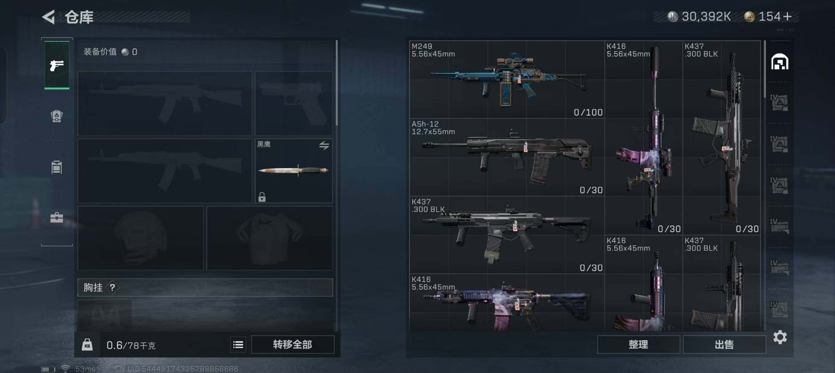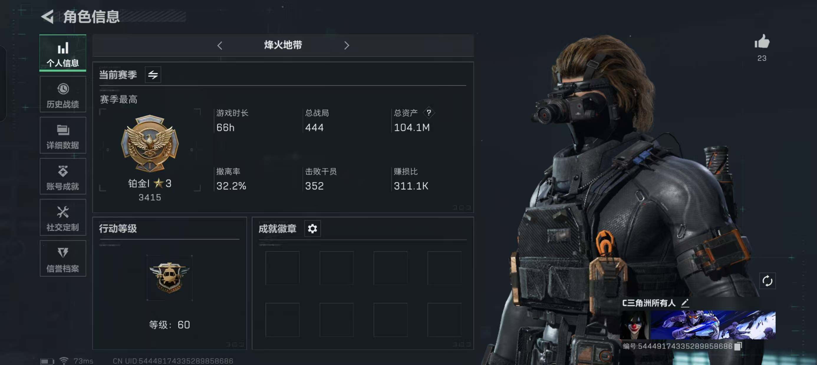 [11726658]总资产104.1M,哈夫币3039w,枪皮数量91,战场等级:50 将军,行动等级:60铂金,近战-黑鹰,安全箱等时效性道具请以游戏内数据为准-S62