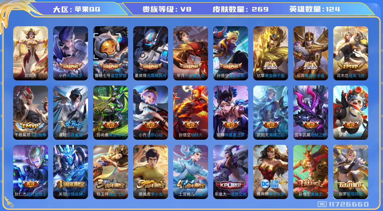 [11726660]【商品标题】:苹果Q-V8-最强王者段位-124英雄-269皮肤-5典藏-0珍品无双-0无双-0珍品传说-14传说-63史诗
