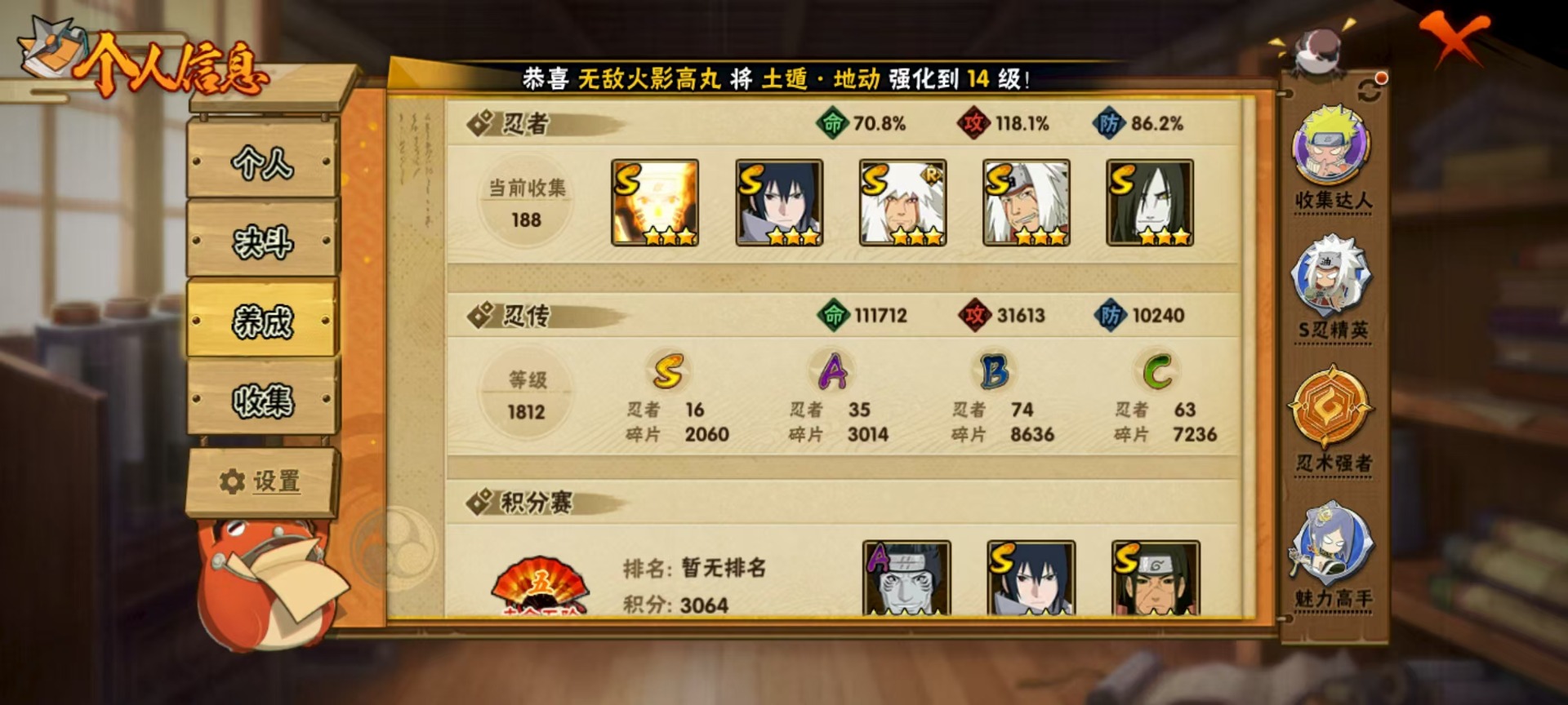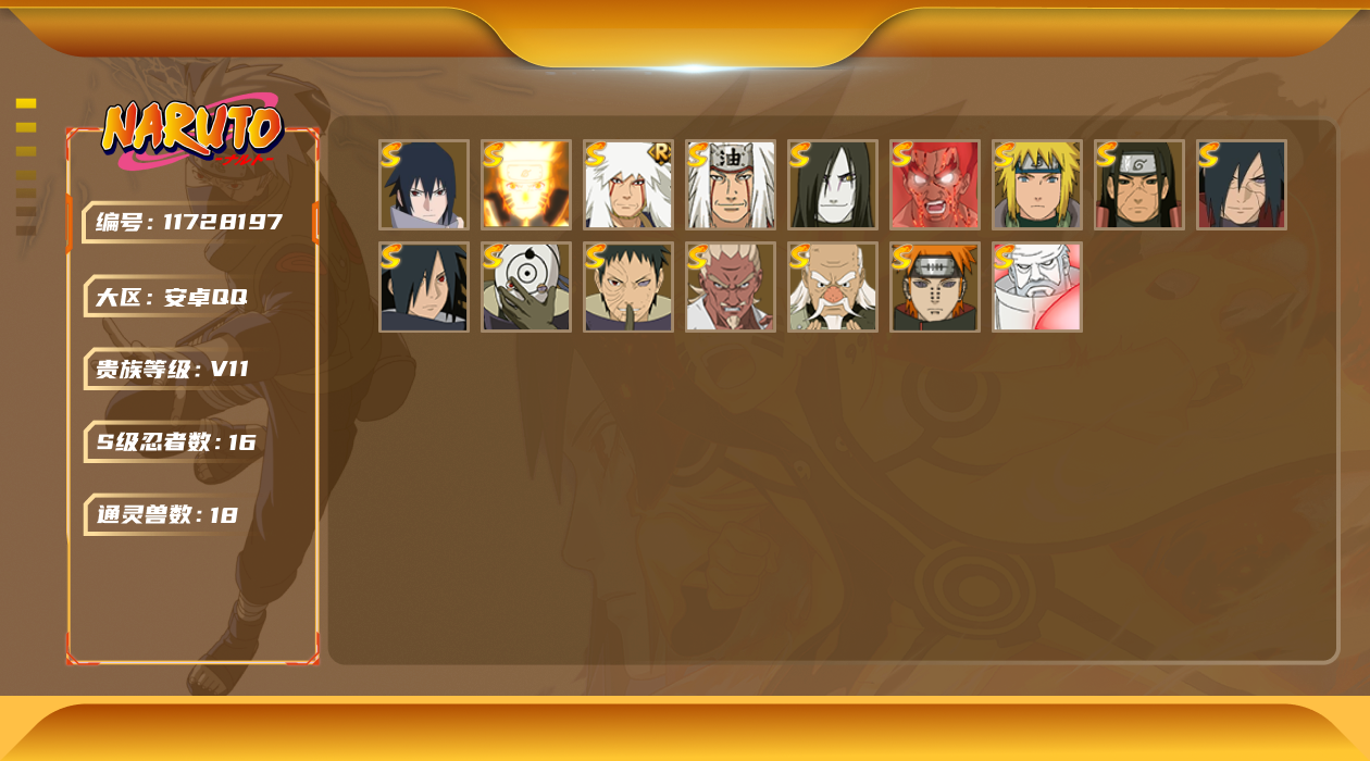 [11728197]V11 16S忍 35A忍 18通灵 909.3W战力 可二次 优质装备:熊猫,千手柱间「秽土转生」,宇智波斑 「木叶创立」,迈特凯「死门」,宇智波带土 「忍界大战」,“宇智波斑” 「白面具」,漩涡鸣人 「九喇嘛连结」,大筒木金式「博人传」,宇智波佐助「永恒万花筒」,宇智波斑「秽土转生·解」,艾「忍界大战」 S级忍者:大野木 「忍界大战」,自来也 「舞之豪杰」,佩恩「天道」,波风水门,大蛇丸,自来也
