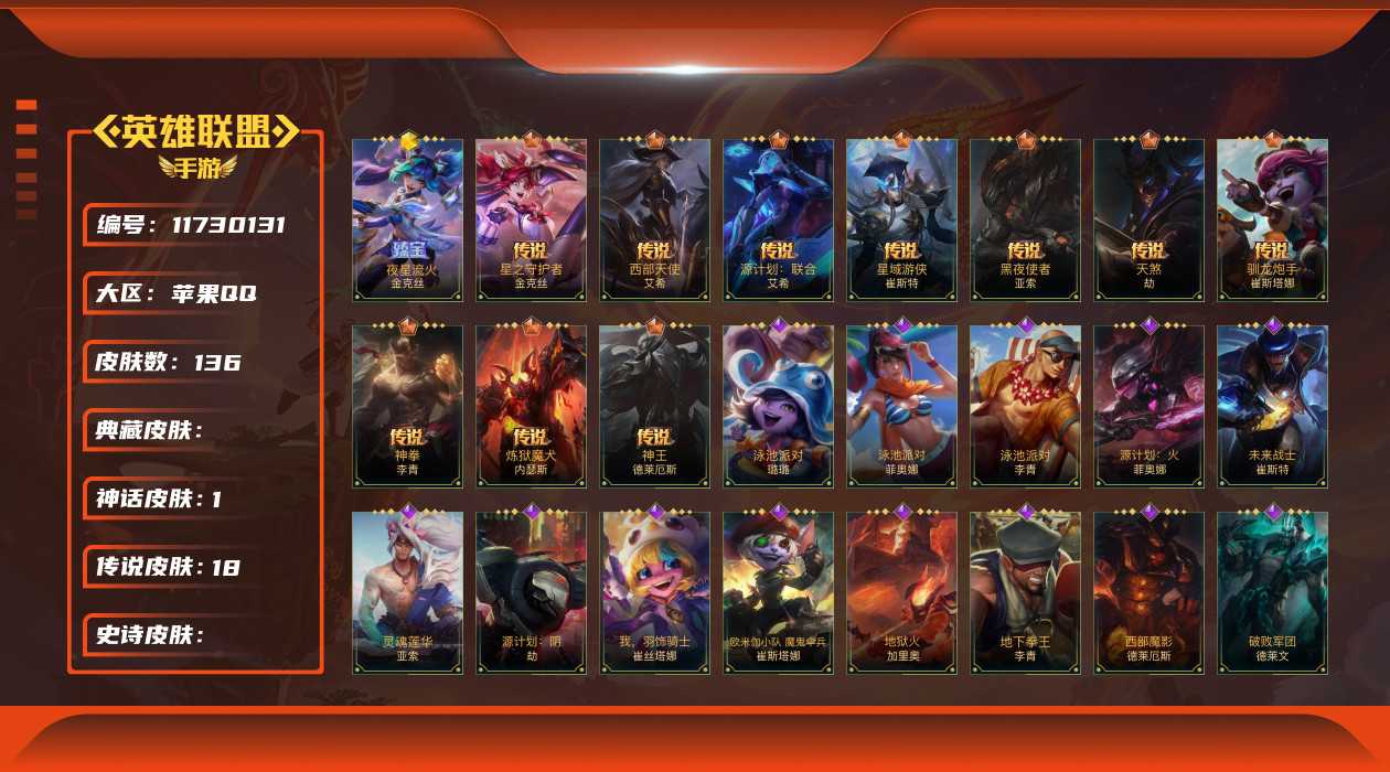 [11730131]可二次 可修改实名 1神话 18传说 51史诗 136皮肤 109英雄 大师 皮肤:菲奥娜-绯金丽刃,菲奥娜-泳池派对,菲奥娜-皇家守卫,菲奥娜-源计划:火,金克丝-夜星流火,金克丝-星之守护者,金克丝-末路狂花,金克丝-光耀之芒,艾希-王牌司令,艾希-西部天使,艾希-极地女神,艾希-源计划:联合,崔斯特-王牌舰长,崔斯特-星域游侠,崔斯特-未来战士,崔斯特-地底世界,璐璐-光耀之灵,璐璐-邪恶女巫,璐璐-泳池派对,亚索-灵魂莲华,亚索-西部牛仔,亚索-黑夜使者,劫-天煞,劫-冲击之刃,劫-源计划:阴,崔丝塔娜-我,羽饰骑士,崔丝塔娜-欧米伽小队 魔鬼伞兵,崔丝塔娜-驯龙炮手,加里奥-冠翎巨神像,加里奥-地狱火,加里奥-风执事,李青-地下拳王,李青-泳池派对,李青-神拳,内瑟斯-单身贵族,内瑟斯-创世魔神,内瑟斯-炼狱魔犬,德莱厄斯-西部魔影,德莱厄斯-热血班长,德莱厄斯-神王,德莱文-绯金战斧,德莱文-破败军团